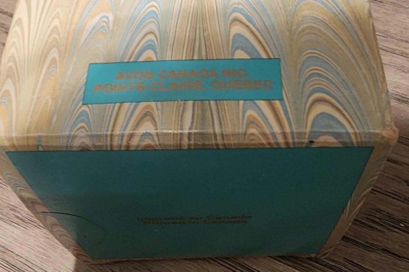 Packaged in its original marble aqua and gold box, this piece was part of Avon’s mid-century vanity collection and doubles as both a decorative bud vase and display collectible.