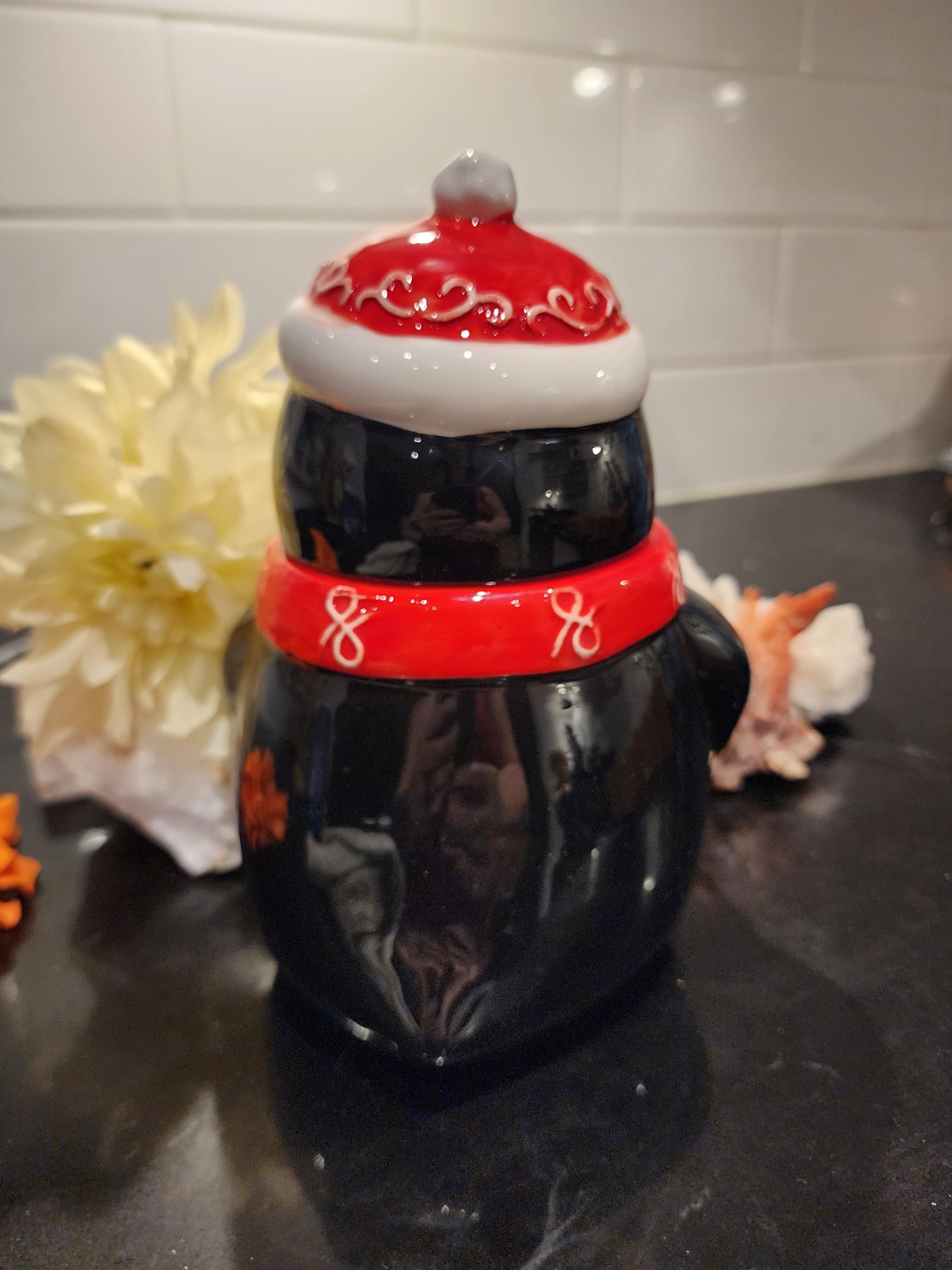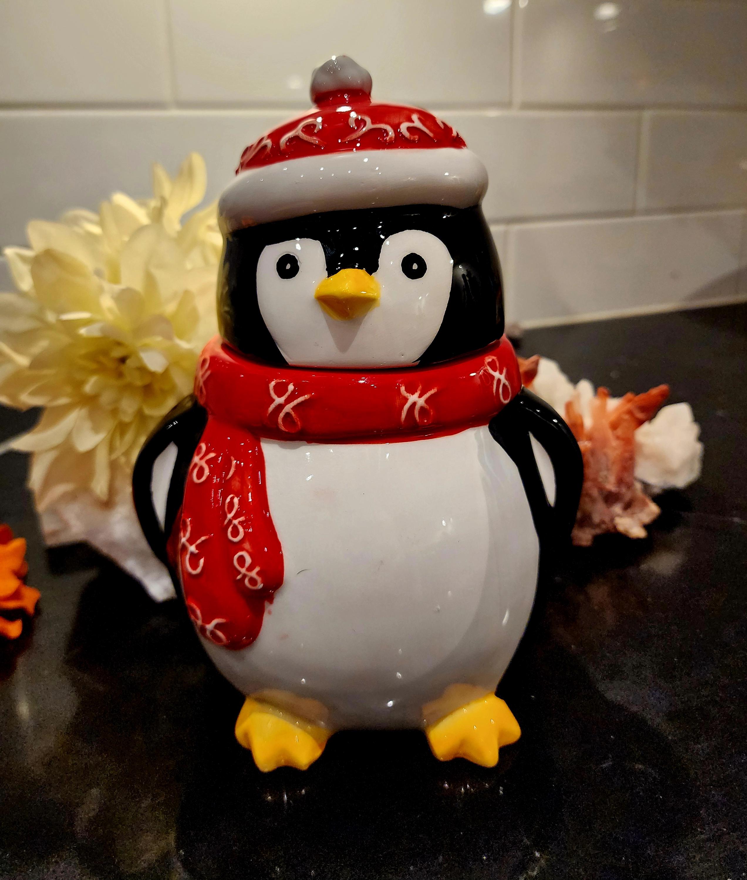 Crafted from high-quality glazed ceramic, this cheerful penguin wears a bright red hat and scarf with white swirl detailing. The removable head fits securely with a tight rubber seal, keeping your cookies and treats fresh and delicious.
