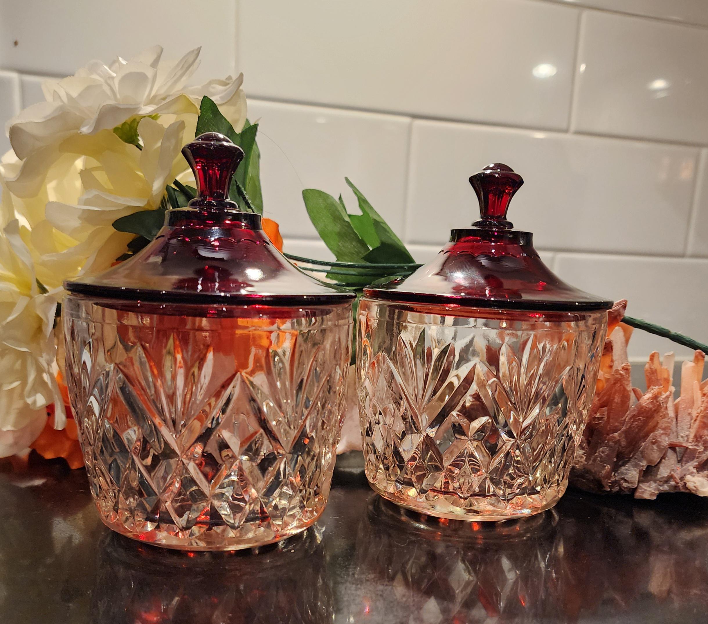 Add a little vintage sparkle to your space with this pair of ruby red glass jam jars — beautifully made by Indiana Glass Co. in the 1960s–1970s.