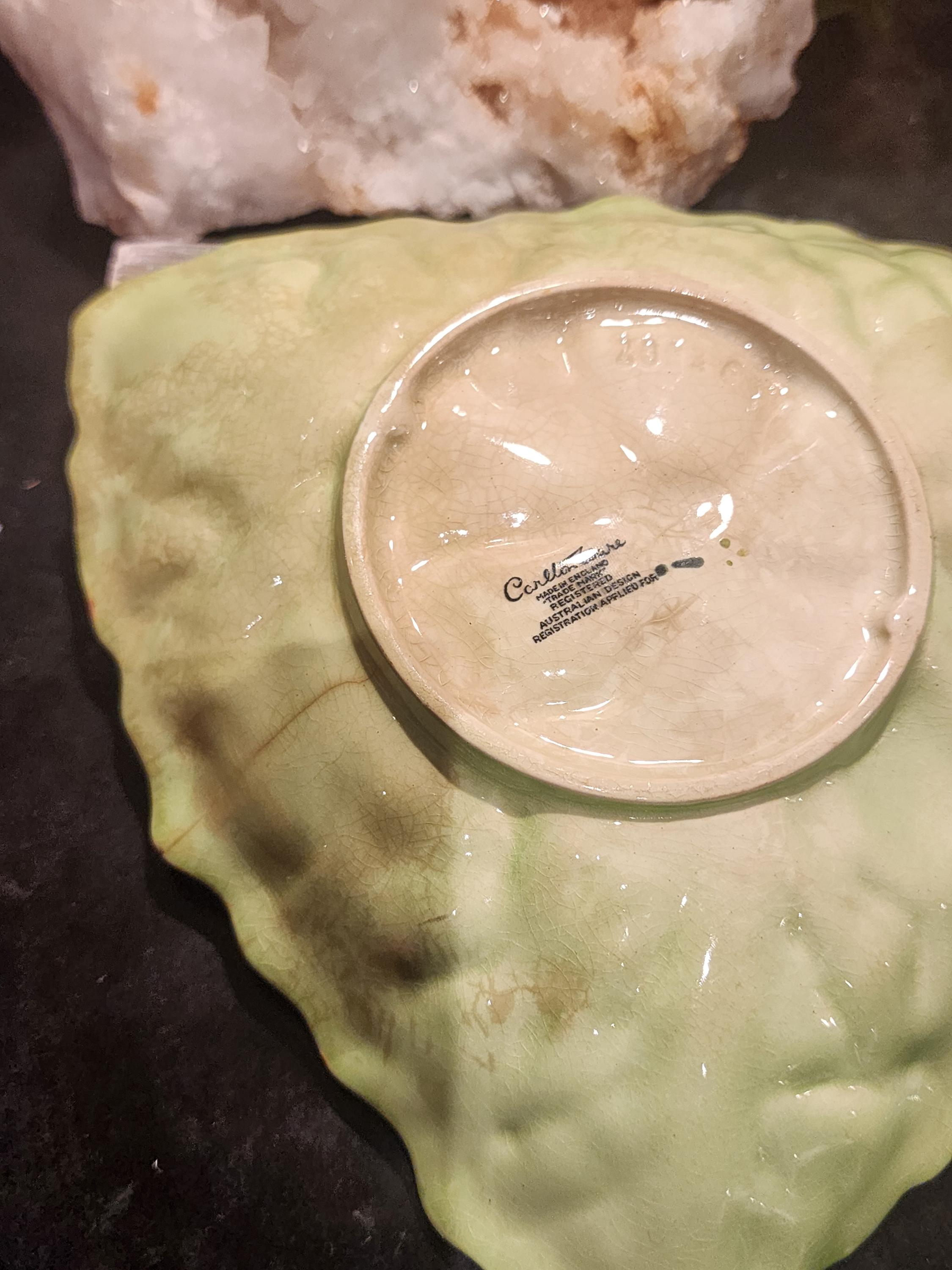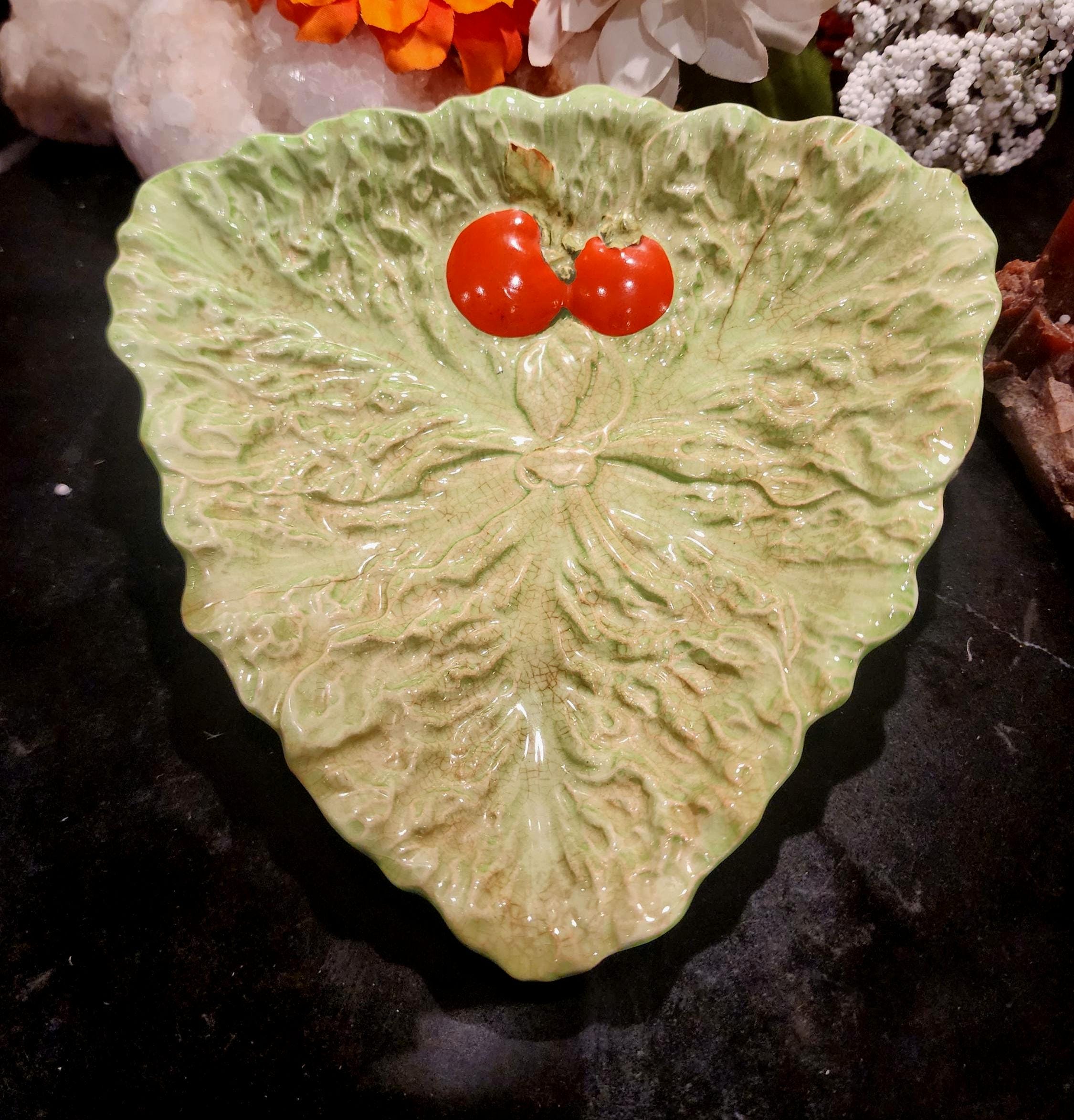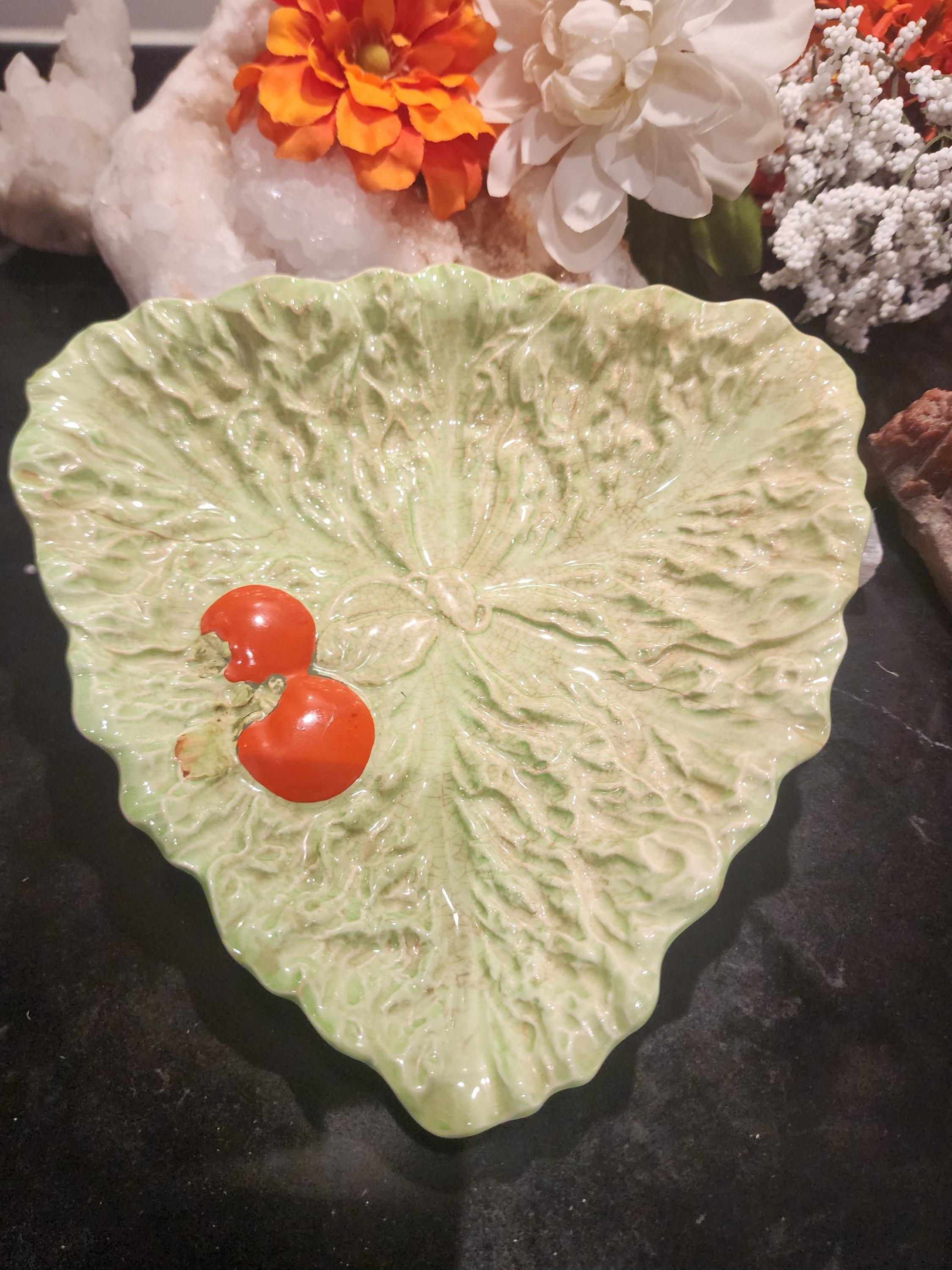 Aged to perfection 🌿 This stunning Carlton Ware lettuce leaf dish features rich green tones, bright red tomatoes, and a glossy glaze that’s beautifully crazed with age — a true mark of authentic mid-century English pottery.