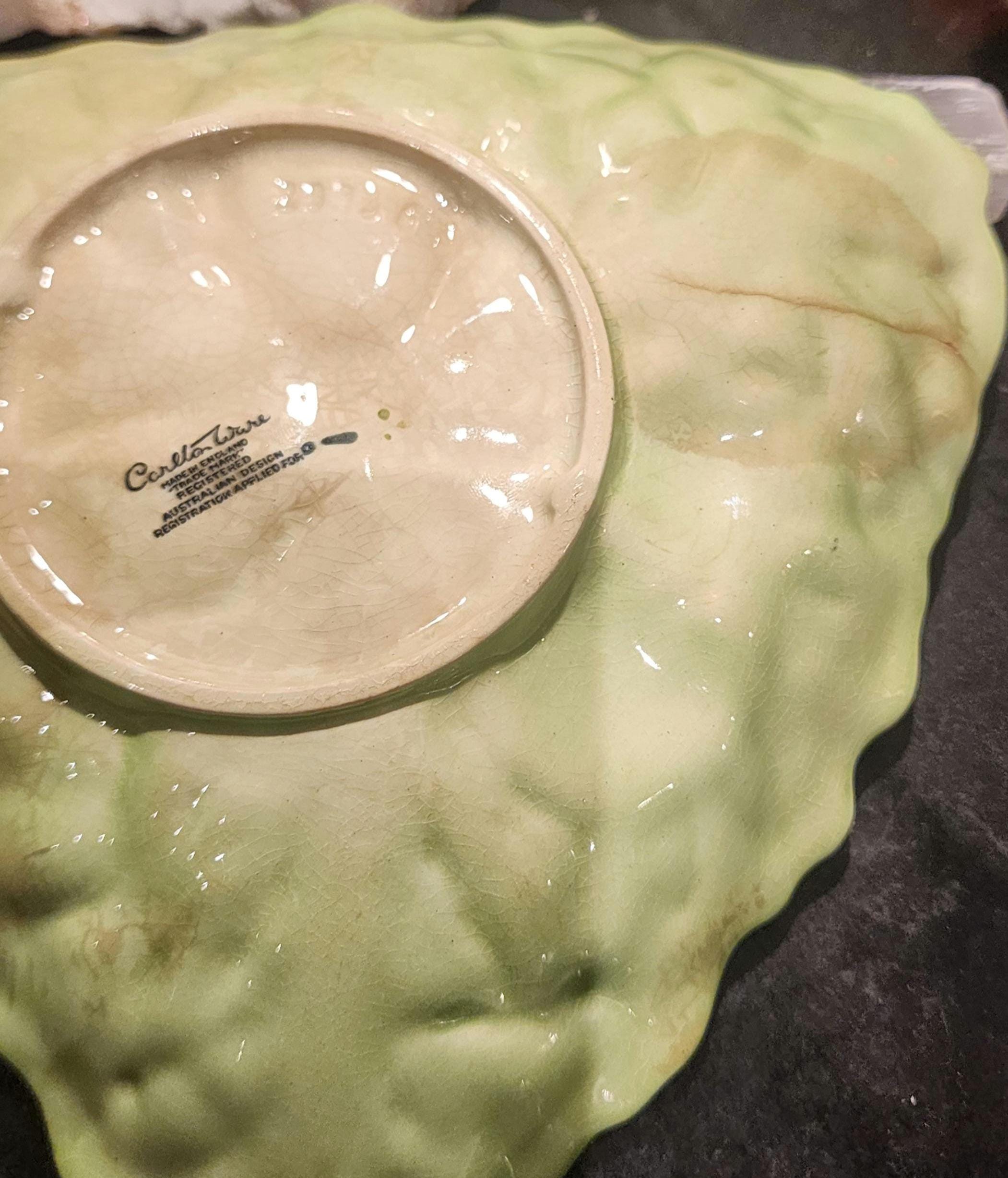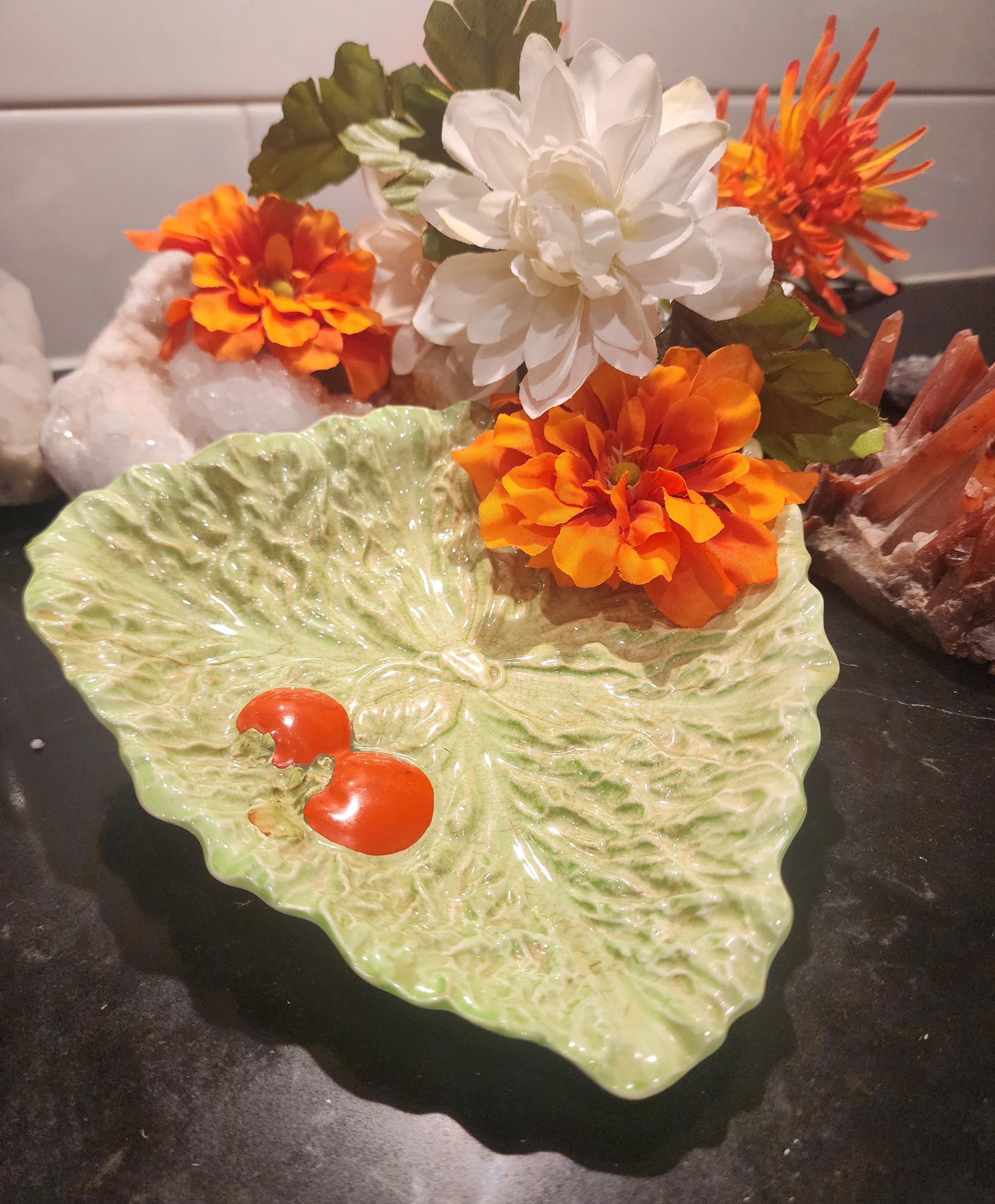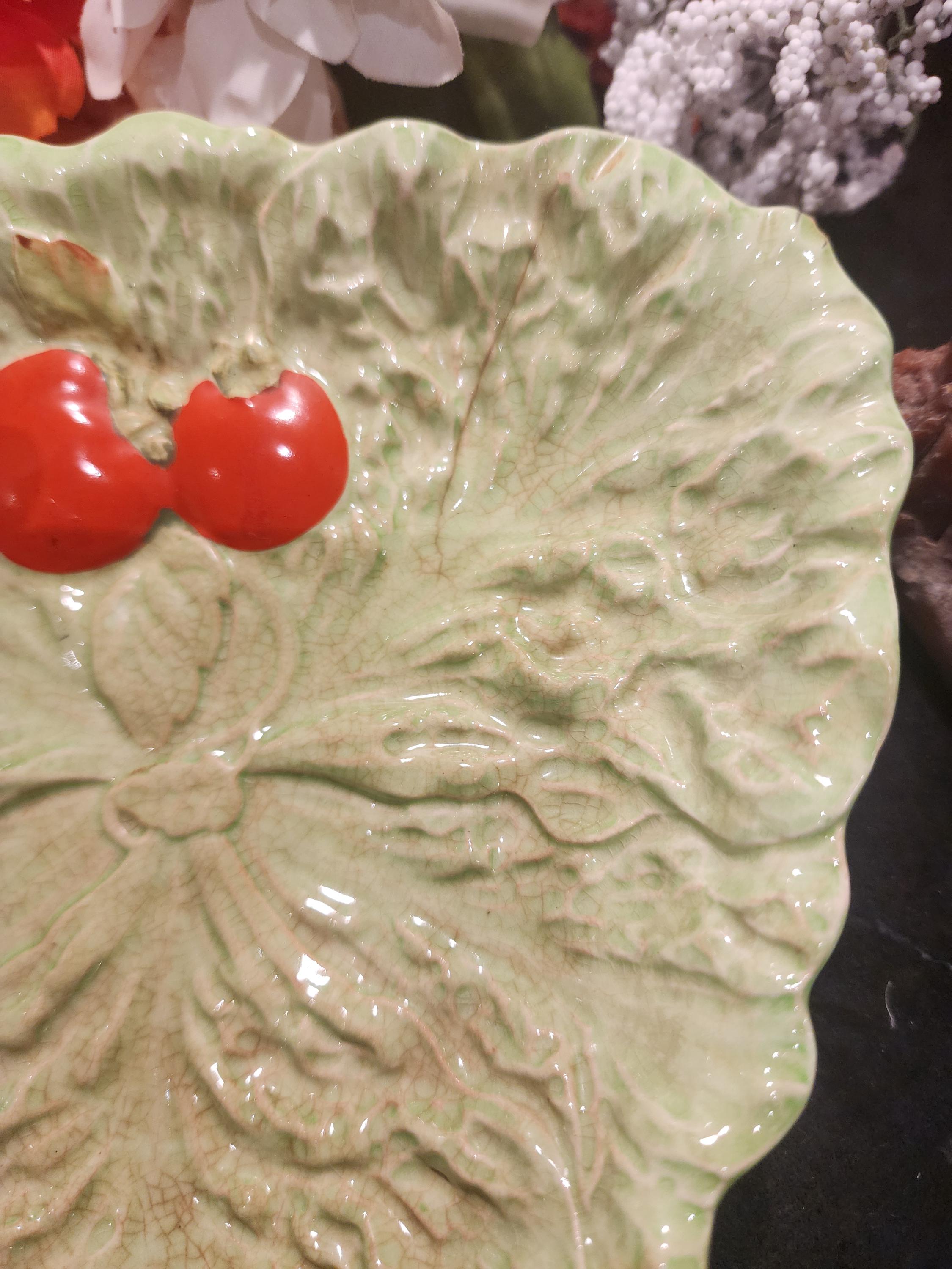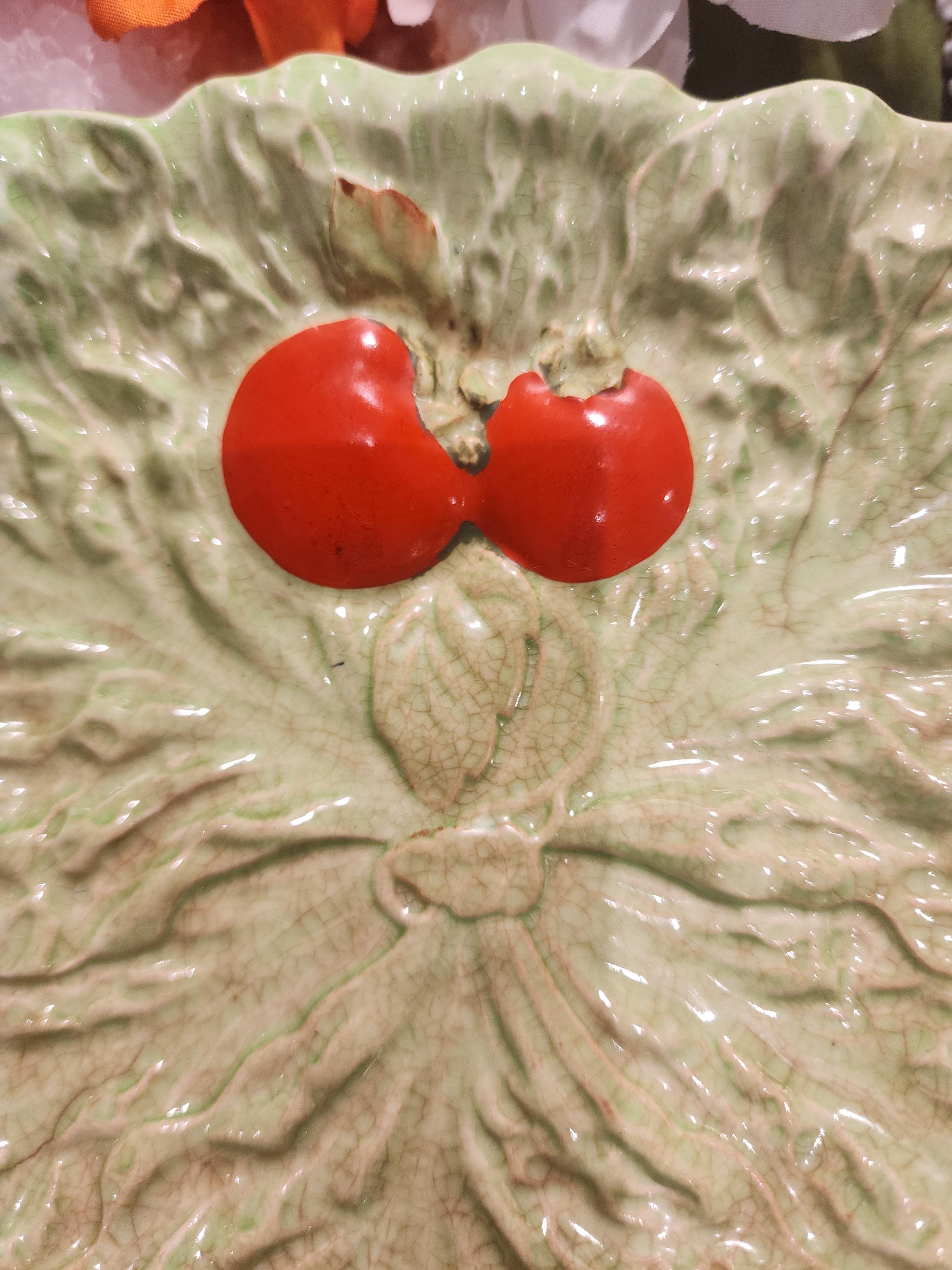 Aged to perfection 🌿 This stunning Carlton Ware lettuce leaf dish features rich green tones, bright red tomatoes, and a glossy glaze that’s beautifully crazed with age — a true mark of authentic mid-century English pottery.