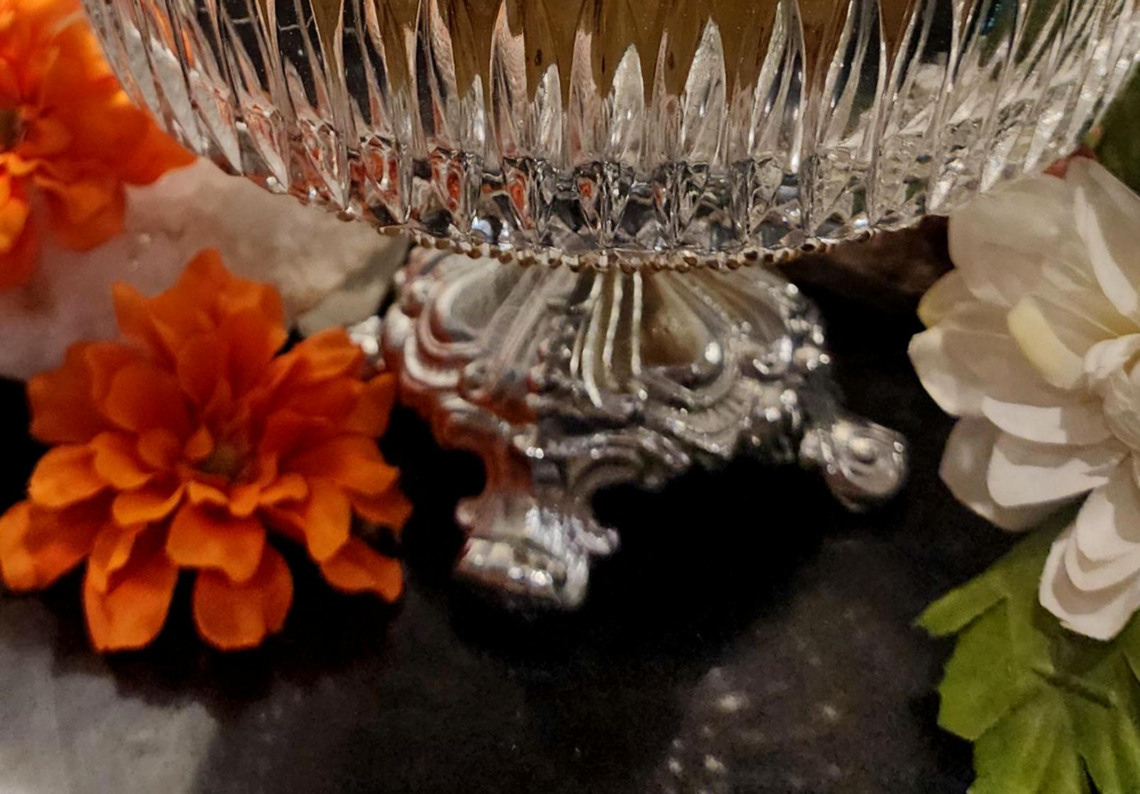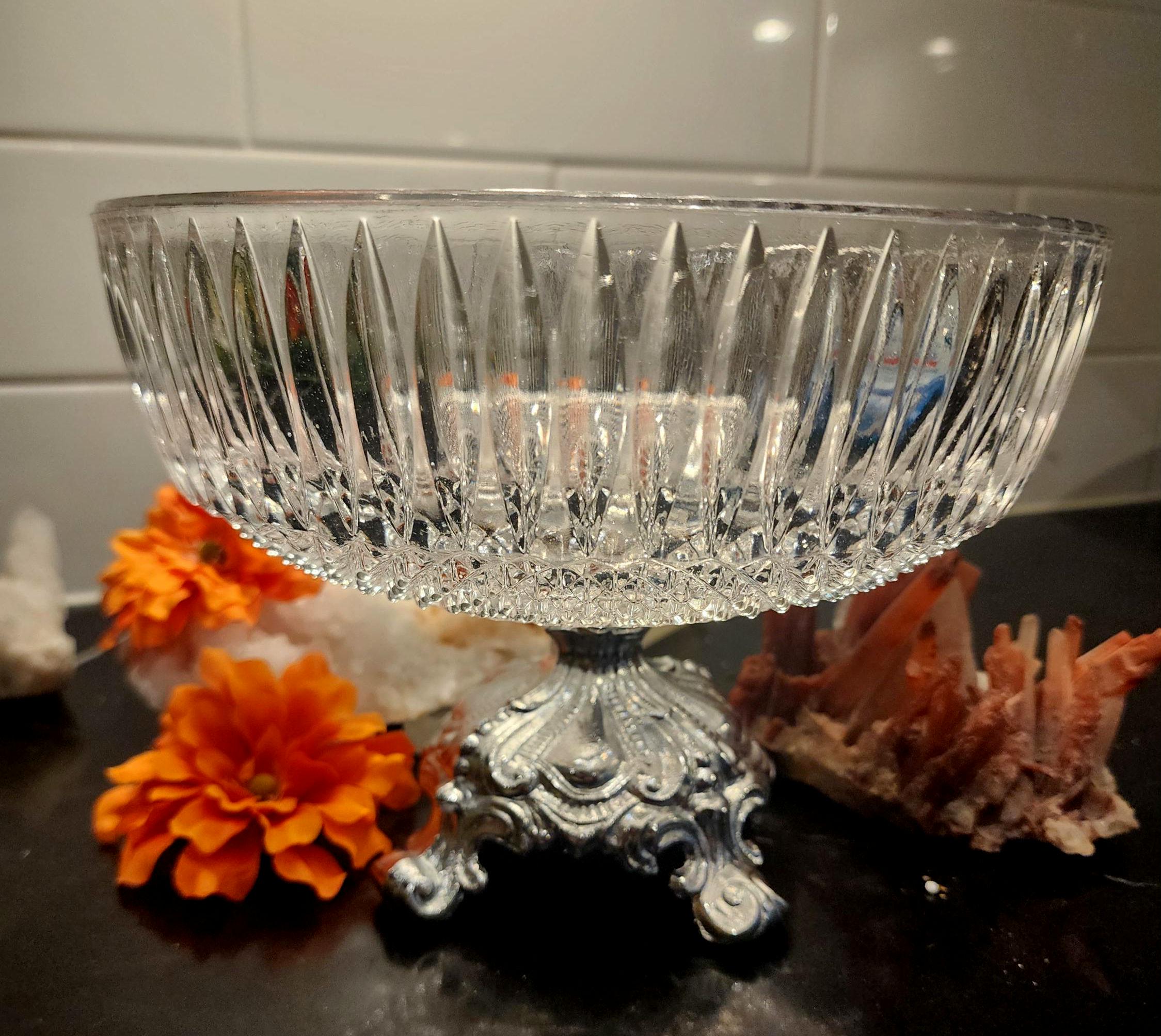 This gorgeous vintage centerpiece features a sparkling diamond-cut pressed-glass bowl paired with a beautifully ornate silver-tone pedestal base.