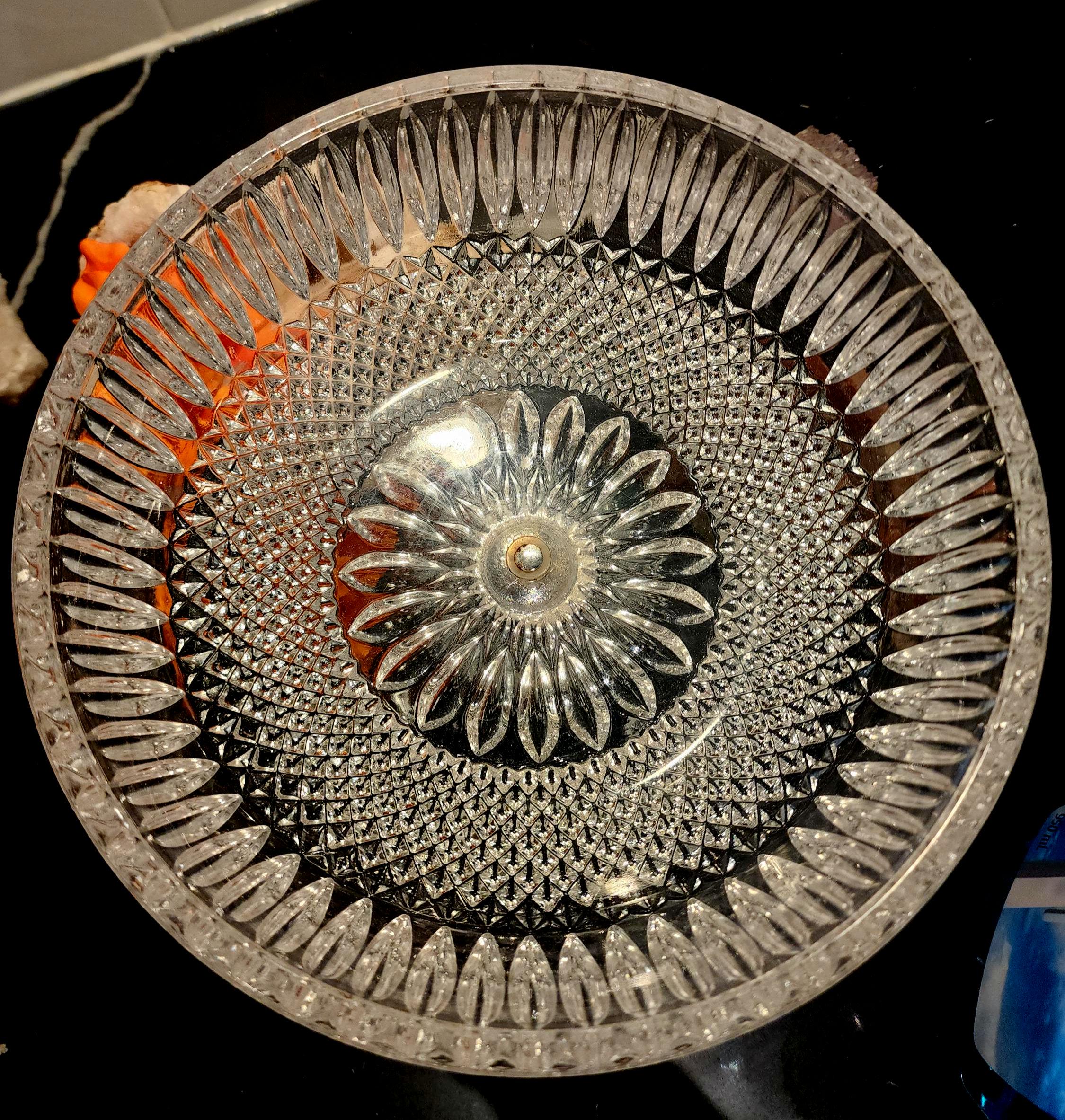 Design: Diamond-cut glass with scalloped edge and intricate footed base