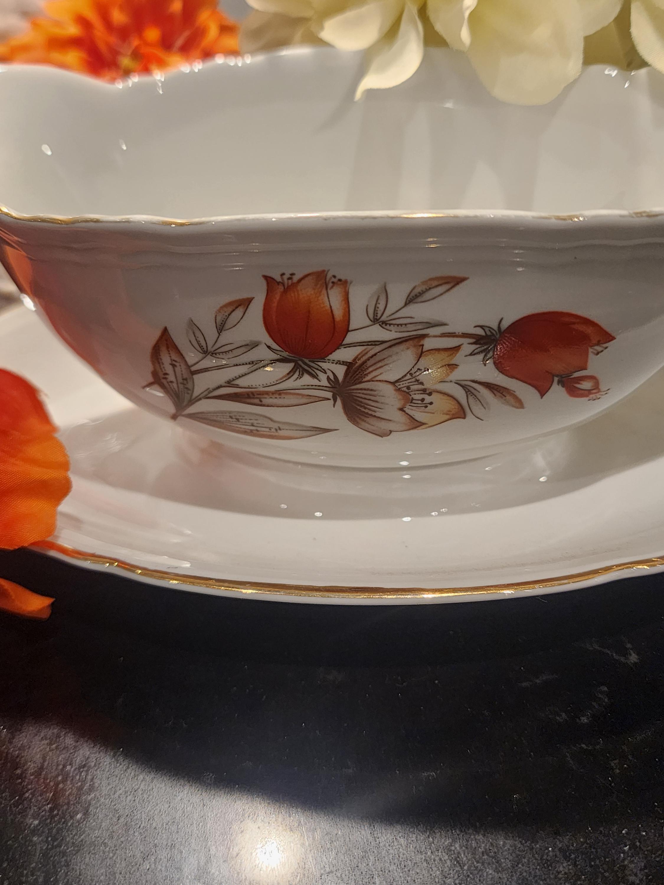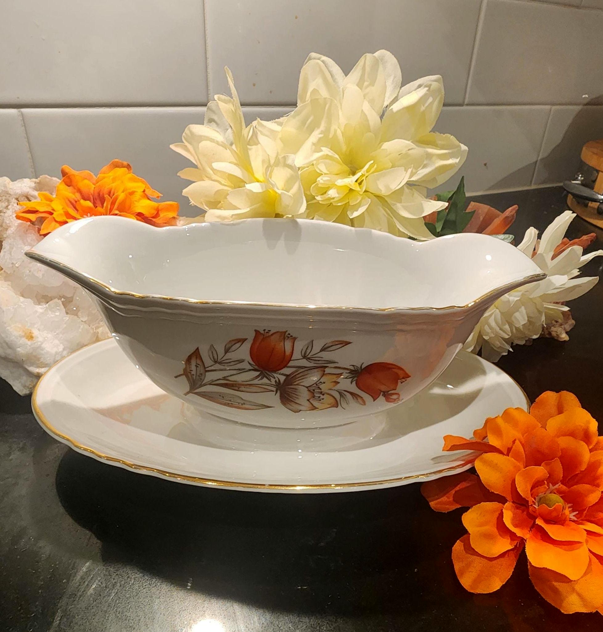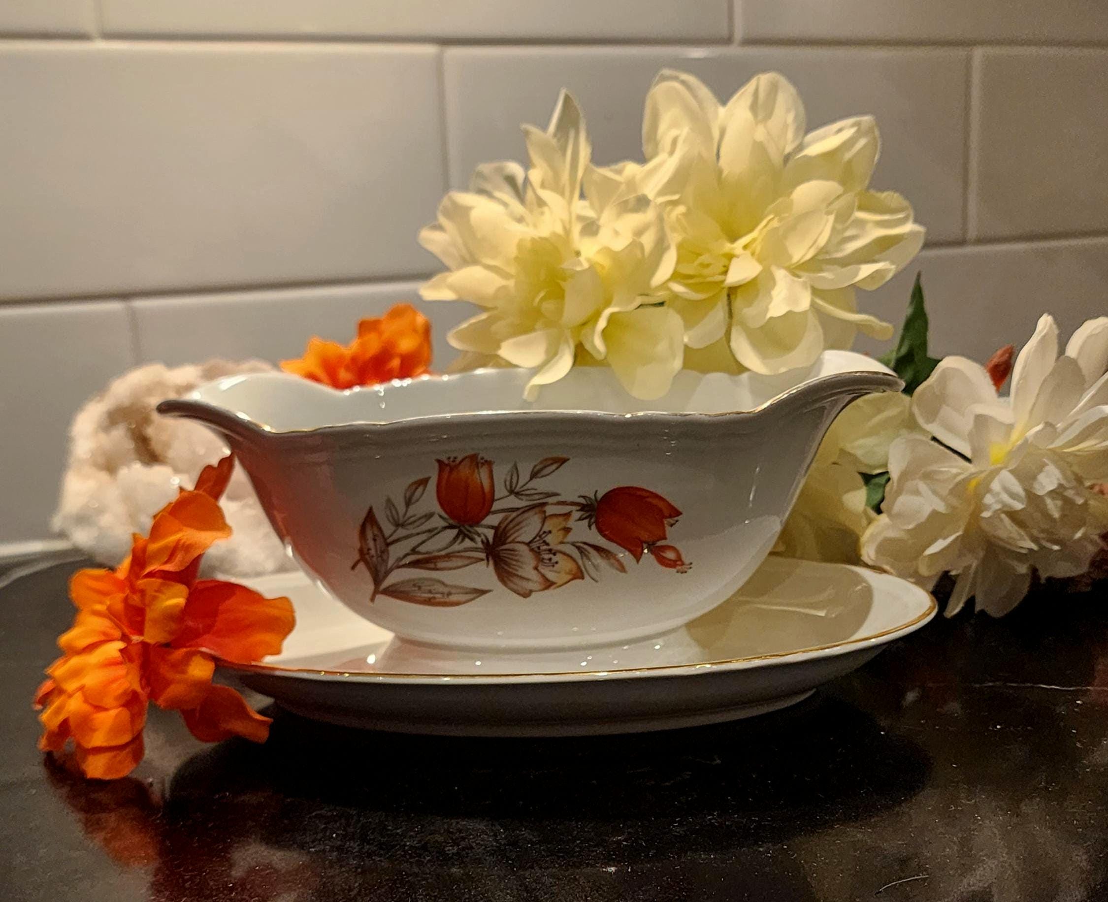 Elegant vintage porcelain gravy boat with attached underplate, made by Monopoli Porcellane Italy. This mid-century Italian serveware piece showcases a beautiful hand-painted floral design in warm autumn tones with a gently scalloped edge and gold trim.