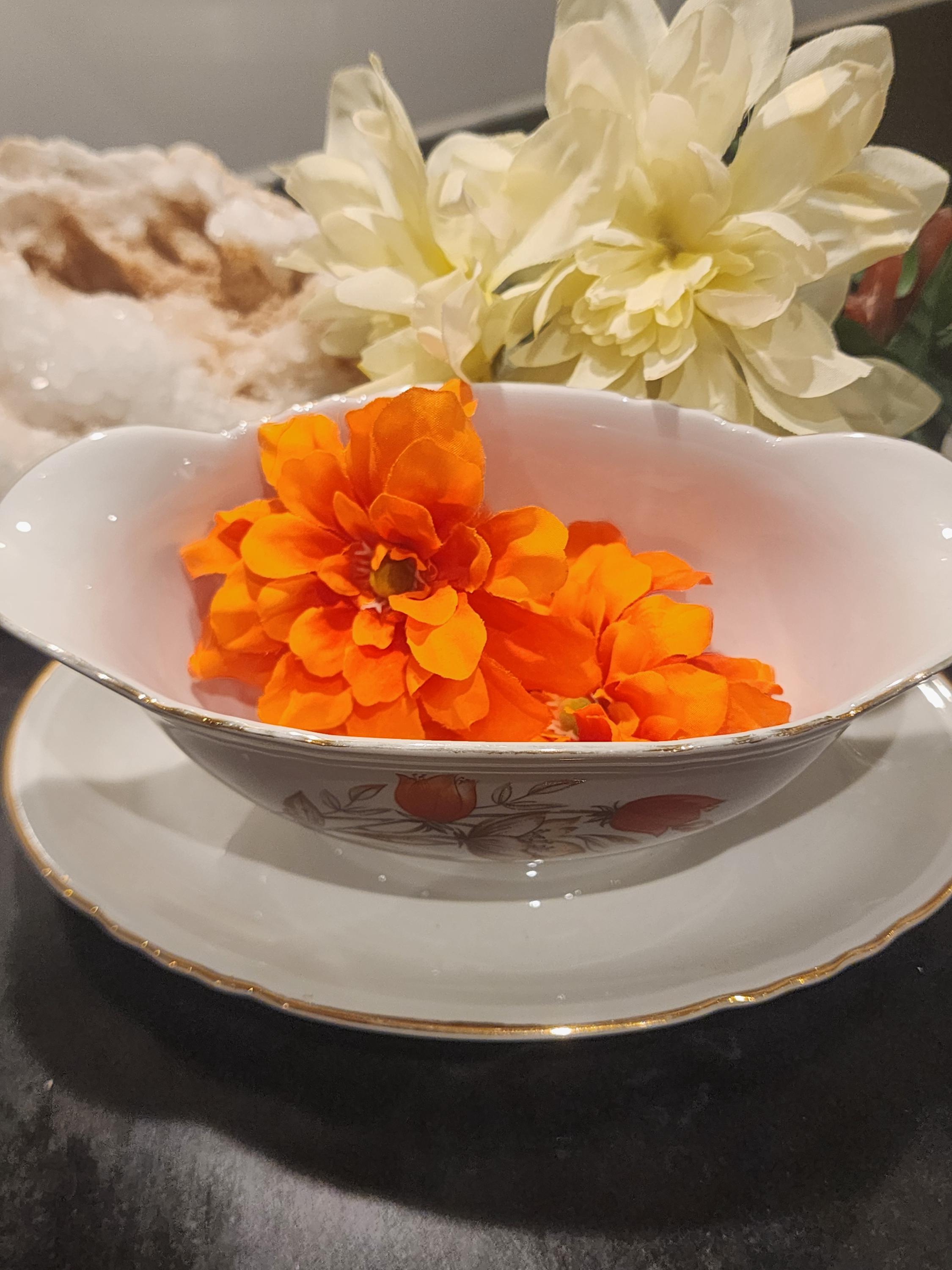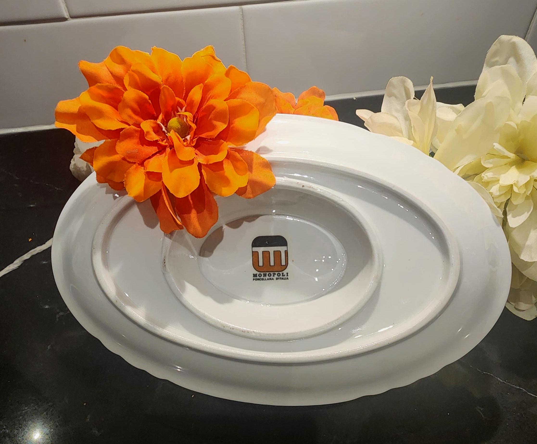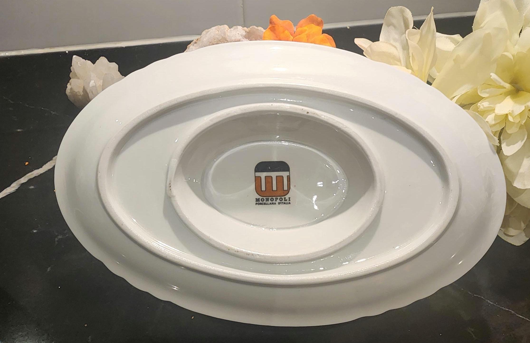 Elegant vintage porcelain gravy boat with attached underplate, made by Monopoli Porcellane Italy. This mid-century Italian serveware piece showcases a beautiful hand-painted floral design in warm autumn tones with a gently scalloped edge and gold trim.