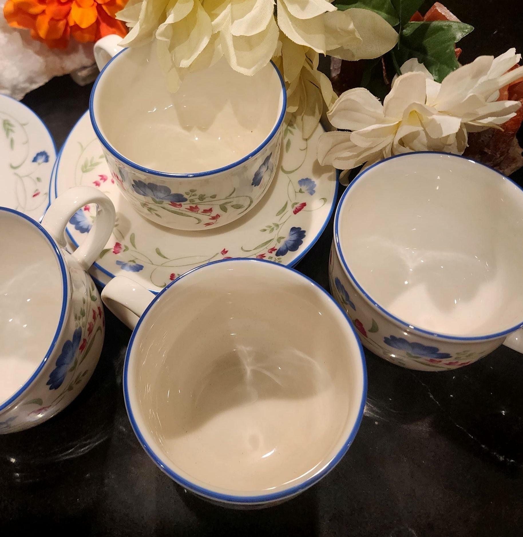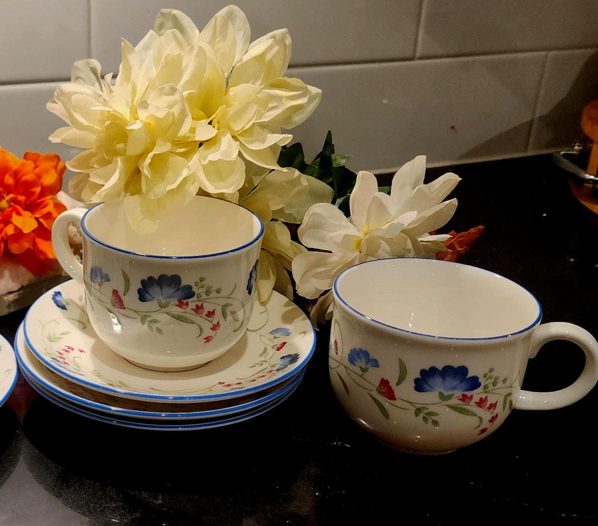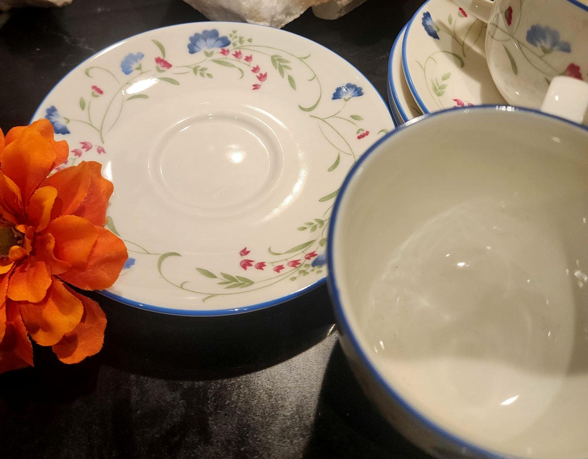 Each piece features soft blue and pink wildflowers with trailing green vines, finished with a classic blue rim. Crafted from fine English china, this set blends beauty and practicality — dishwasher, microwave, oven, and freezer safe.