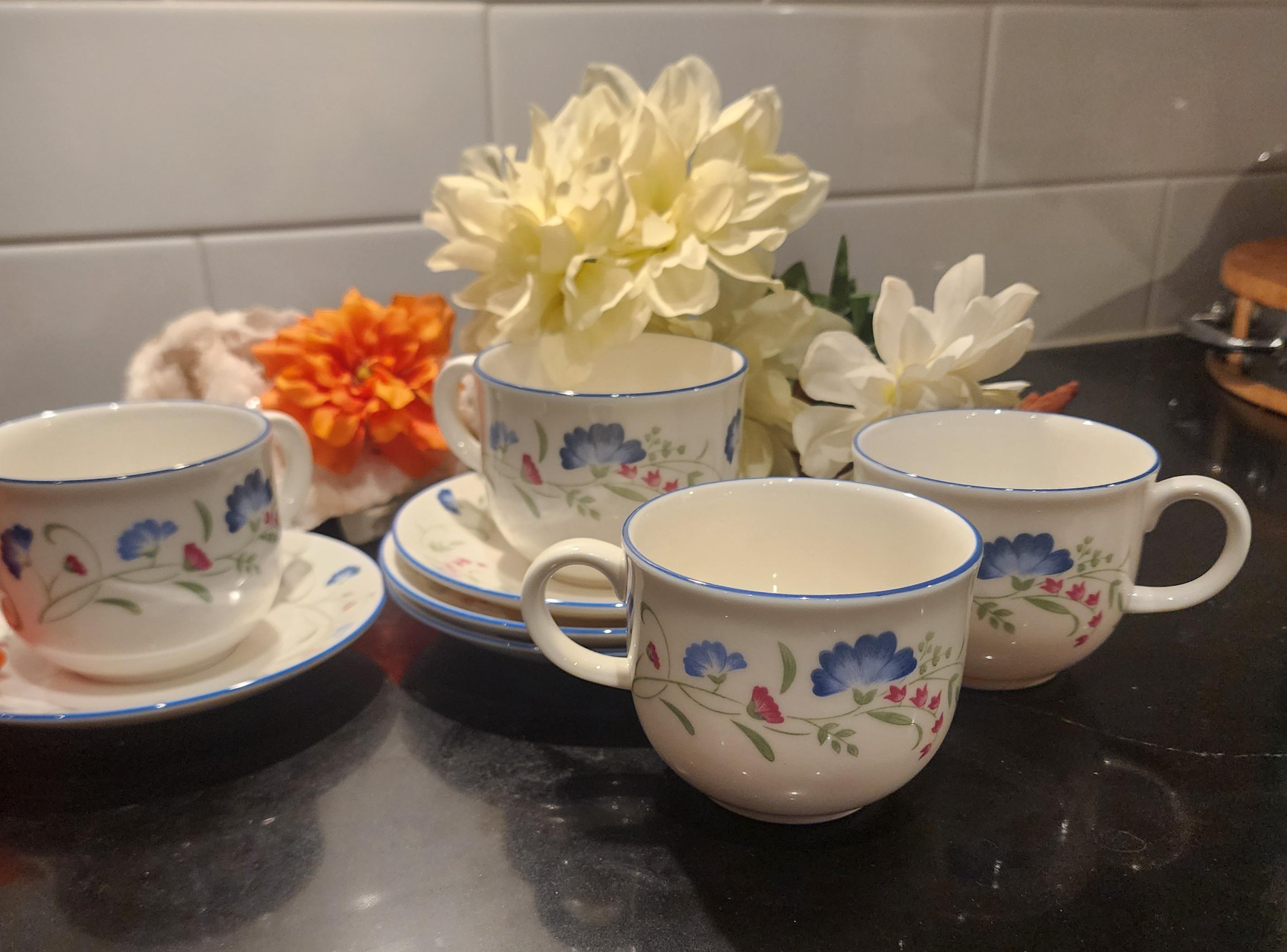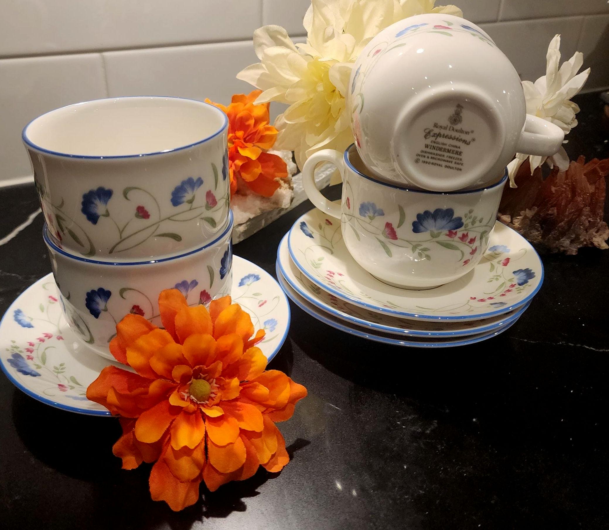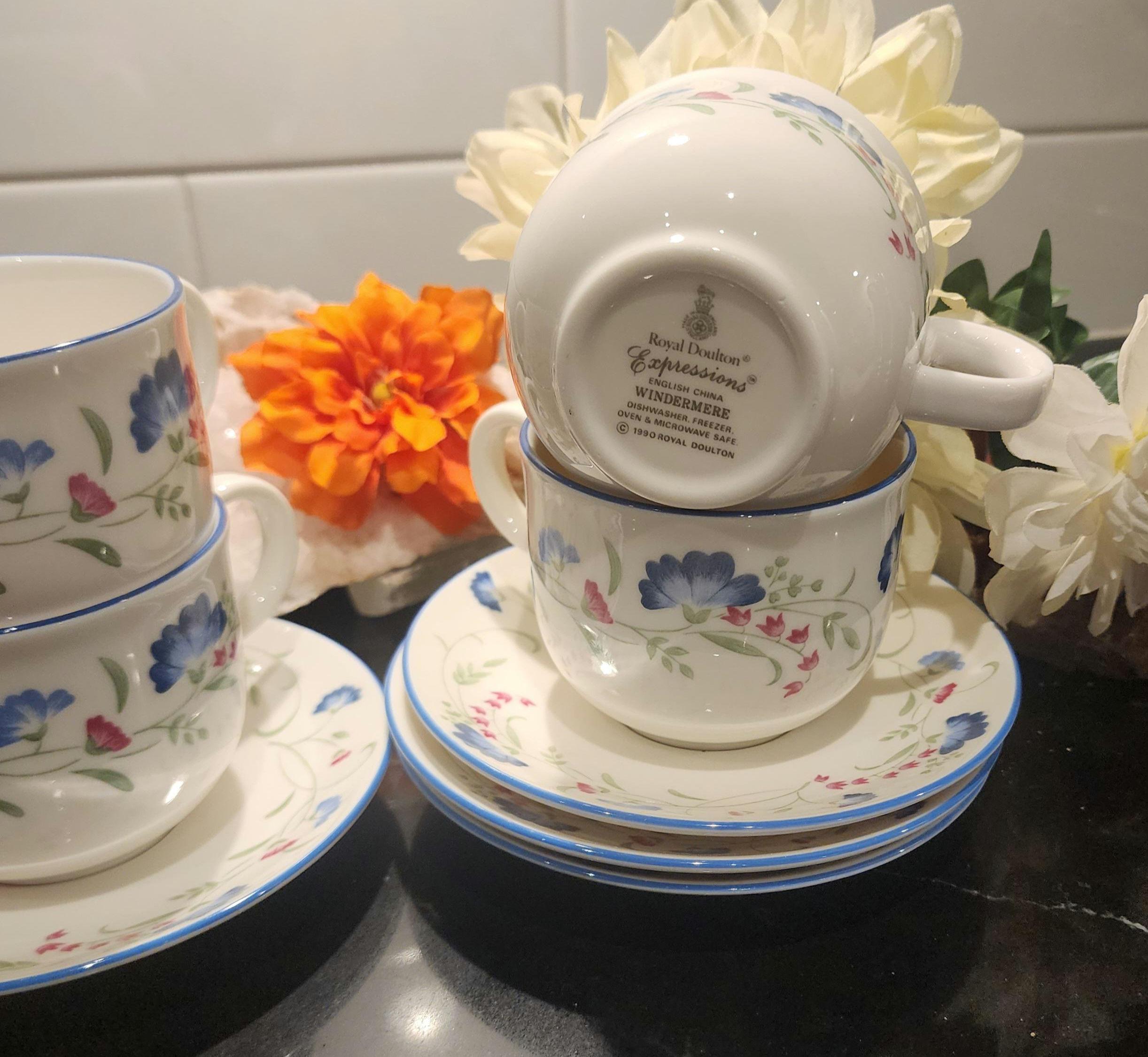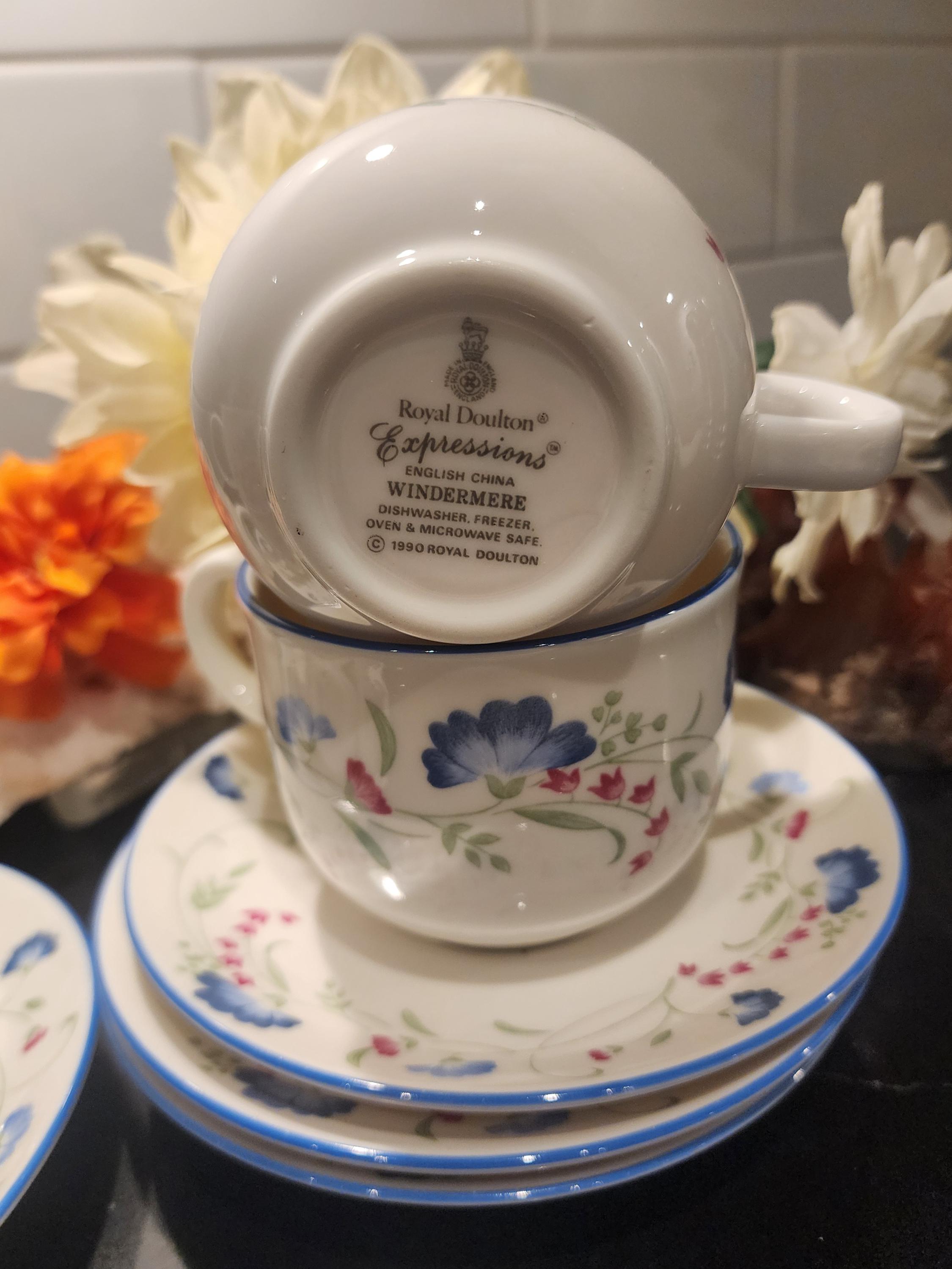 A charming pair of Royal Doulton Expressions “Windermere” teacups and saucers, made in England in 1990.