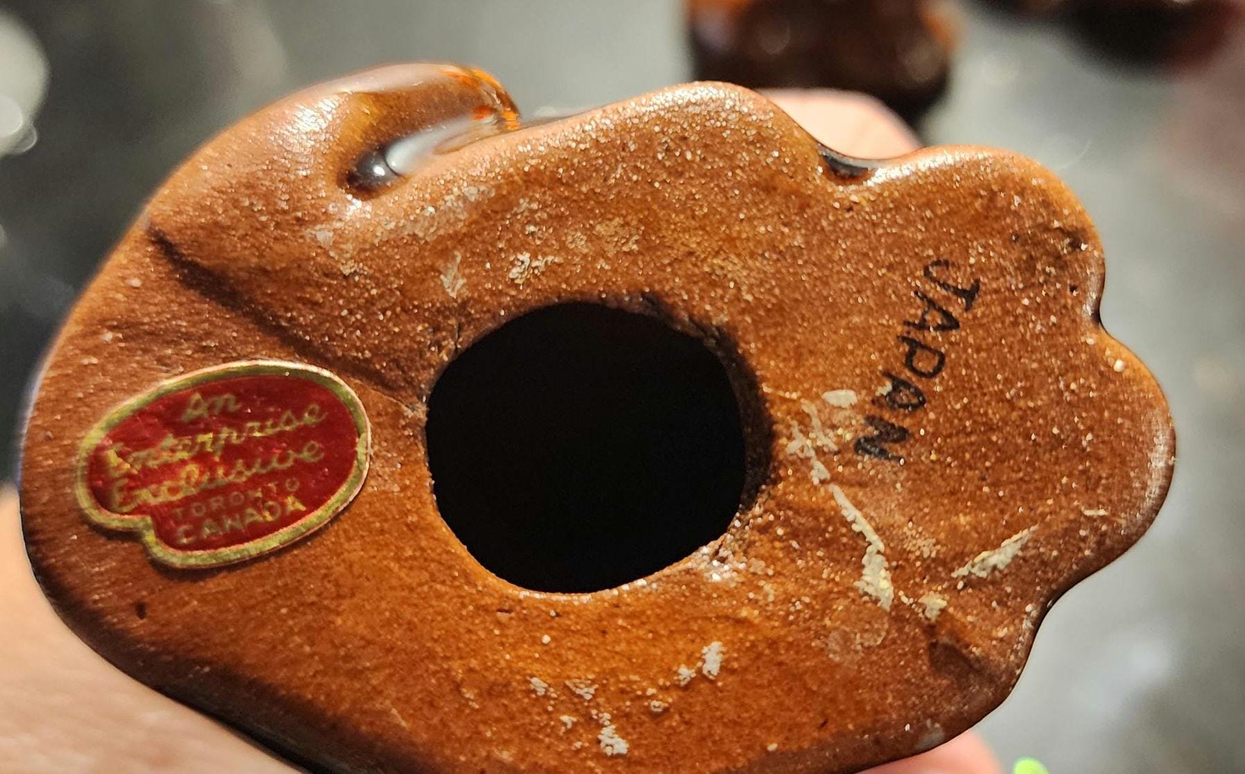 The underside of the mother cat reads “Japan” and retains its original red Enterprise Exclusive Toronto, Canada foil sticker — a hallmark of imported Japanese ceramics from the 1950s–60s.