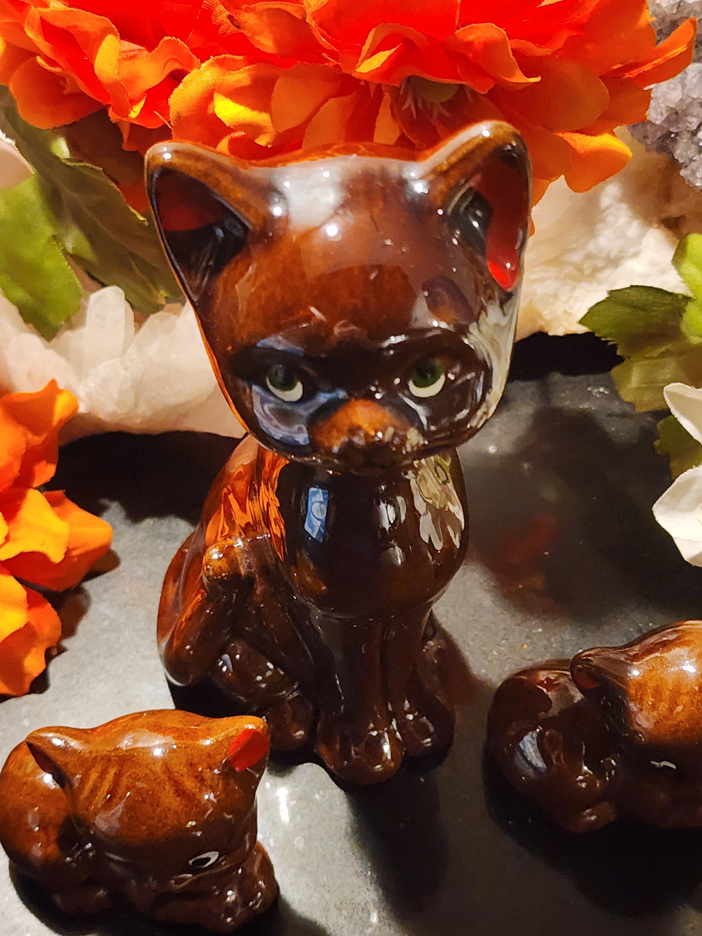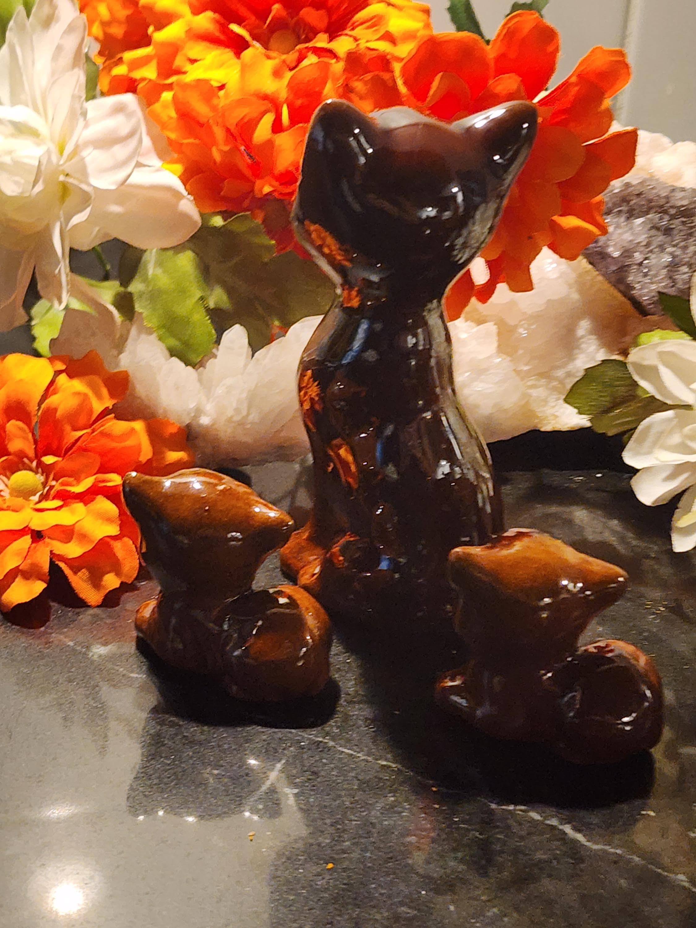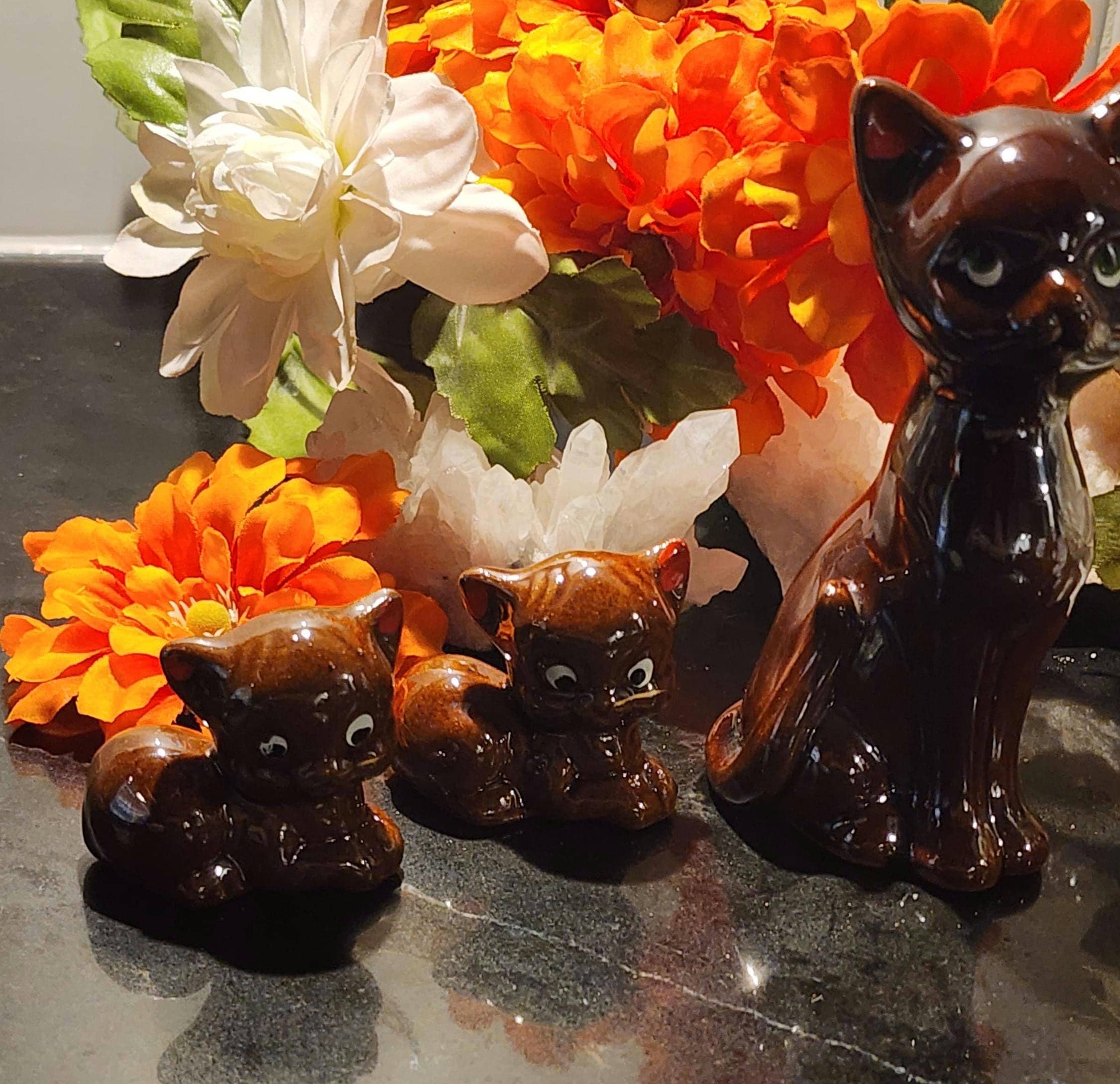 Charming mid-century ceramic cat family set featuring a sleek brown mother cat with two adorable kittens. Each piece is finished in a rich, glossy brown glaze with hand-painted details.