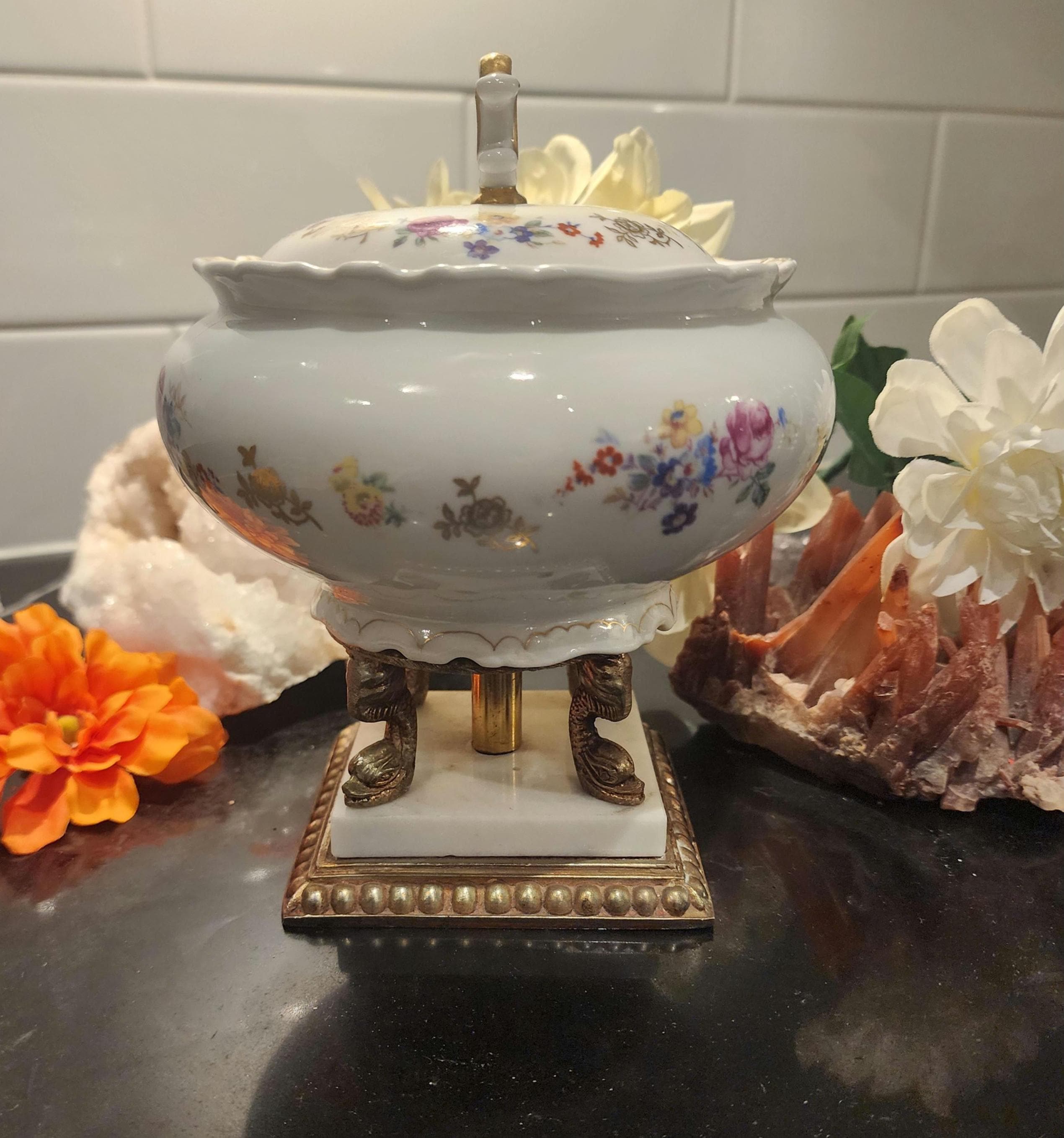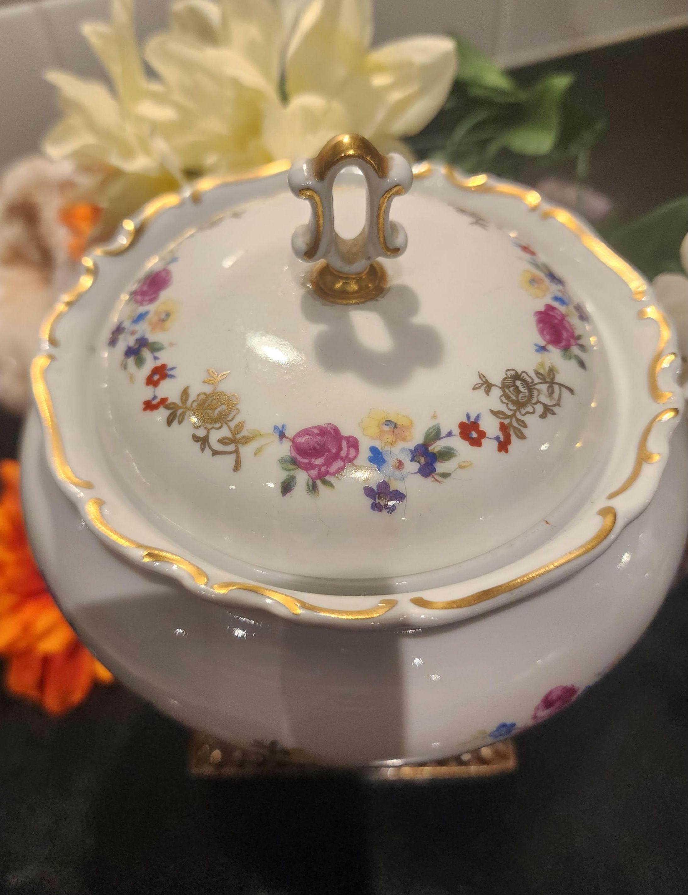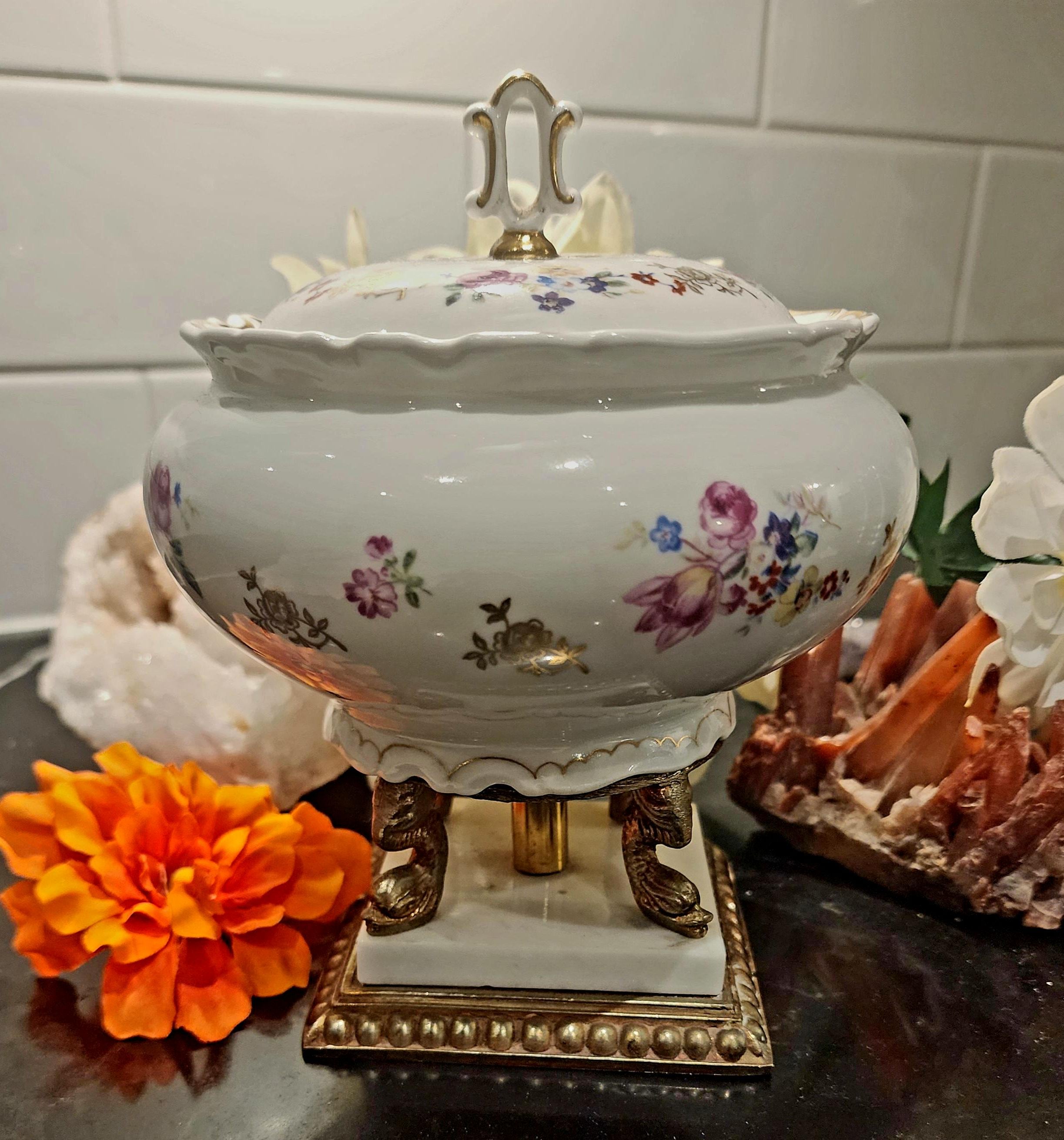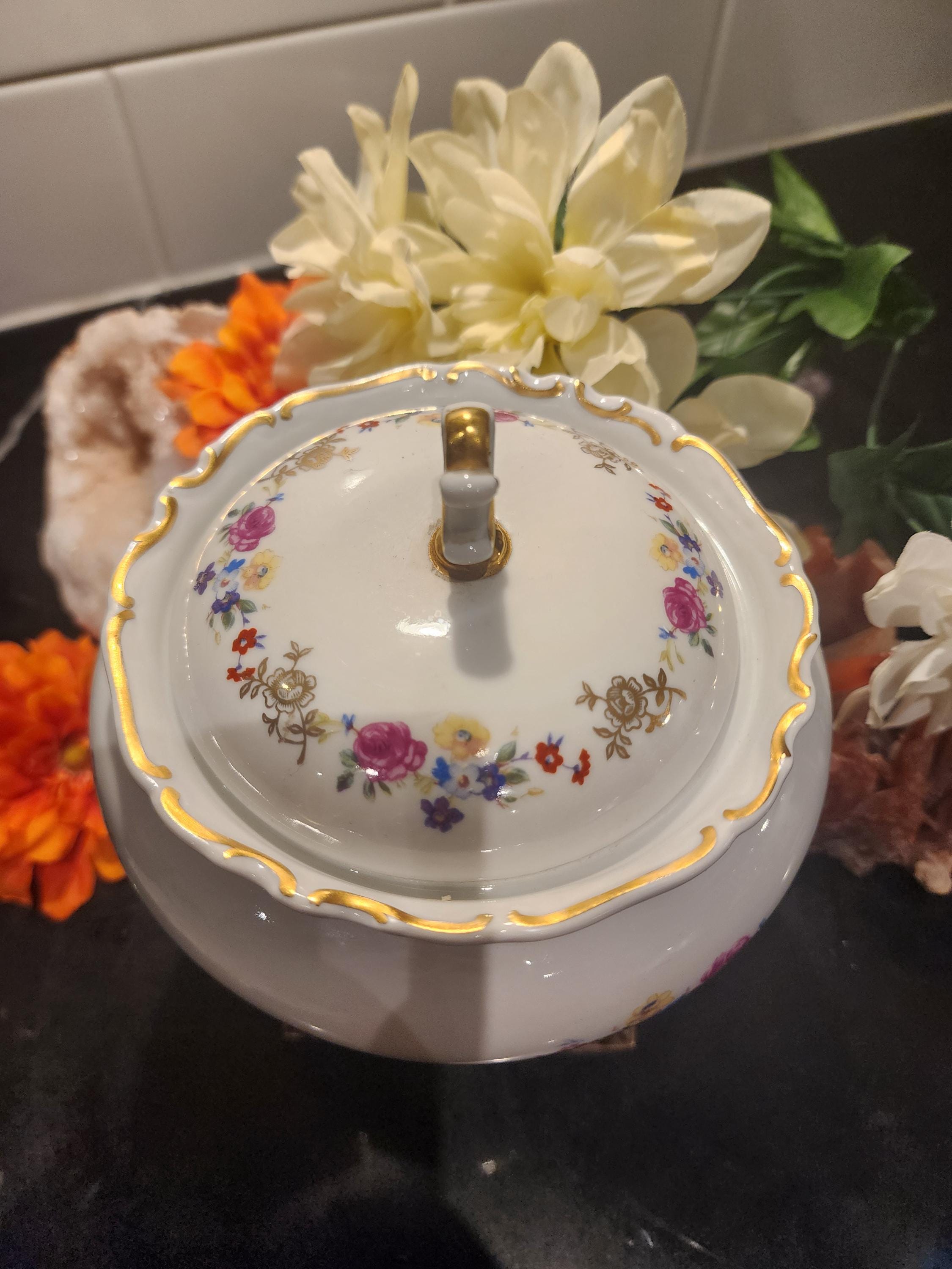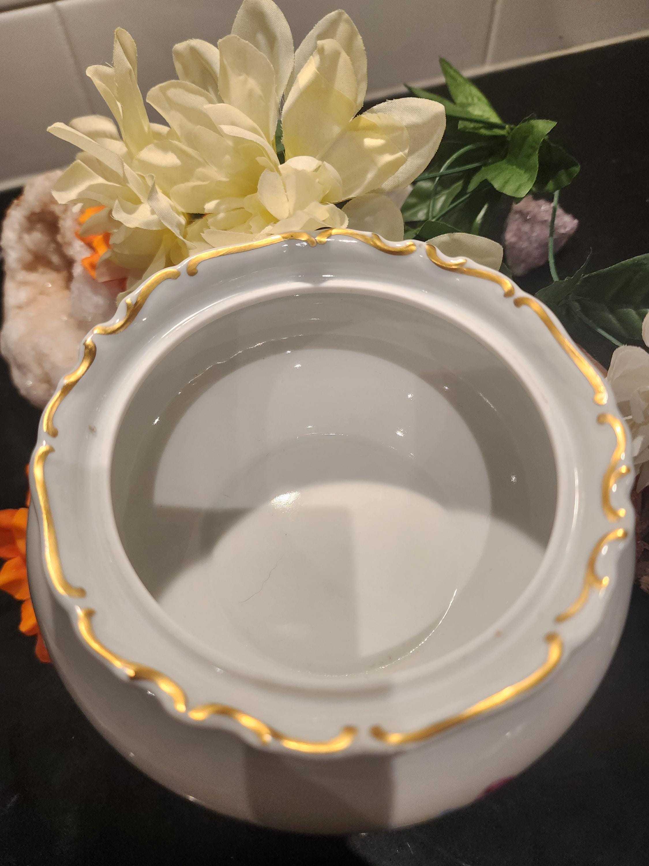 Design: Hand-painted florals, scalloped lid, gilded finial and rim