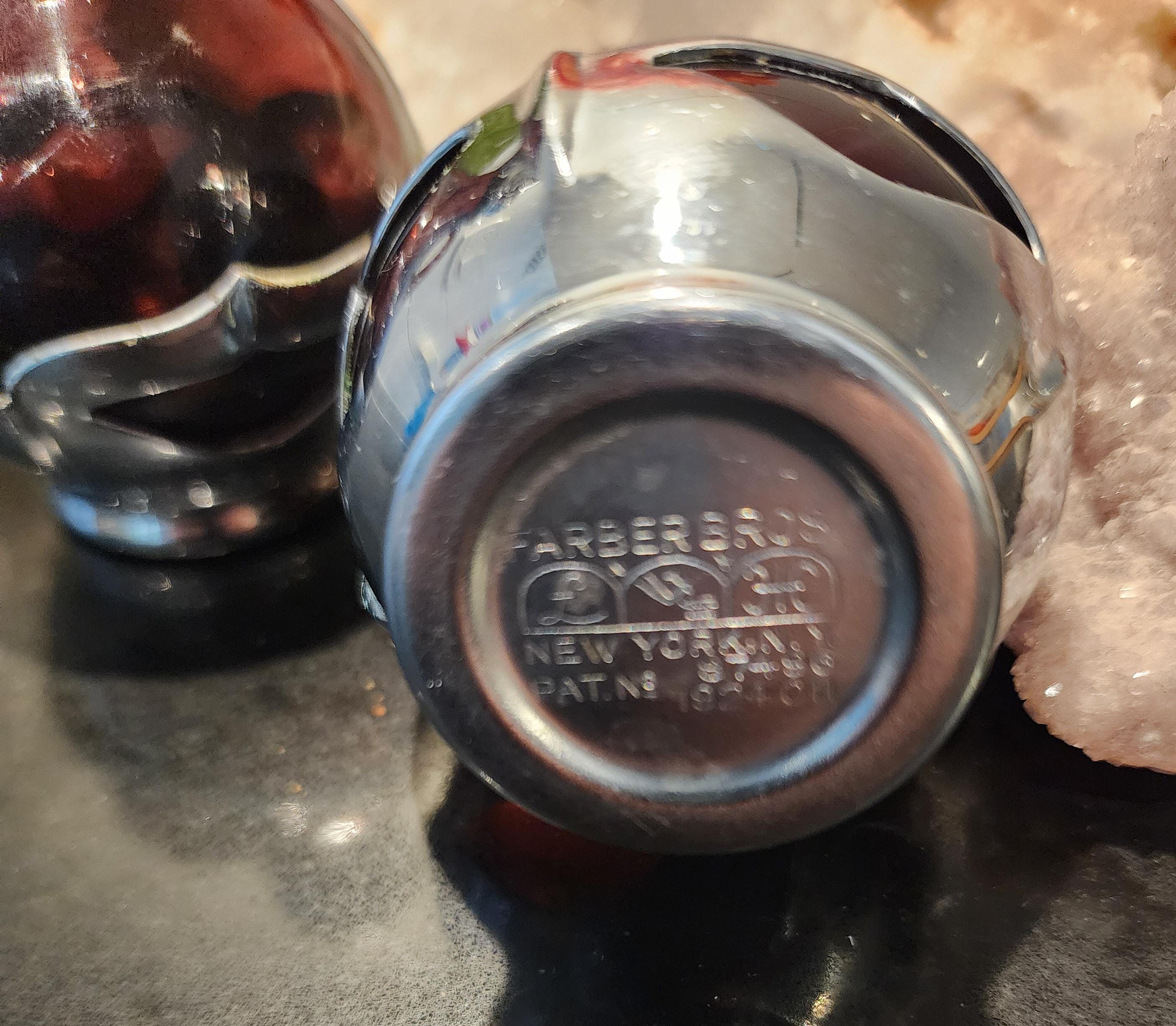 These stunning Farber Bros. New York salt & pepper shakers feature rich amethyst glass that glows deep purple in the light, nestled in Farber Bros.’ signature chrome-plated holders. Their curvy Art Deco silhouette and high-shine metal give them that timeless 1930s elegance collectors adore.