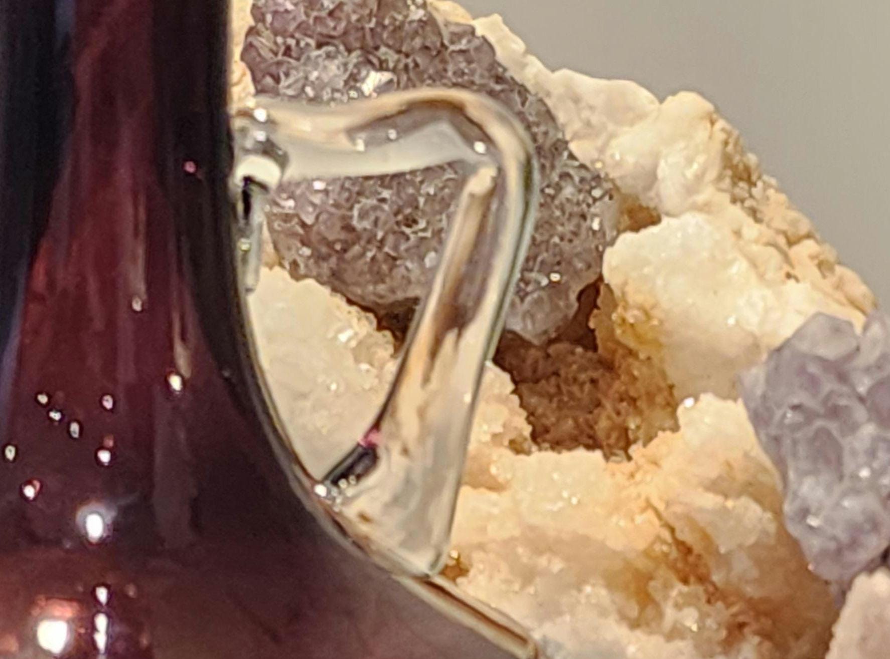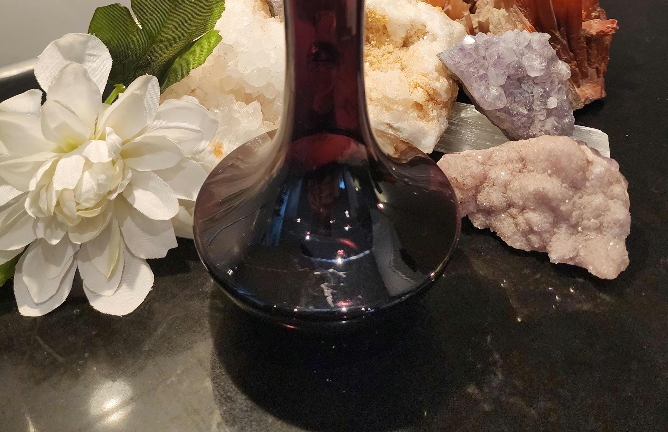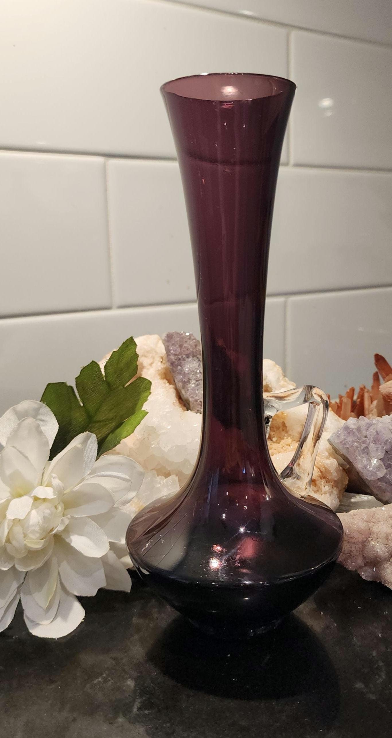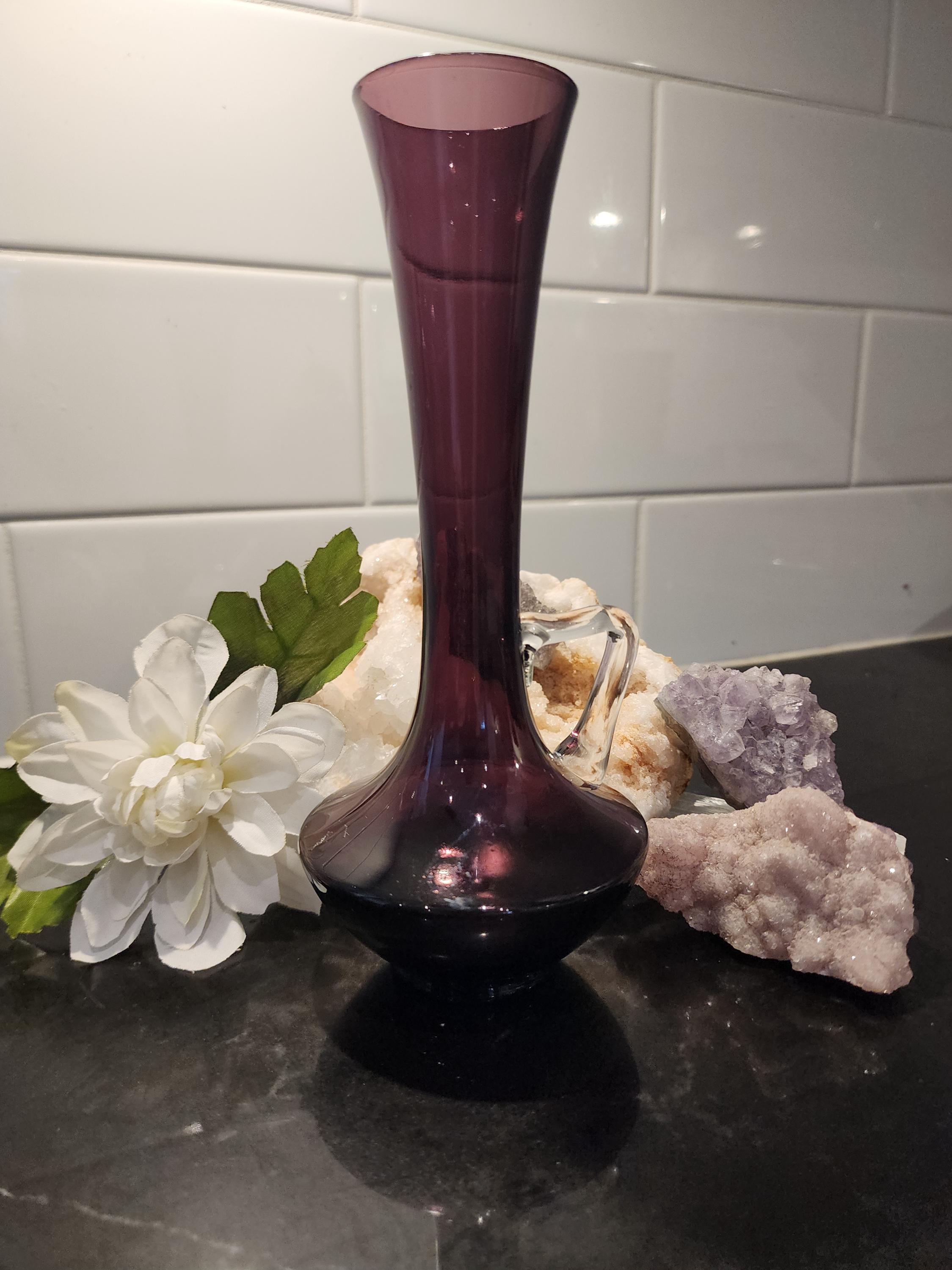 Striking vintage amethyst art glass vase, hand-blown in the Empoli style and featuring a graceful fluted neck with a clear applied handle. Standing 8 inches tall, this piece radiates deep plum tones that glow beautifully in natural light.