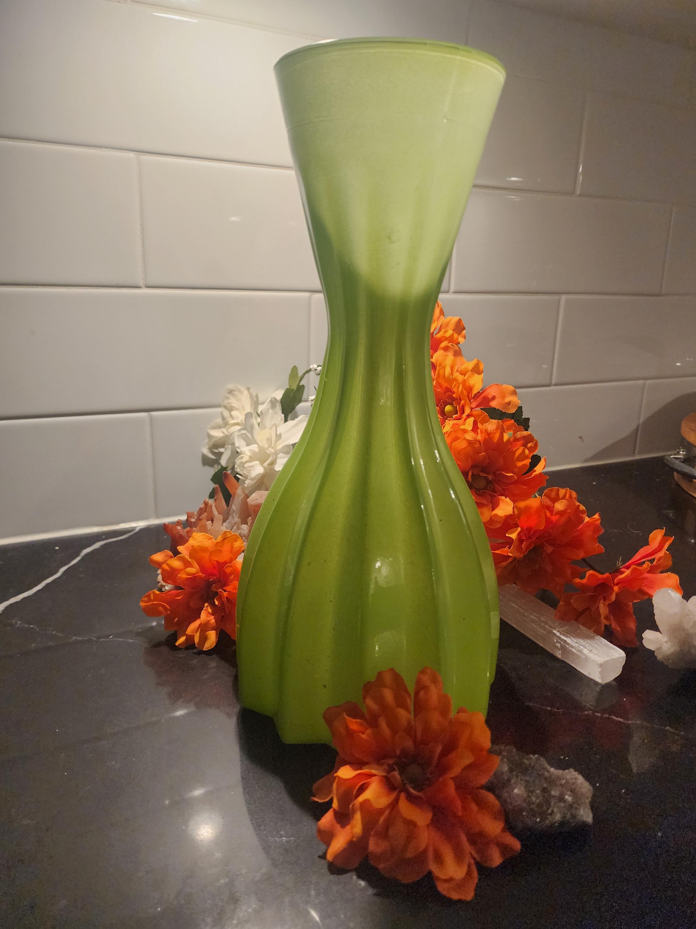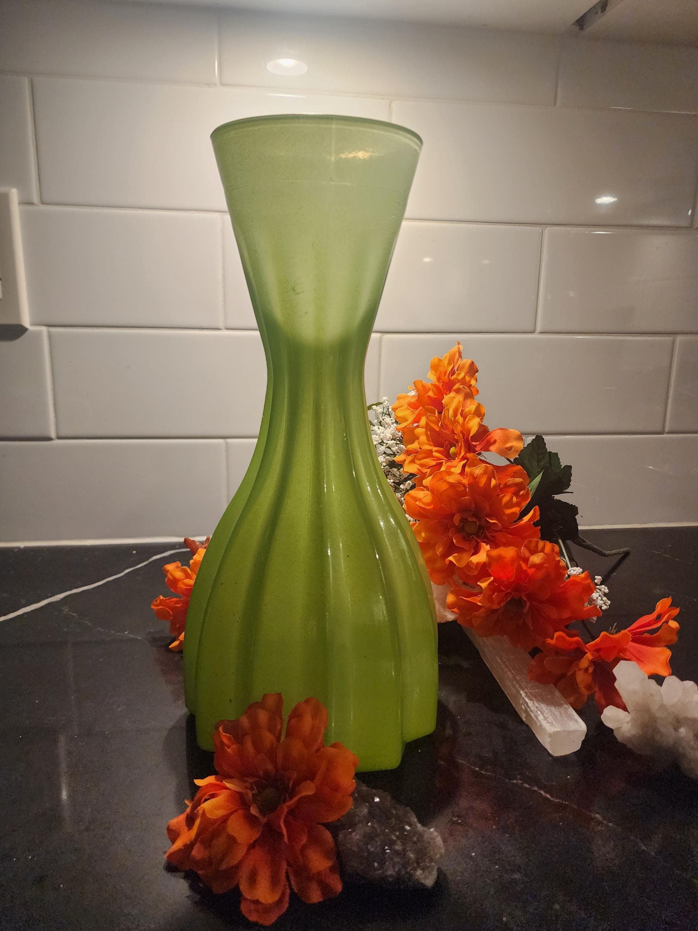 This tall and elegant green glass vase is a true mid-century statement piece. Made in Spain, it features a sculptural ribbed hourglass silhouette and a soft satin finish that glows beautifully in the light. Heavy, durable, and full of retro charm — it’s the kind of piece that stands out effortlessly on any table, mantle, or shelf.