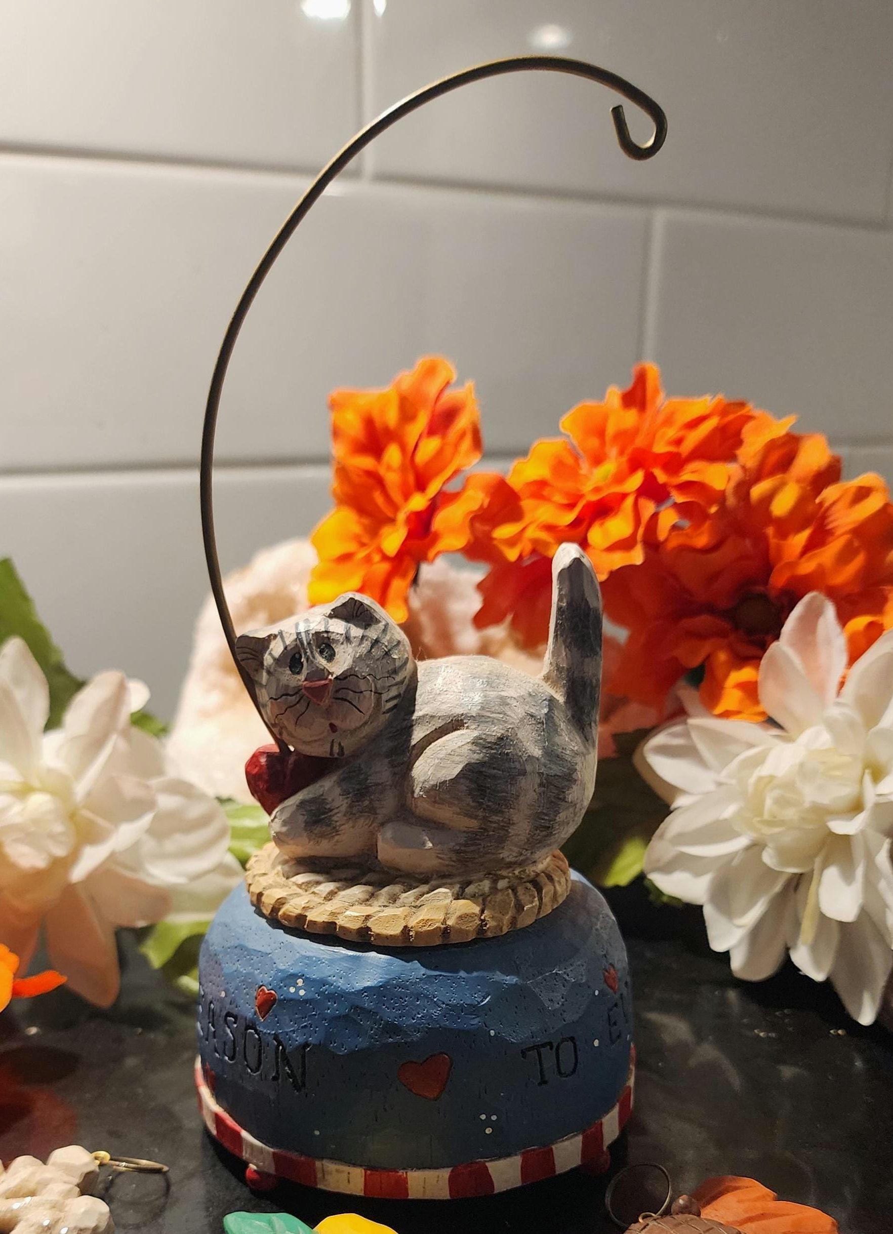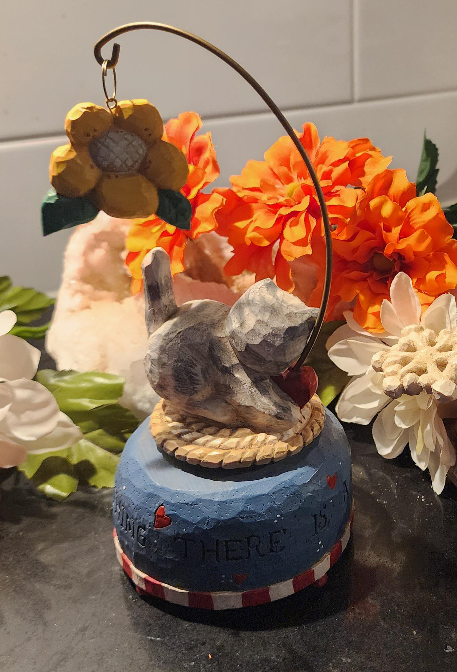 This delightful hand-painted wooden cat sits atop a base that reads “To everything there is a season.” It plays the classic song “Turn! Turn! Turn!” and comes with four original interchangeable hanging ornaments — a sunflower 🌻, snowflake ❄️, acorn leaf 🍂, and watermelon 🍉 — representing each season.
