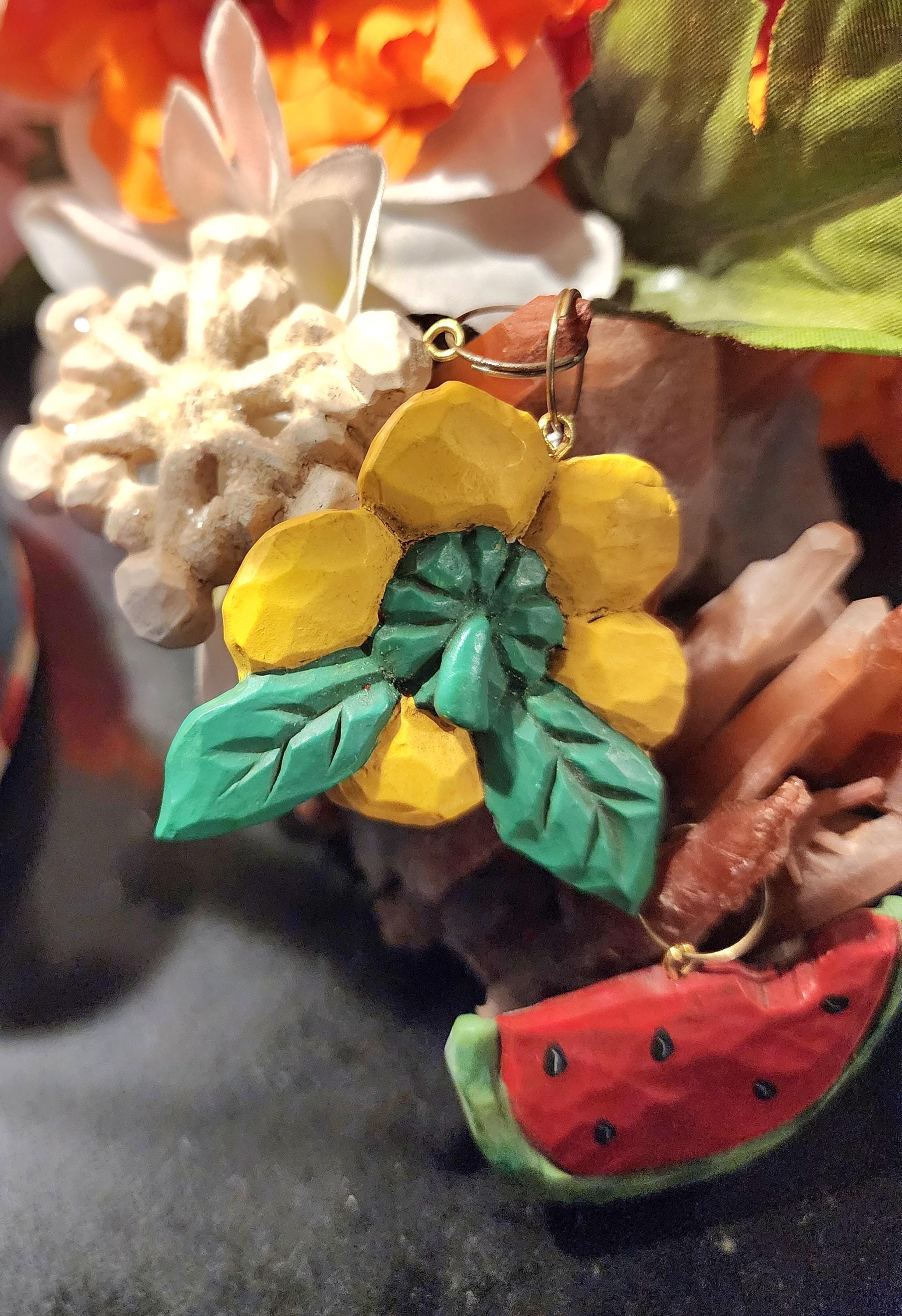 Material: Hand-painted wood, metal wire, plastic ornaments, wind-up metal mechanism
