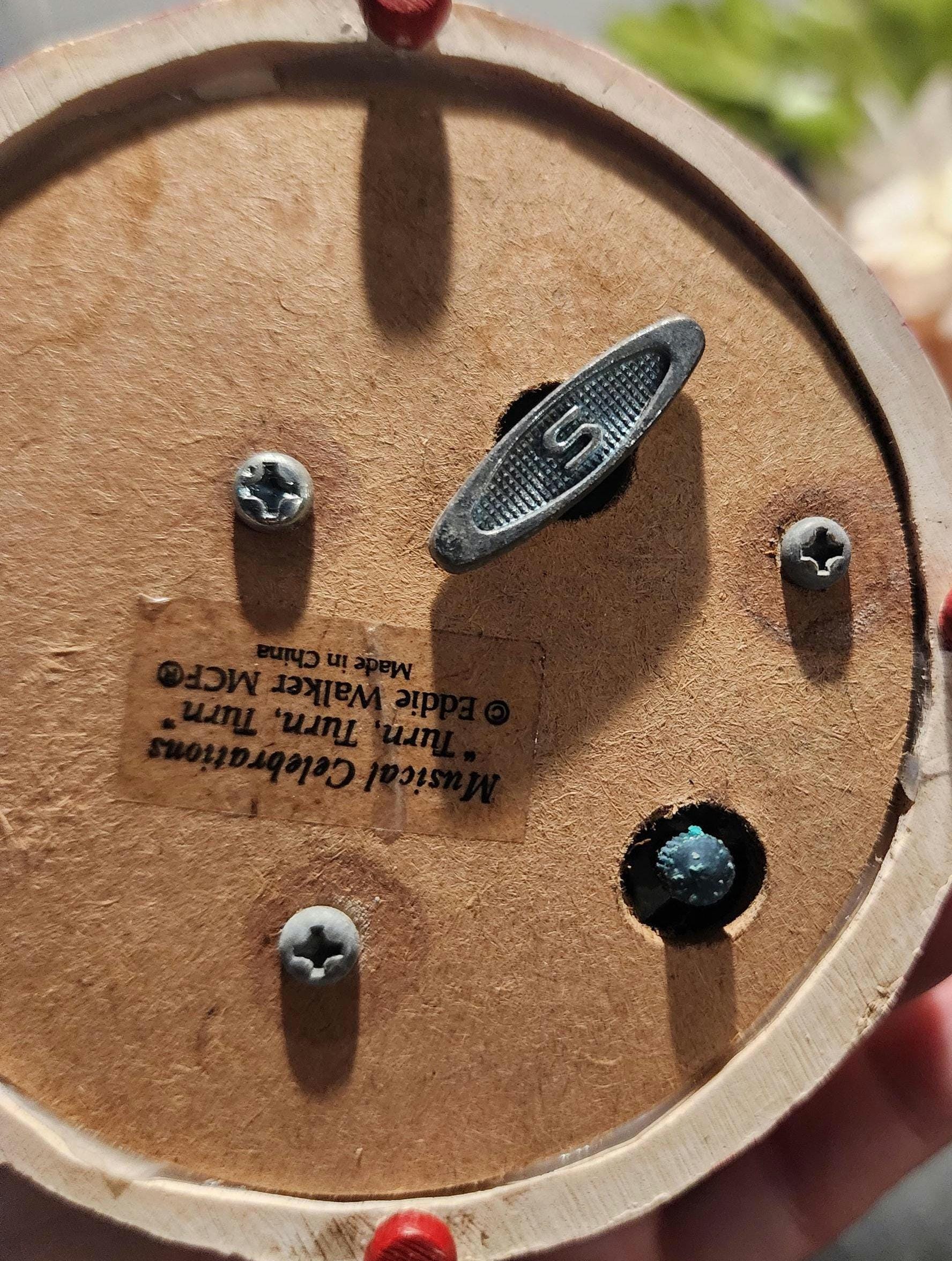 The music box plays beautifully, and the on/off switch underneath works, though it can stick slightly when turning on and off (very common for vintage music boxes). With gentle use, it functions perfectly and plays its tune clearly.