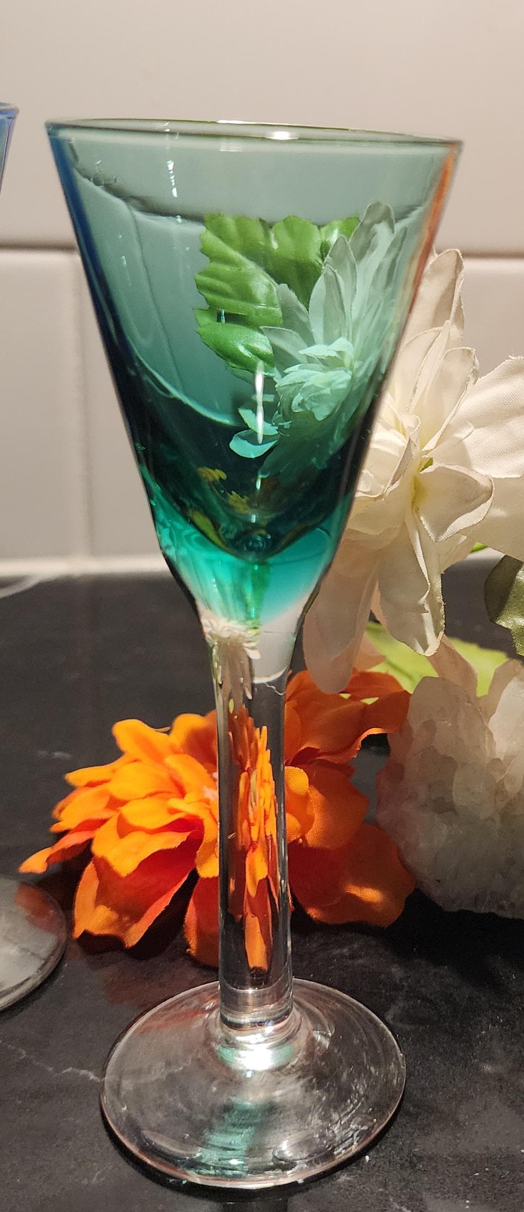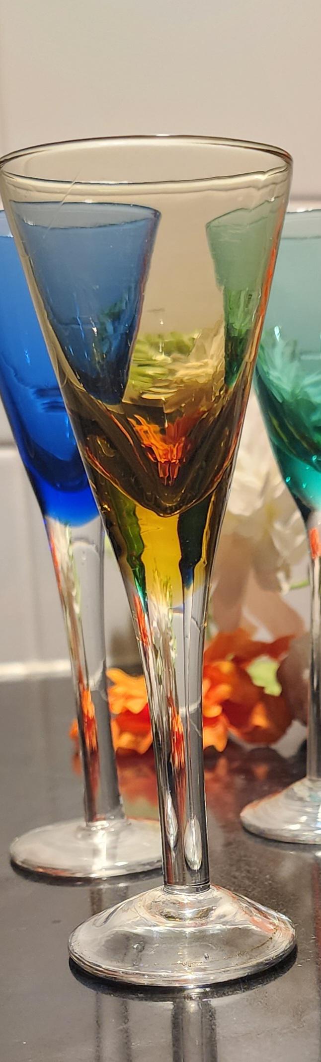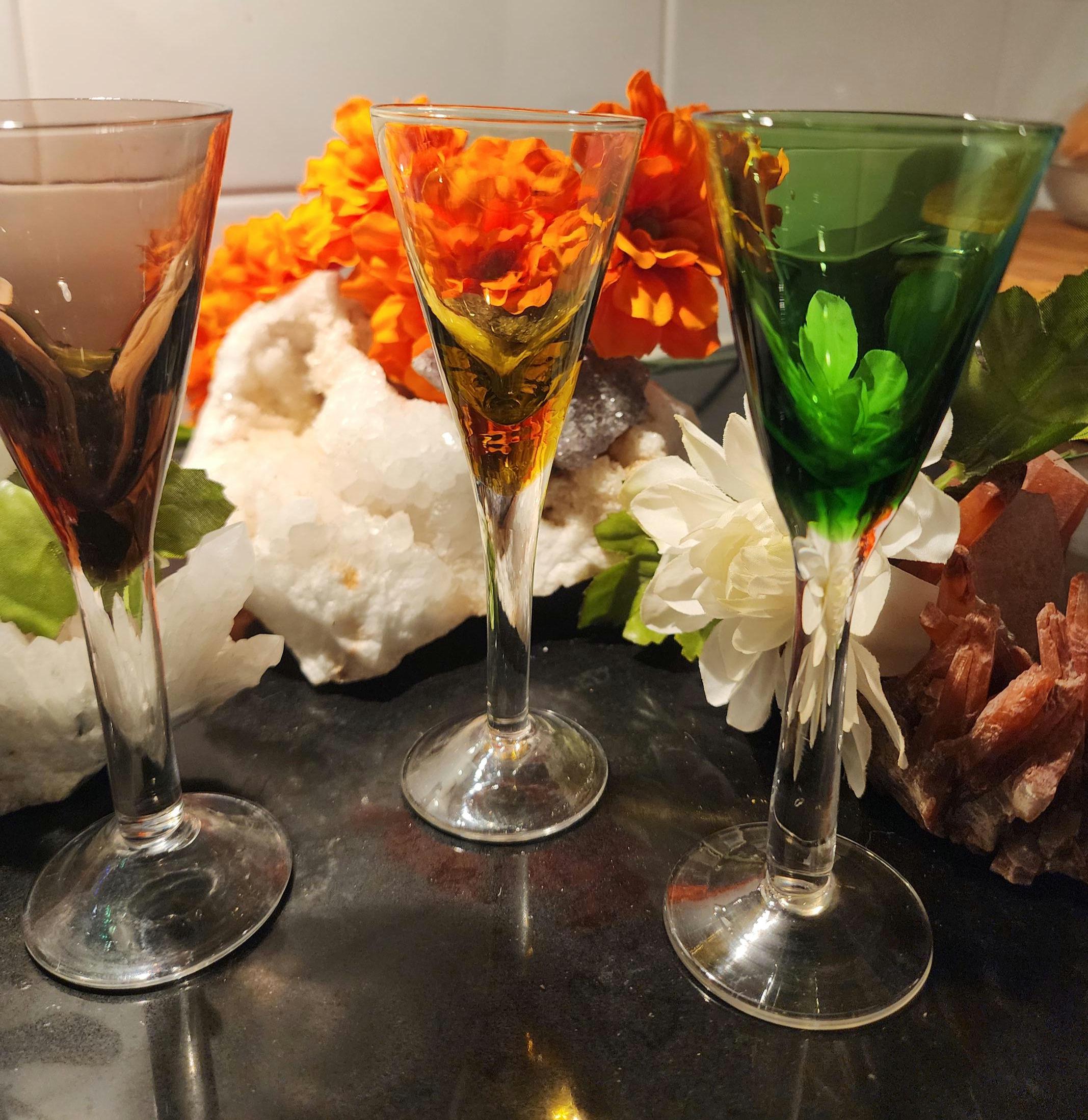 Each of these beautiful vintage cordial glasses has its own unique shape and color tone — no two are exactly alike. Every piece is hand-blown, giving it a slightly different character and glow that adds to its vintage charm.