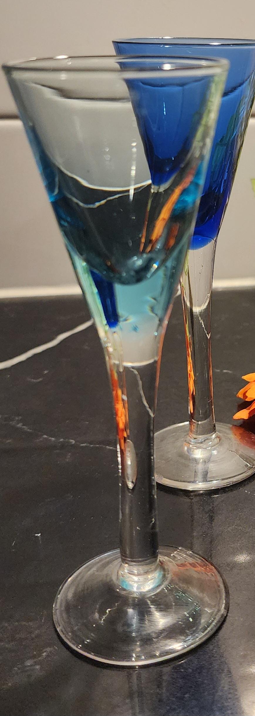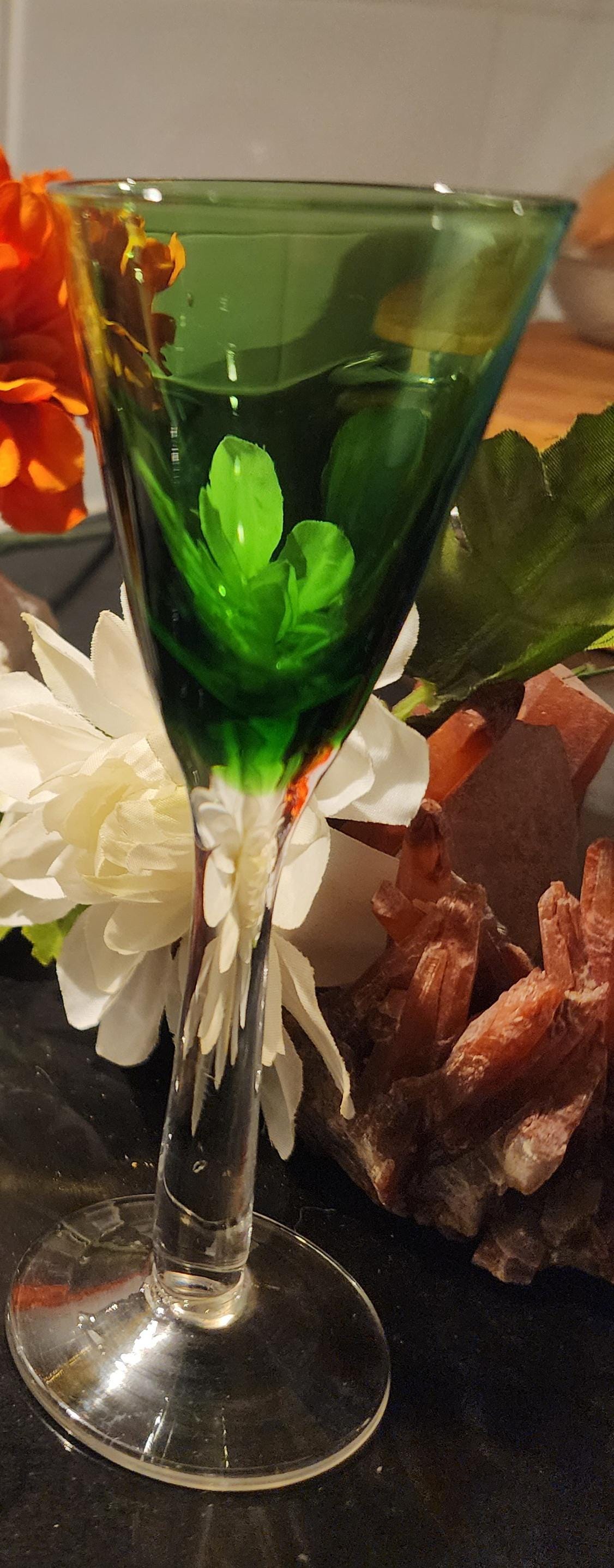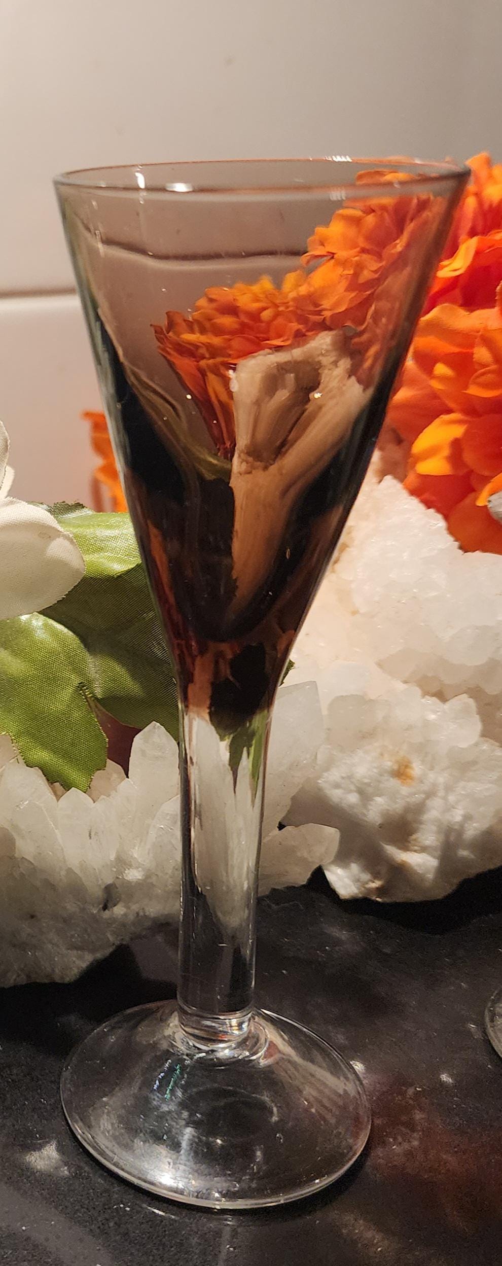 Each of these beautiful vintage cordial glasses has its own unique shape and color tone — no two are exactly alike. Every piece is hand-blown, giving it a slightly different character and glow that adds to its vintage charm.