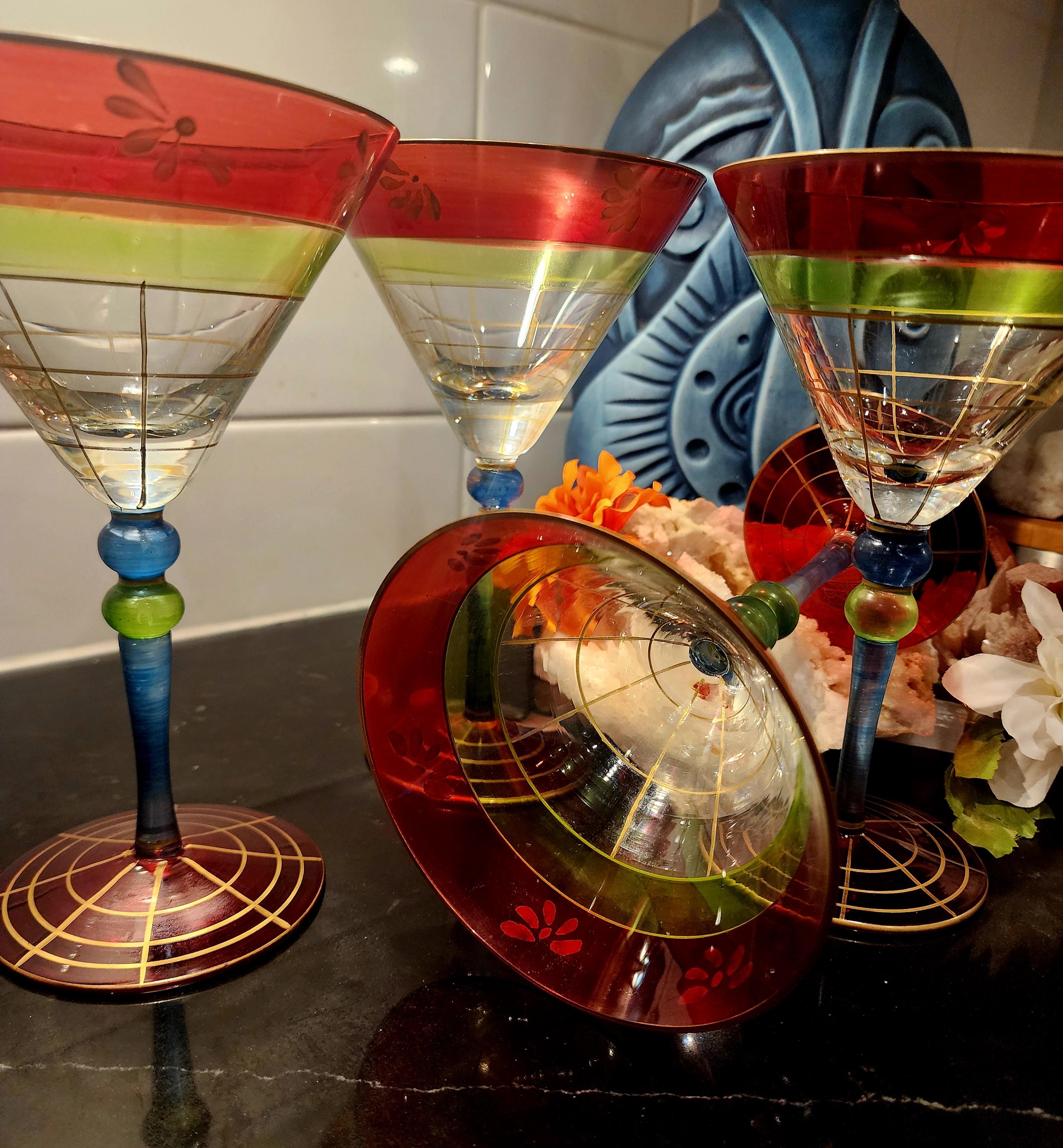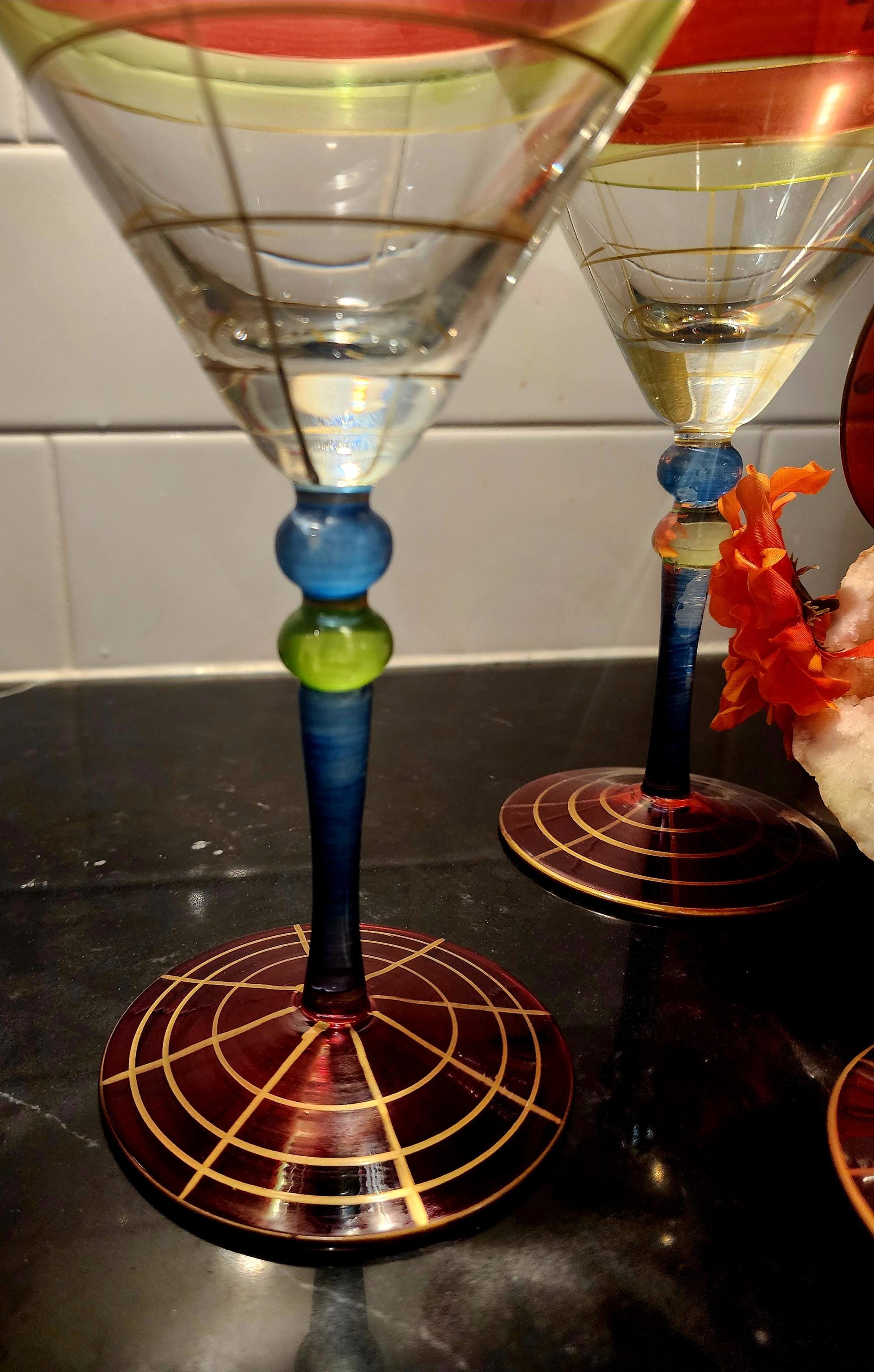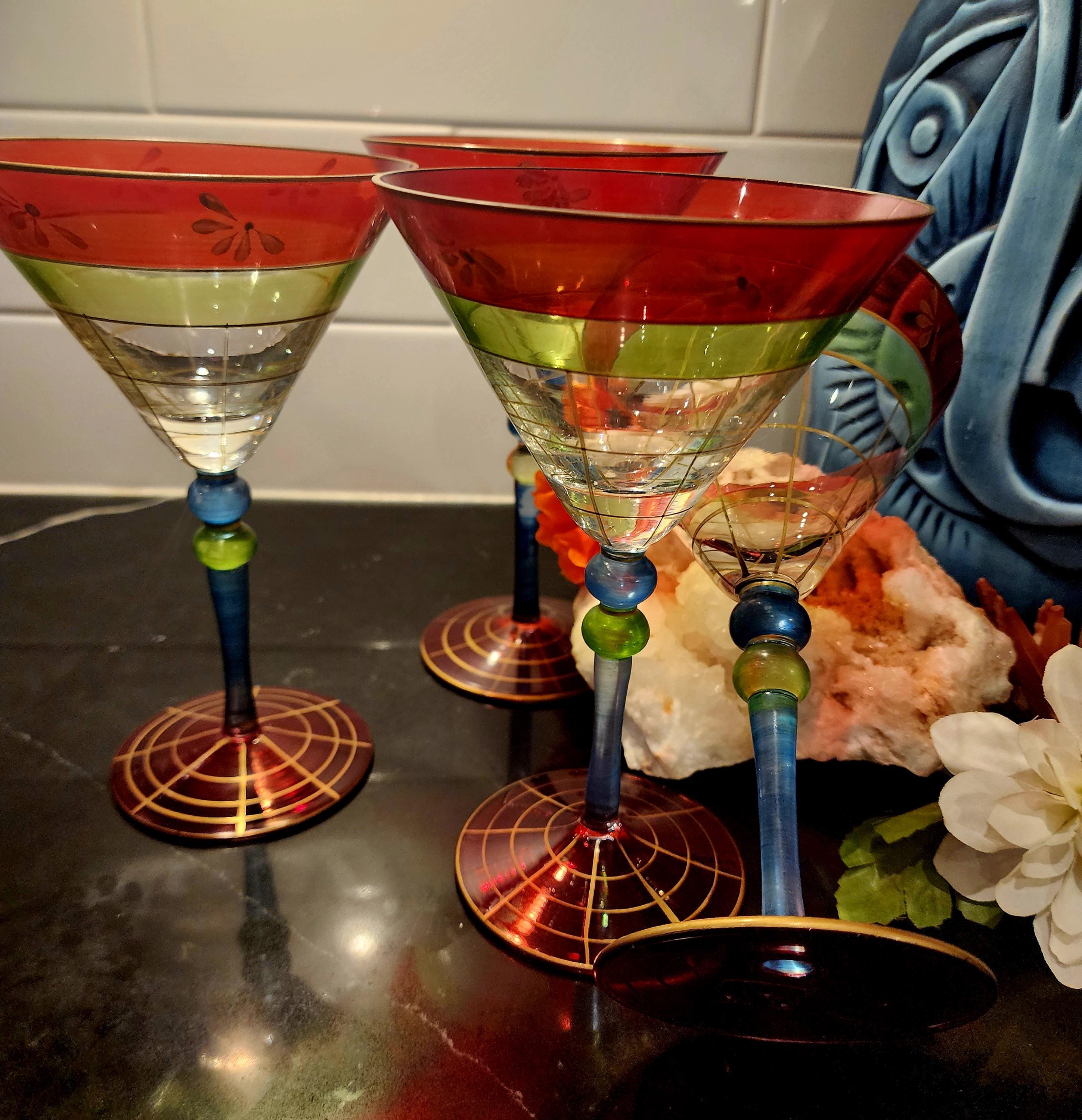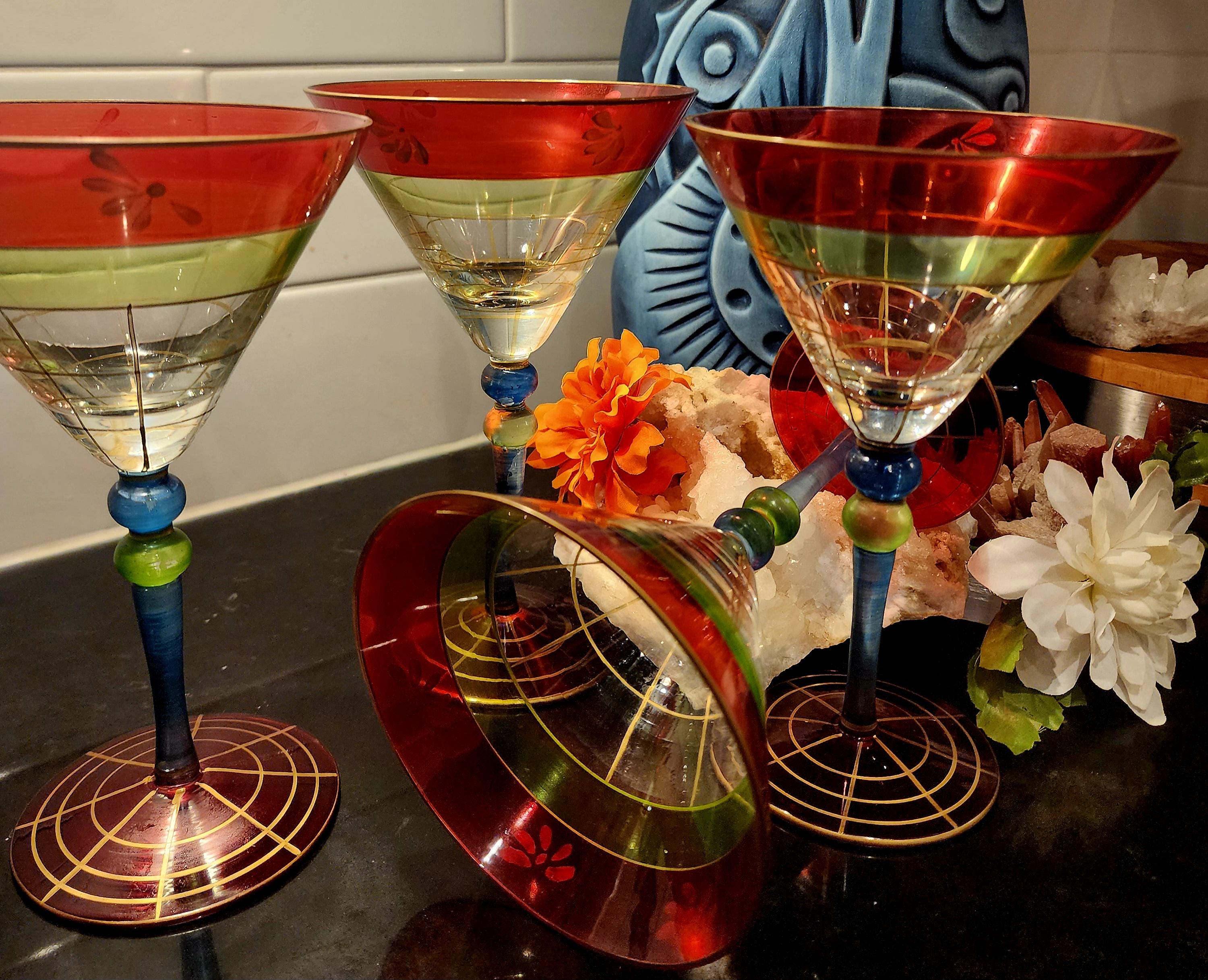 Add bold, artistic style to your barware collection with this beautiful set of 4 Roscher hand-painted martini glasses, a rare and highly collectible design from the late 1990s to early 2000s. Roscher & Co. is known for small-batch, hand-painted stemware with vibrant colour and eye-catching detail — and this set is one of their standout patterns.