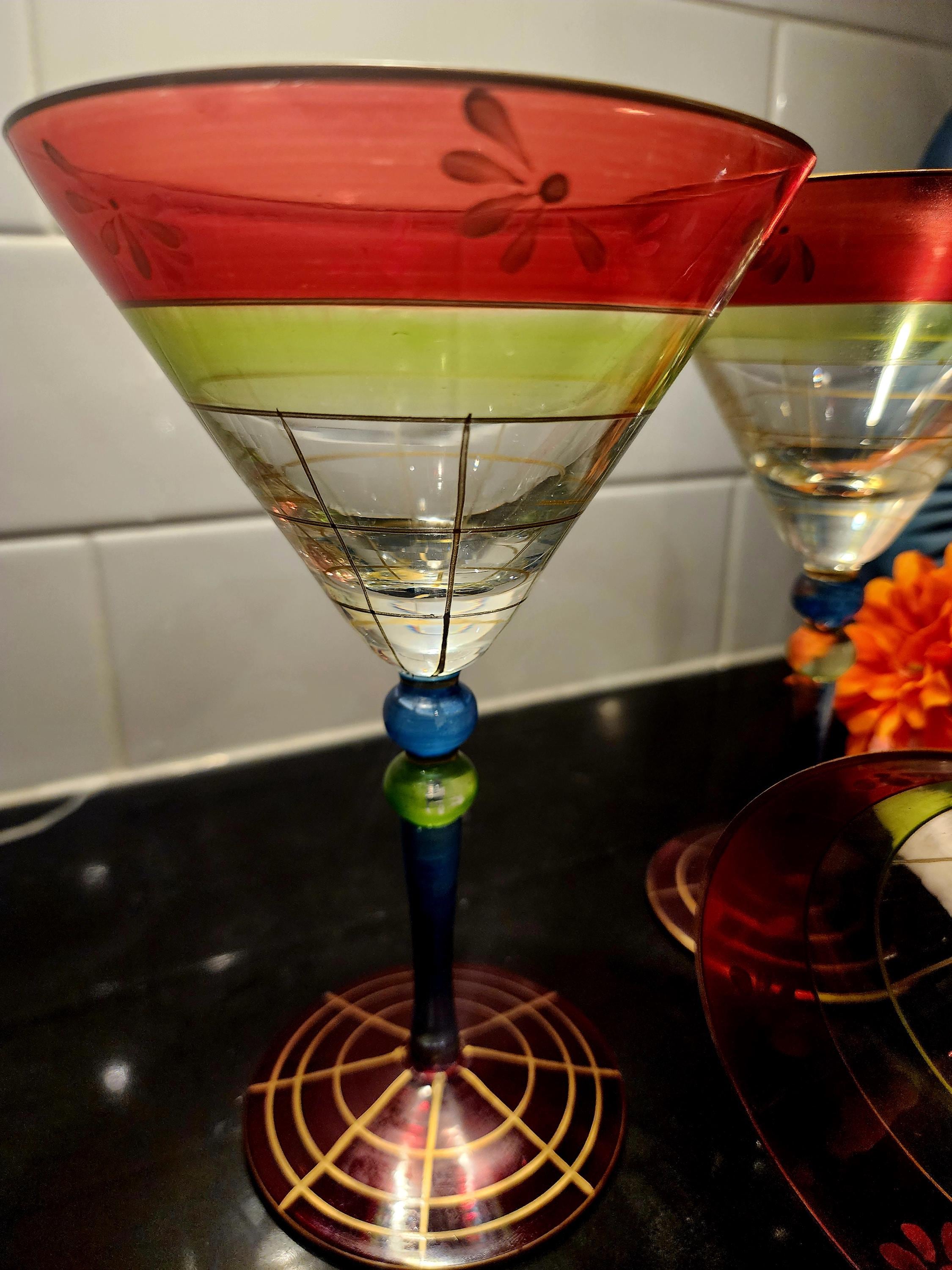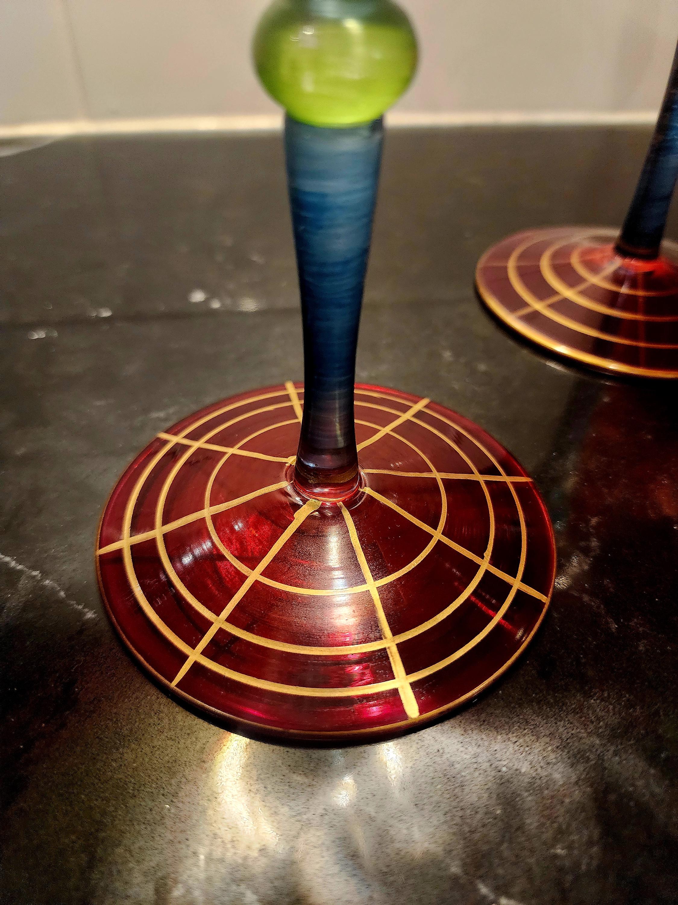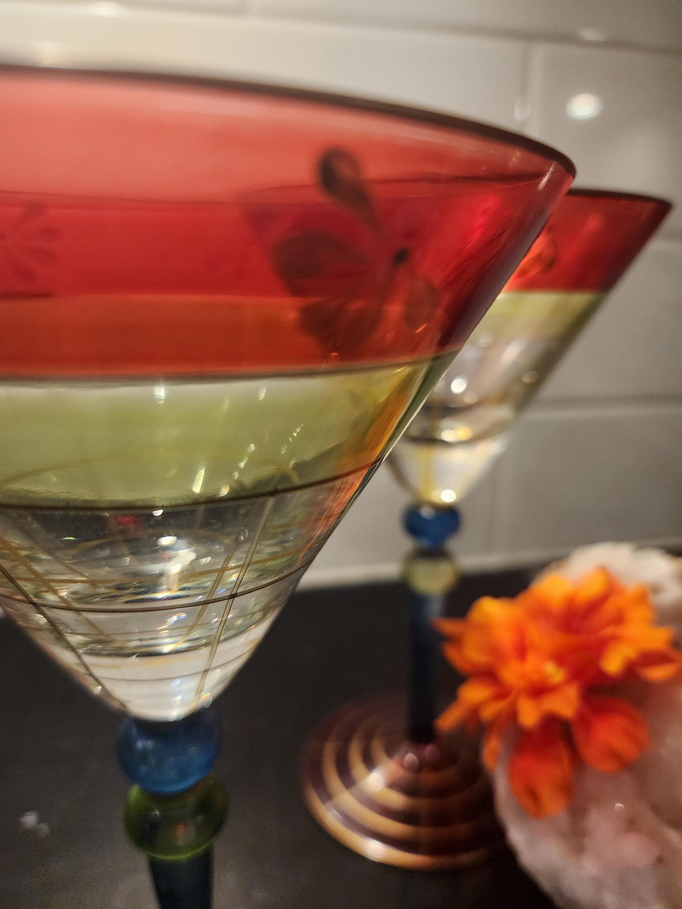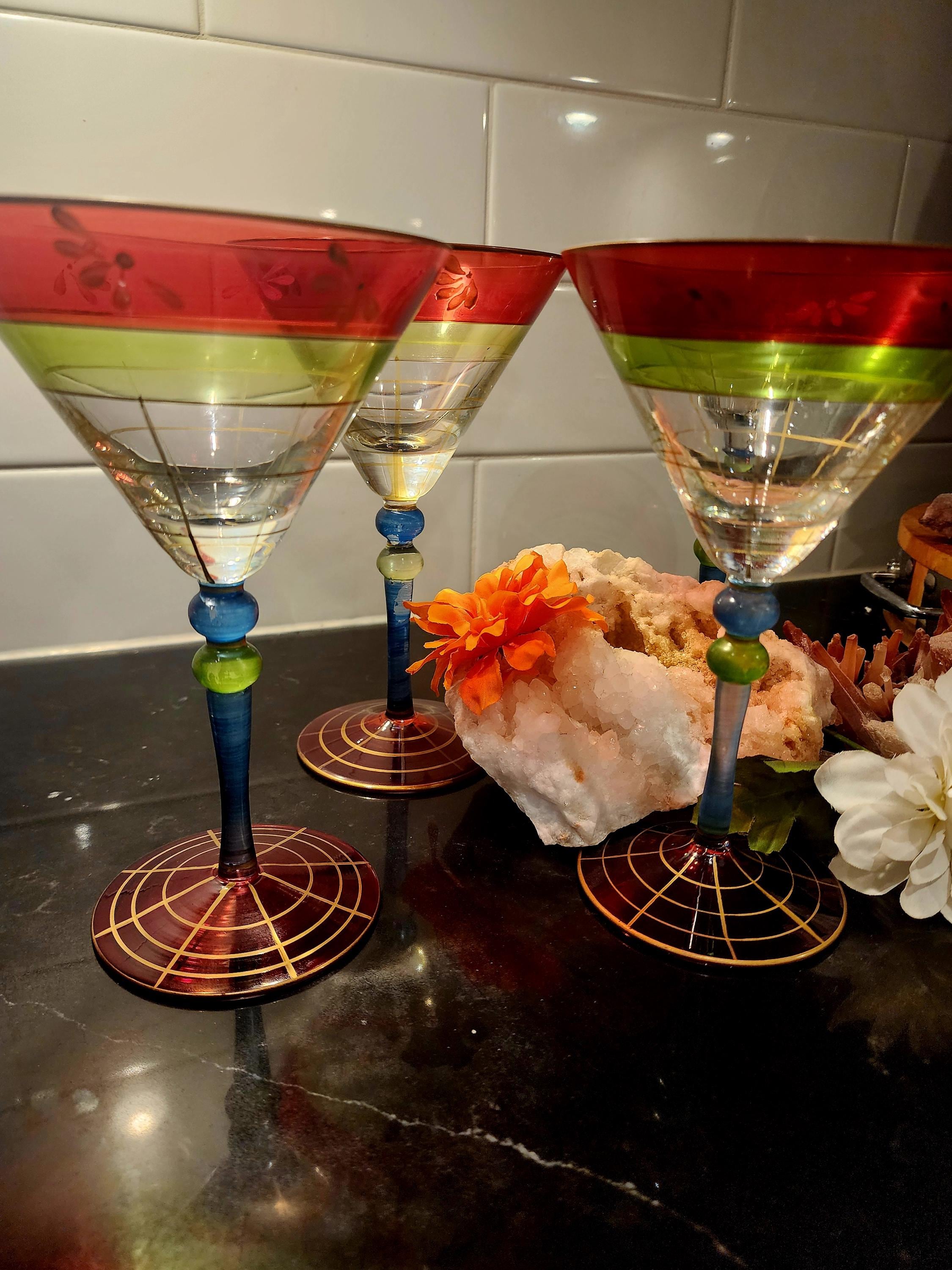 Add bold, artistic style to your barware collection with this beautiful set of 4 Roscher hand-painted martini glasses, a rare and highly collectible design from the late 1990s to early 2000s. Roscher & Co. is known for small-batch, hand-painted stemware with vibrant colour and eye-catching detail — and this set is one of their standout patterns.