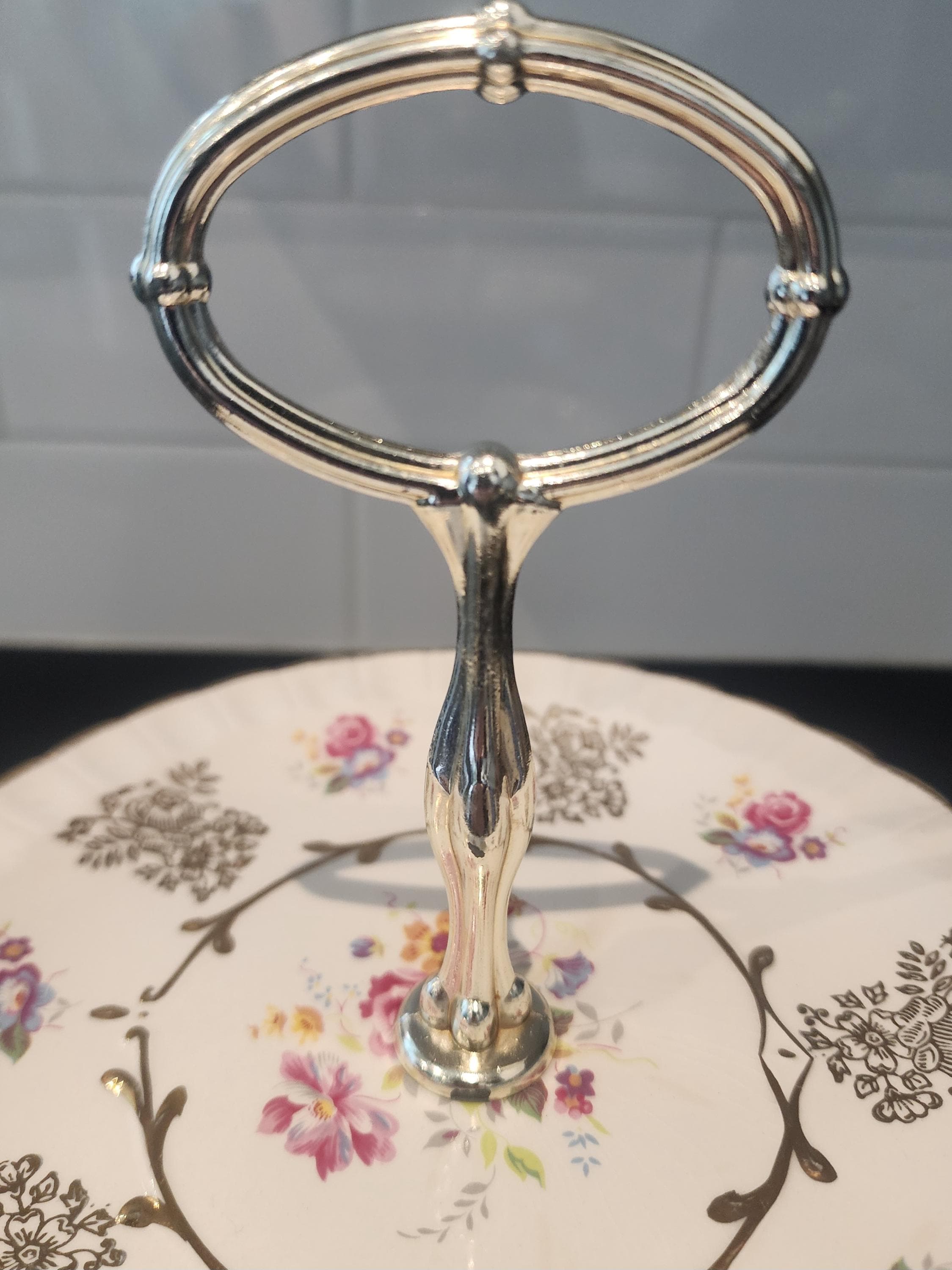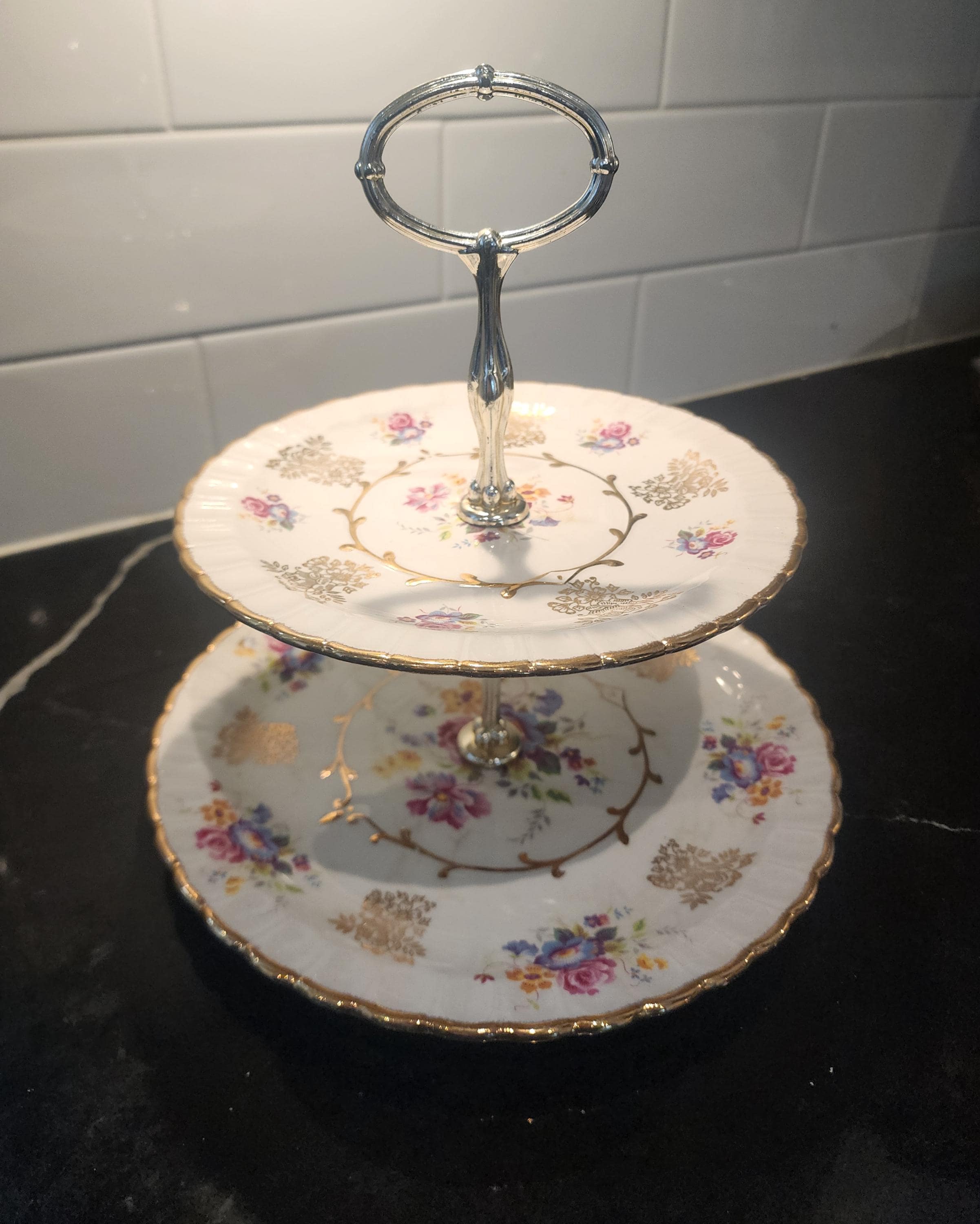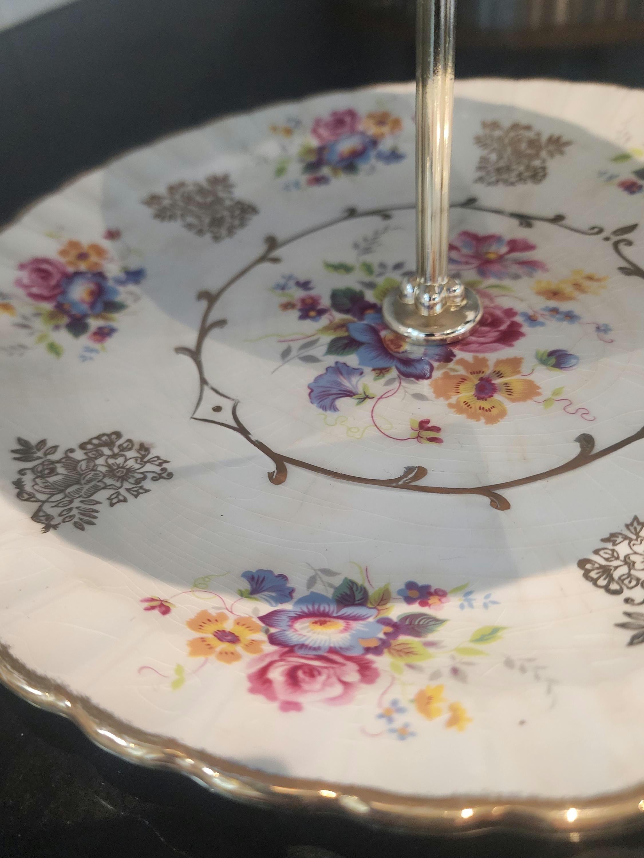 This premium piece features vibrant English florals, antique gold trim, and naturally aged vintage crazing that collectors love. Each tier is securely assembled with classic metal hardware, turning two matching plates into a charming display piece for desserts, cookies, cupcakes, pastries, fruit, or even jewelry.