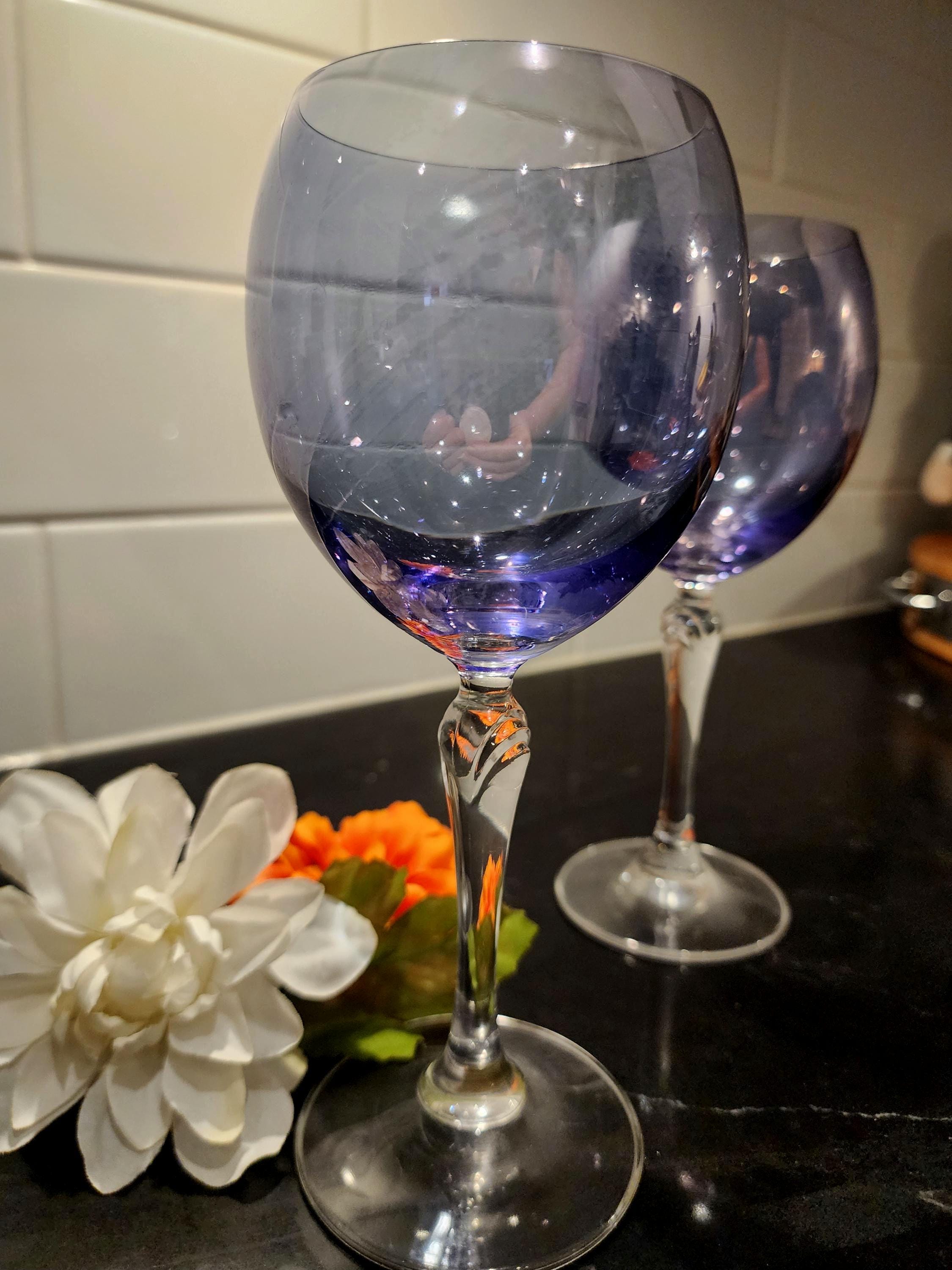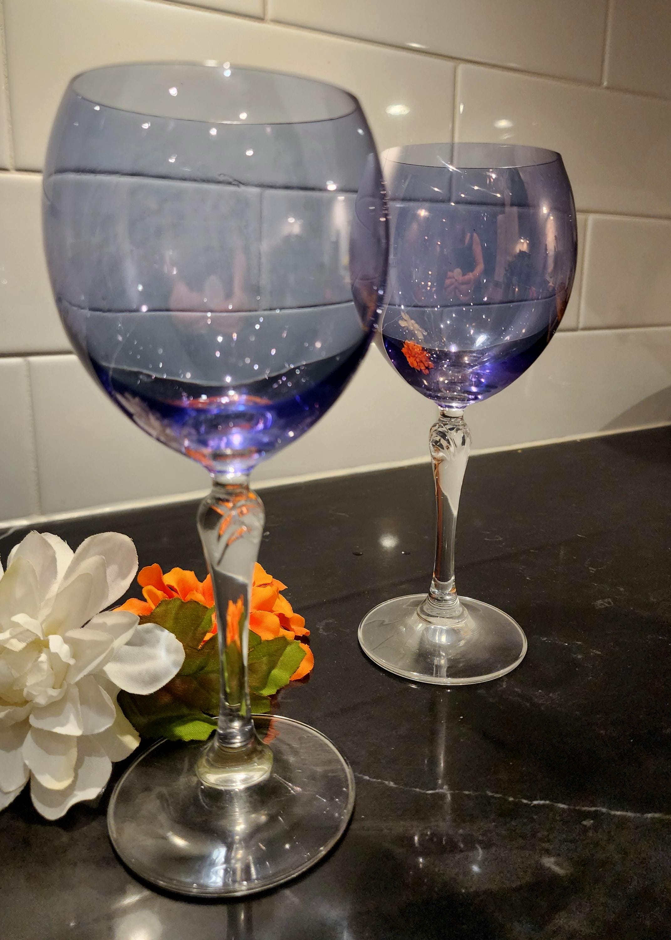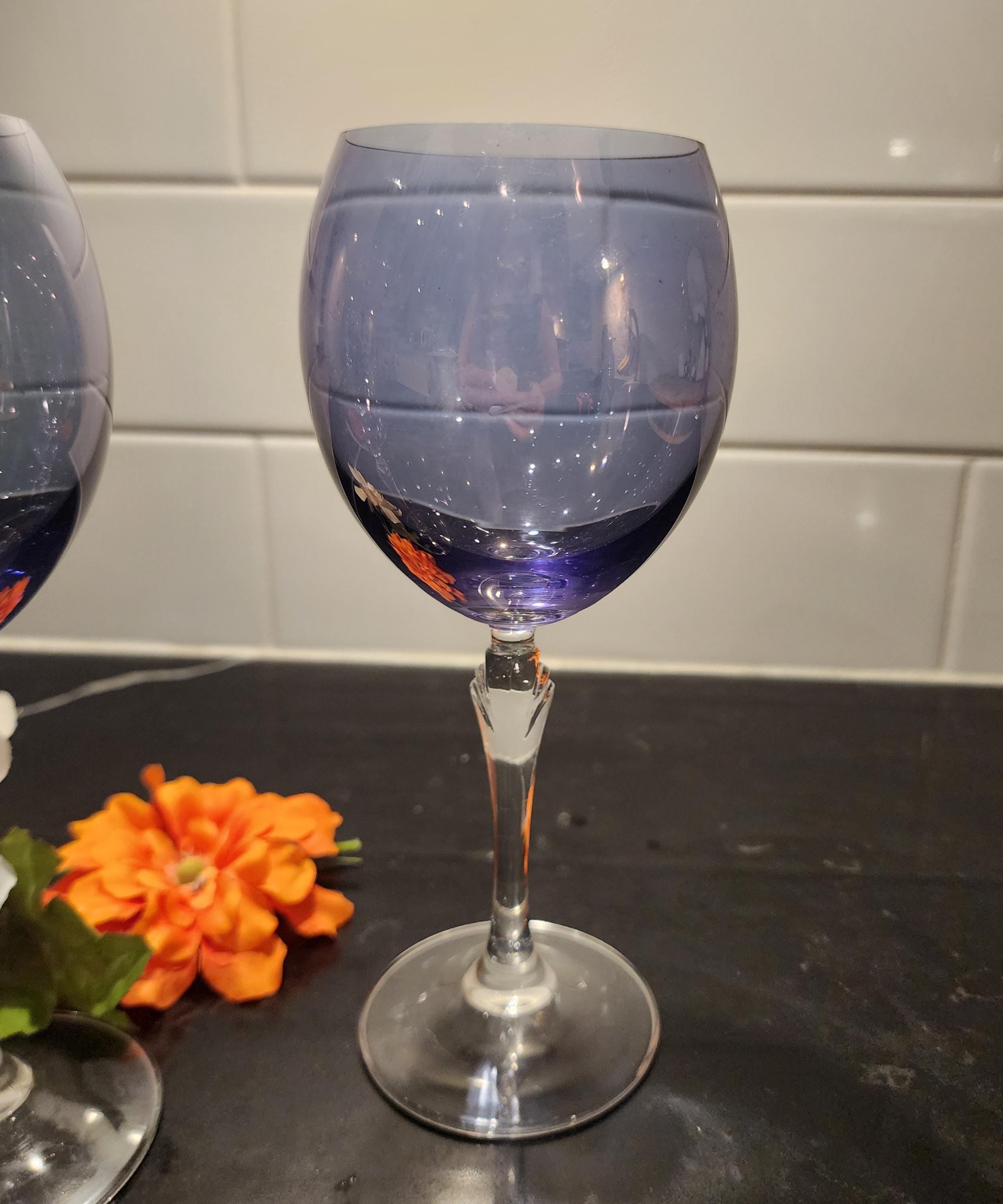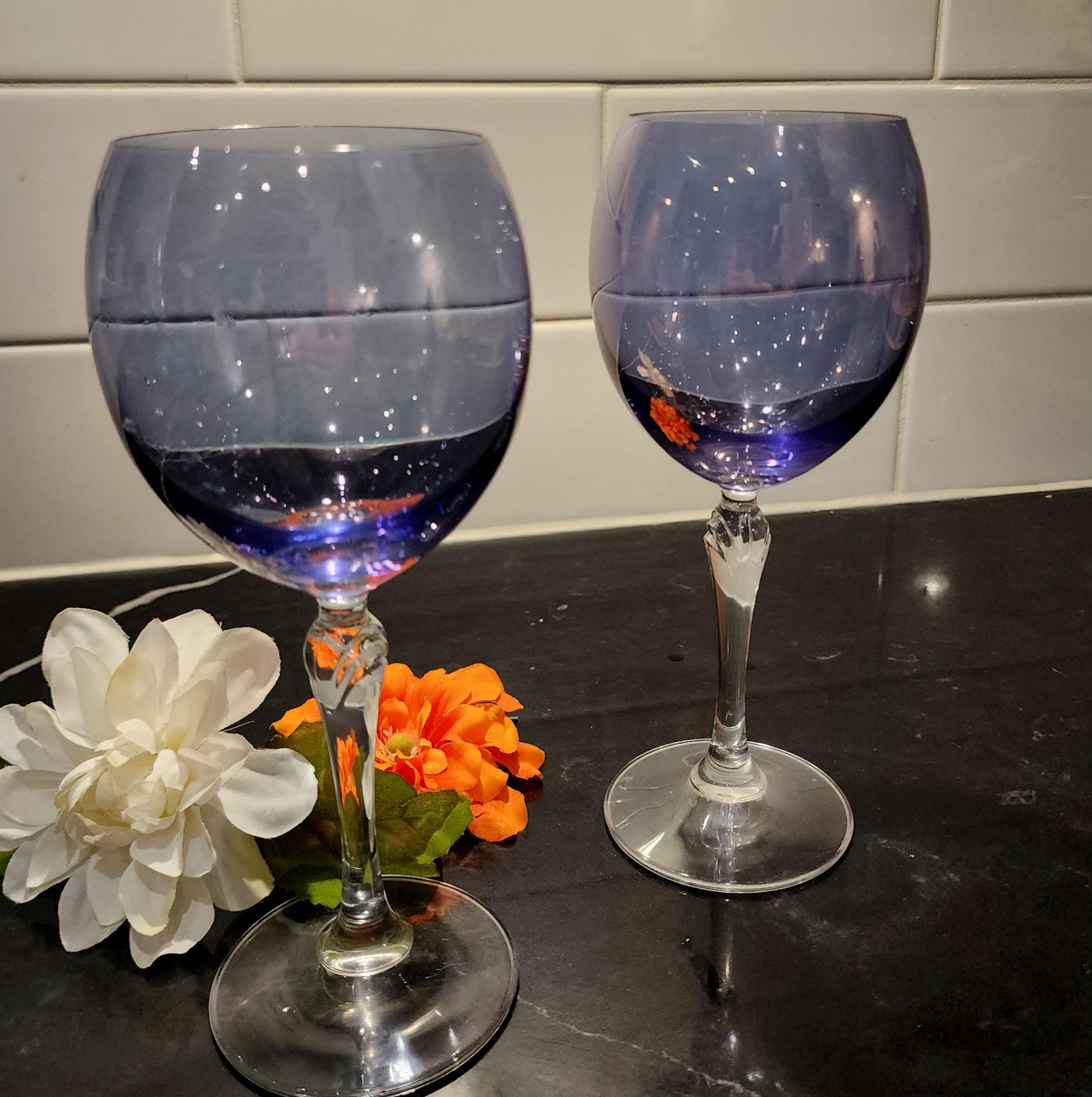 Elevate your glassware collection with this luxurious pair of handblown amethyst wine glasses, crafted with stunning clarity and artistic detail. Each goblet features a soft purple tint that deepens toward the base, catching the light with a warm, elegant glow.