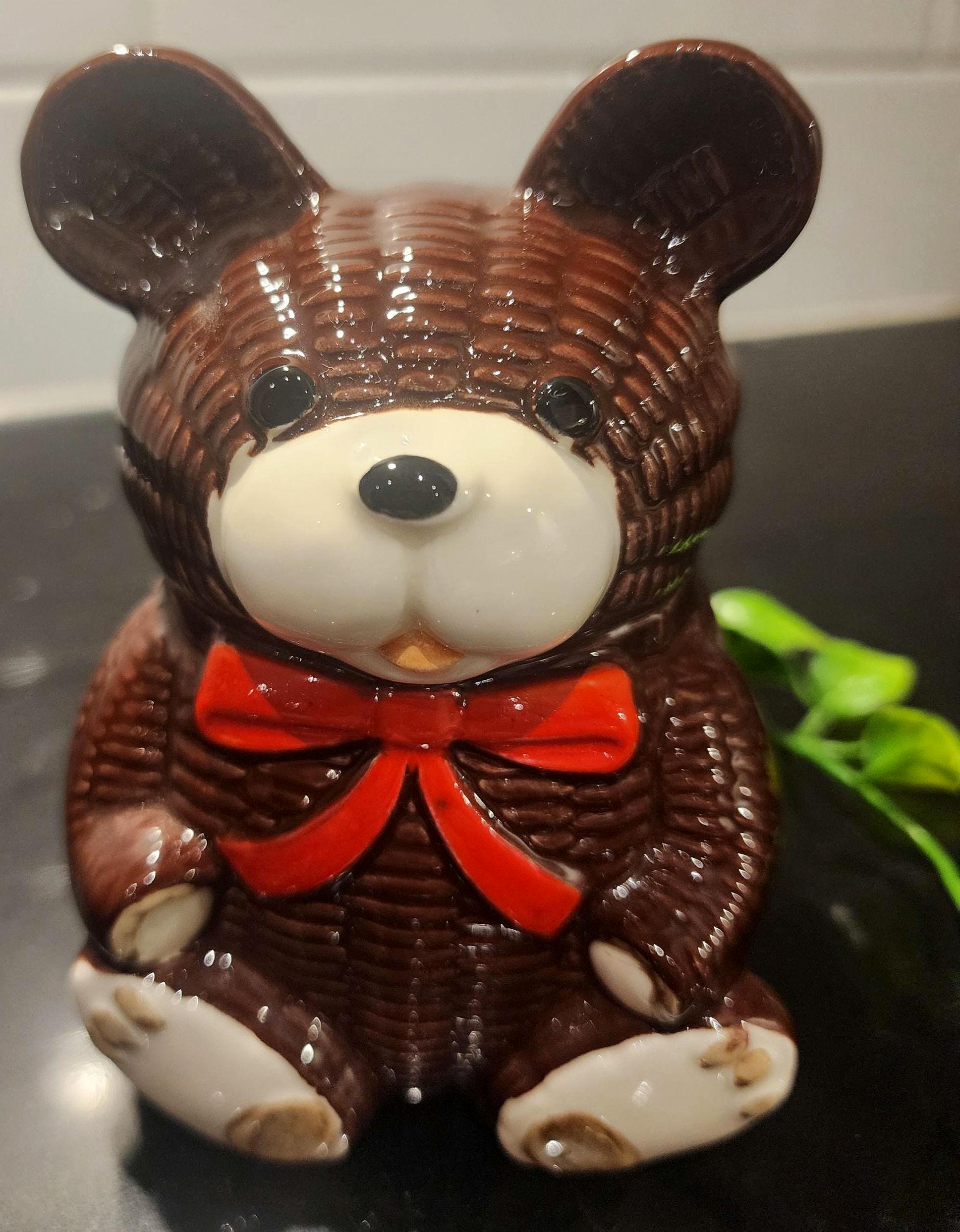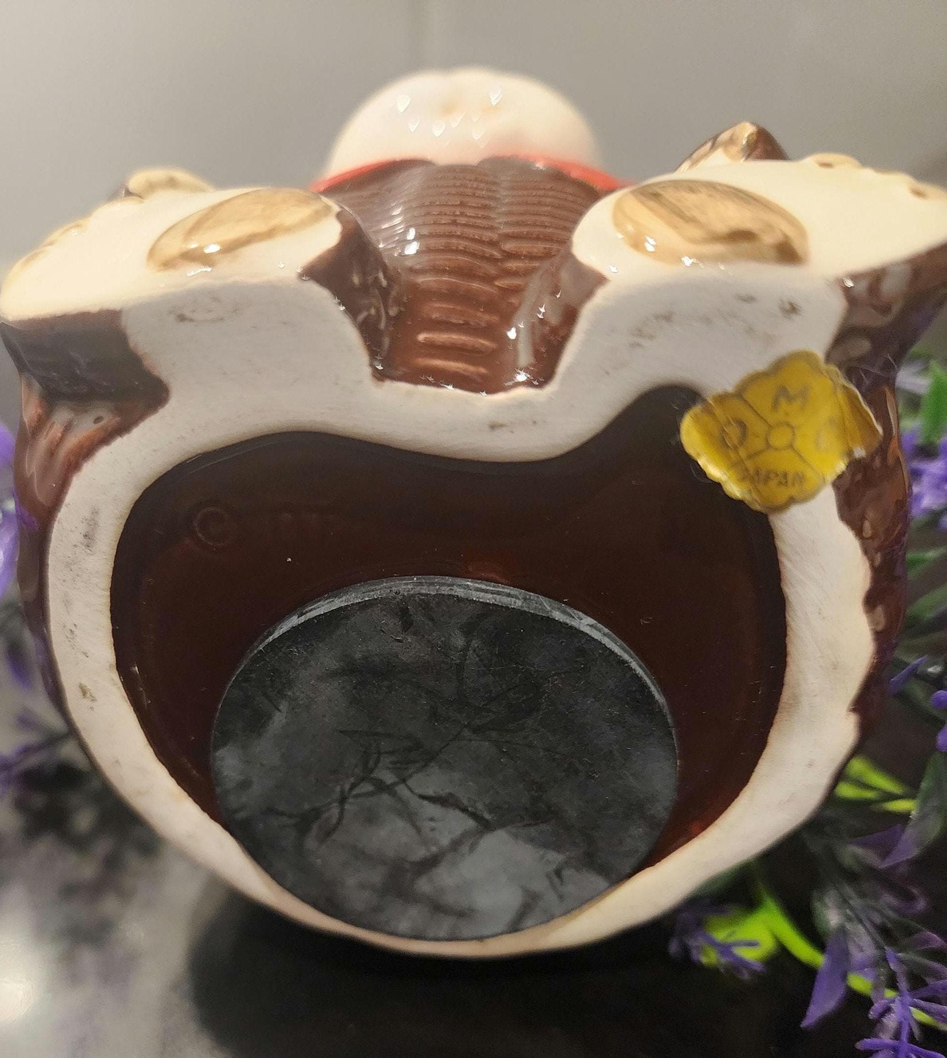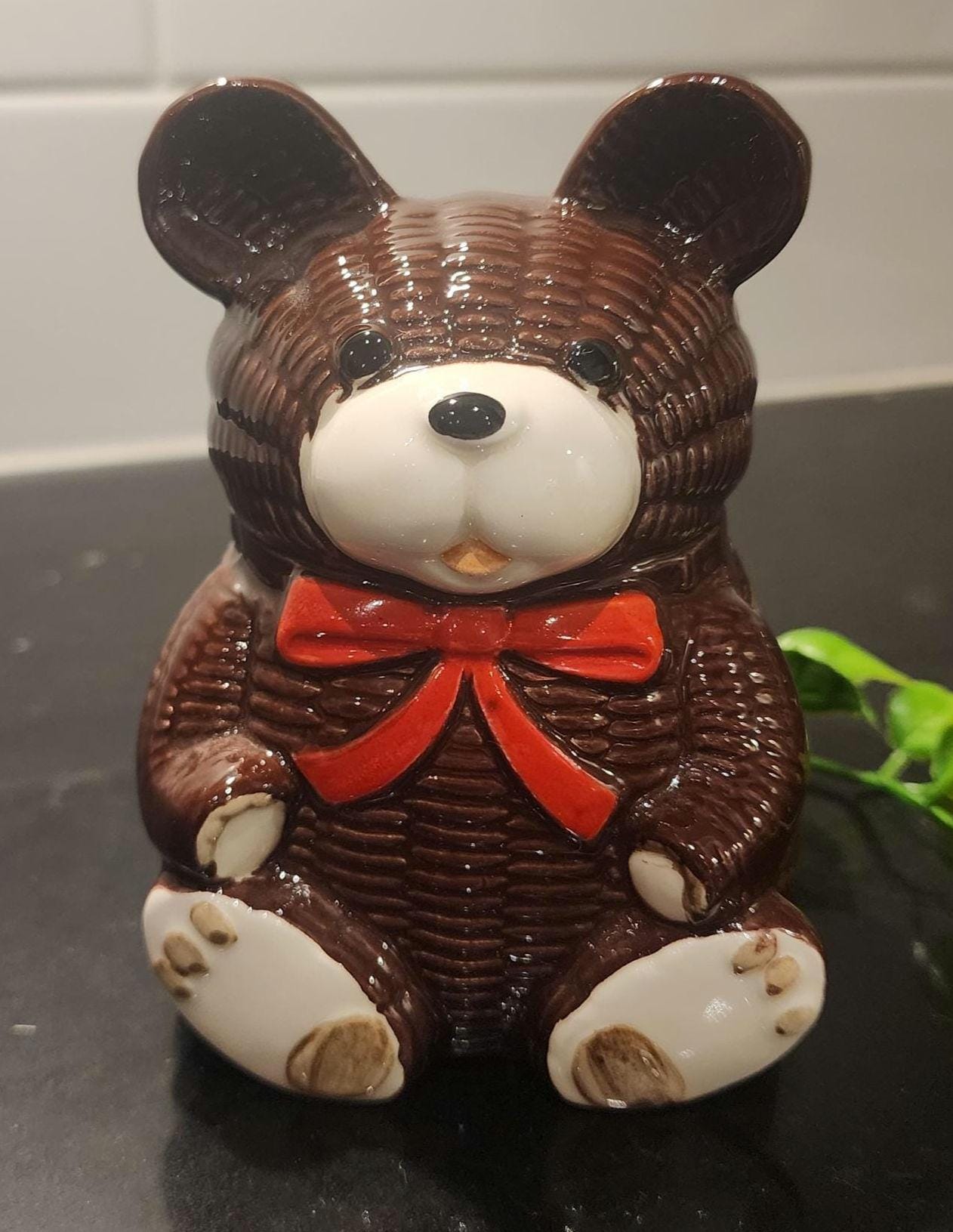 Add a touch of retro charm to your shelf with this adorable vintage D.M.C. Japan ceramic teddy bear coin bank. Hand-painted and glossy, this little guy features expressive details, a bright red bow, and that classic mid-century Japan style collectors love.