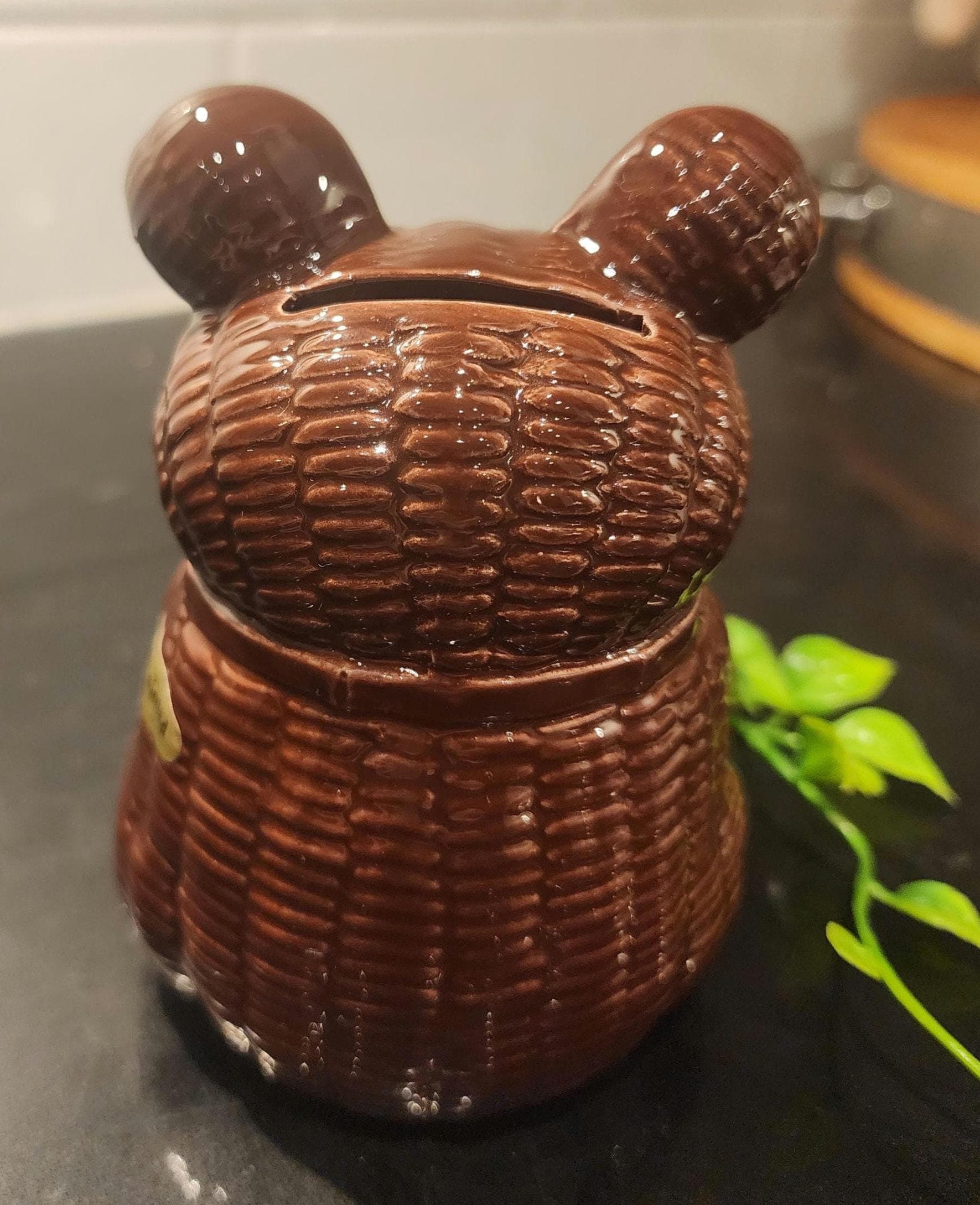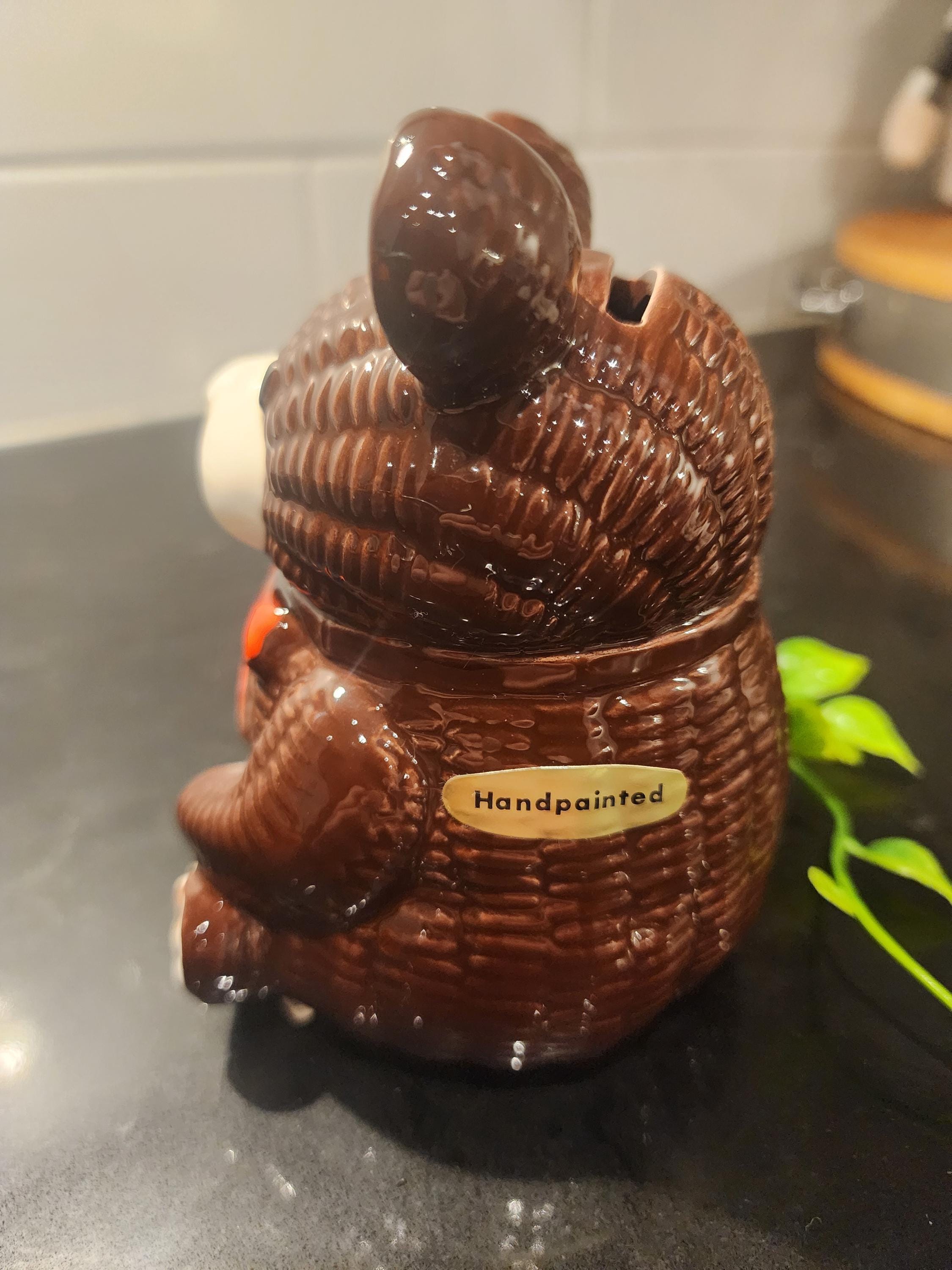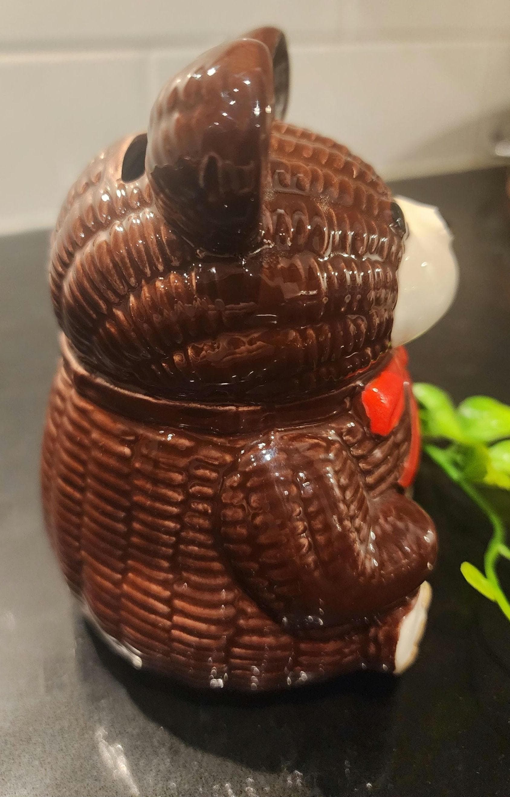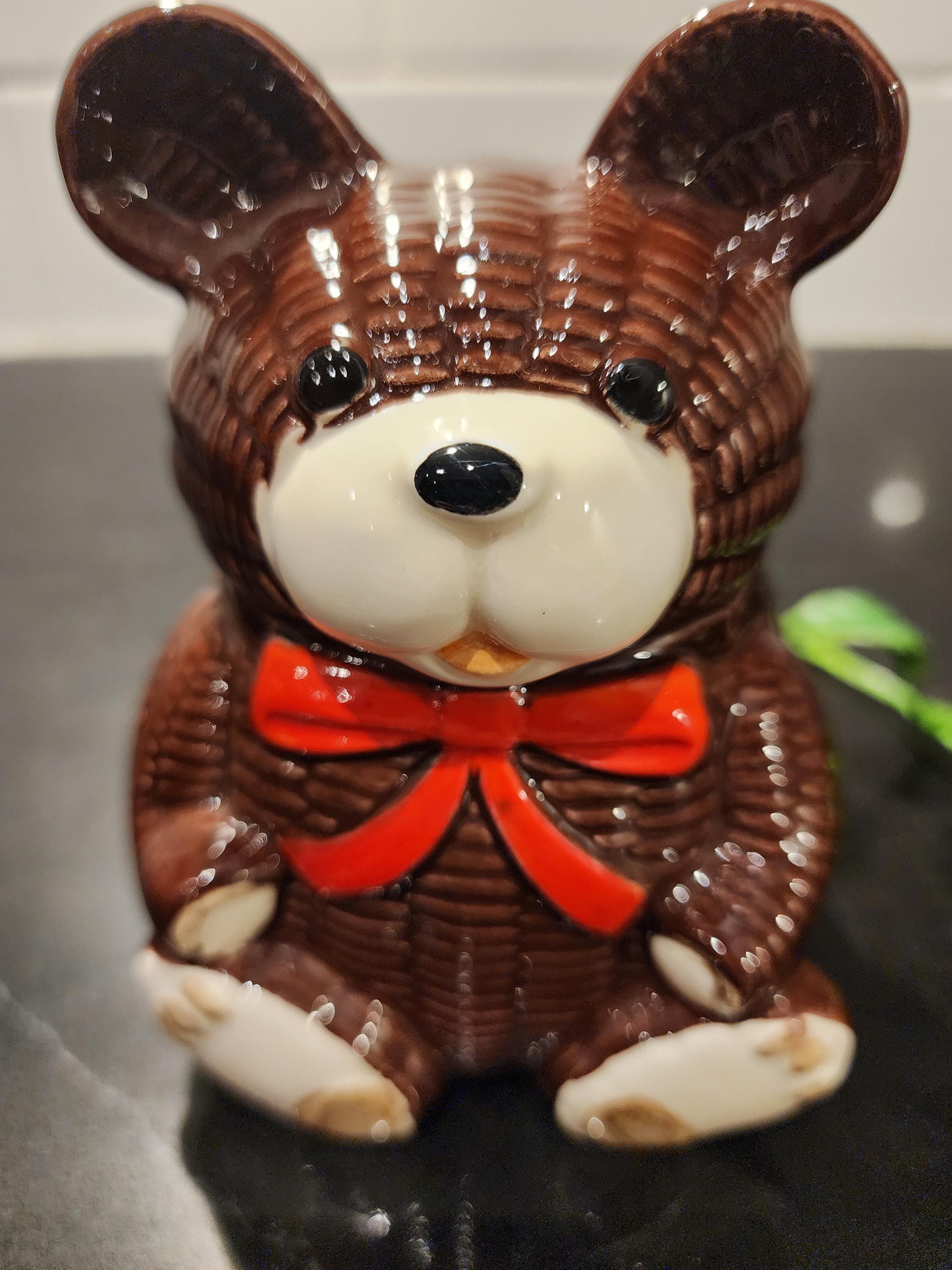 Add a touch of retro charm to your shelf with this adorable vintage D.M.C. Japan ceramic teddy bear coin bank. Hand-painted and glossy, this little guy features expressive details, a bright red bow, and that classic mid-century Japan style collectors love.