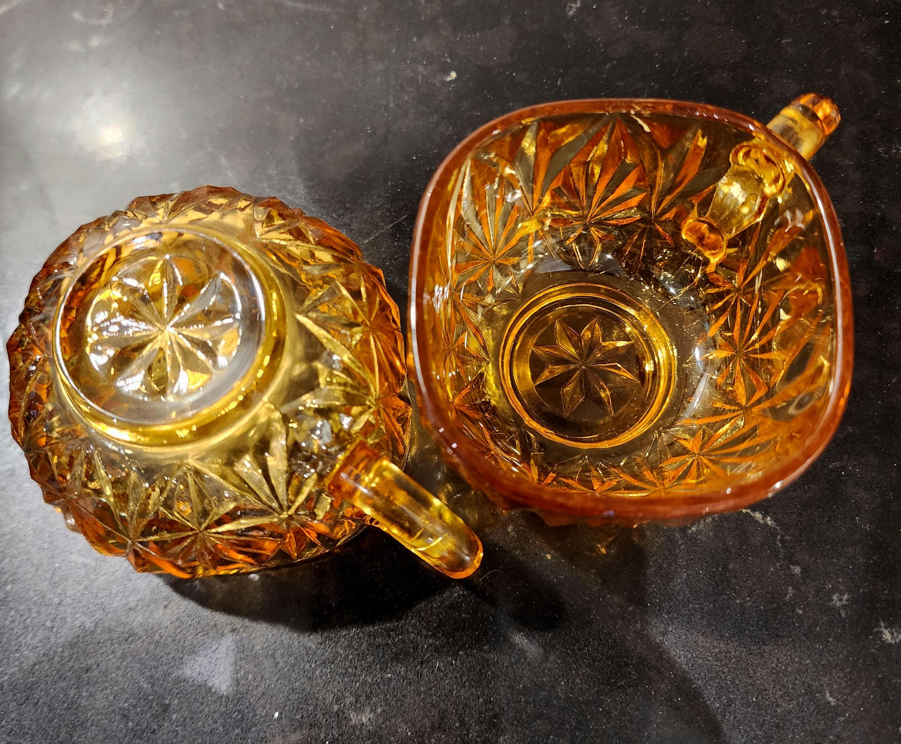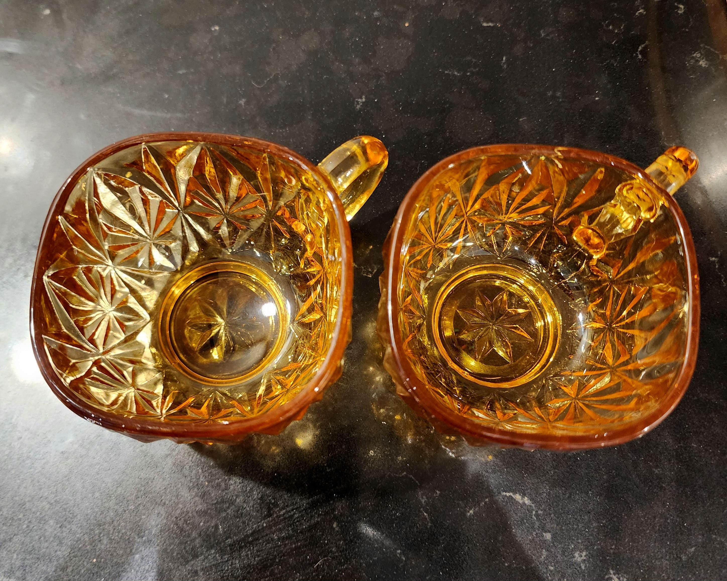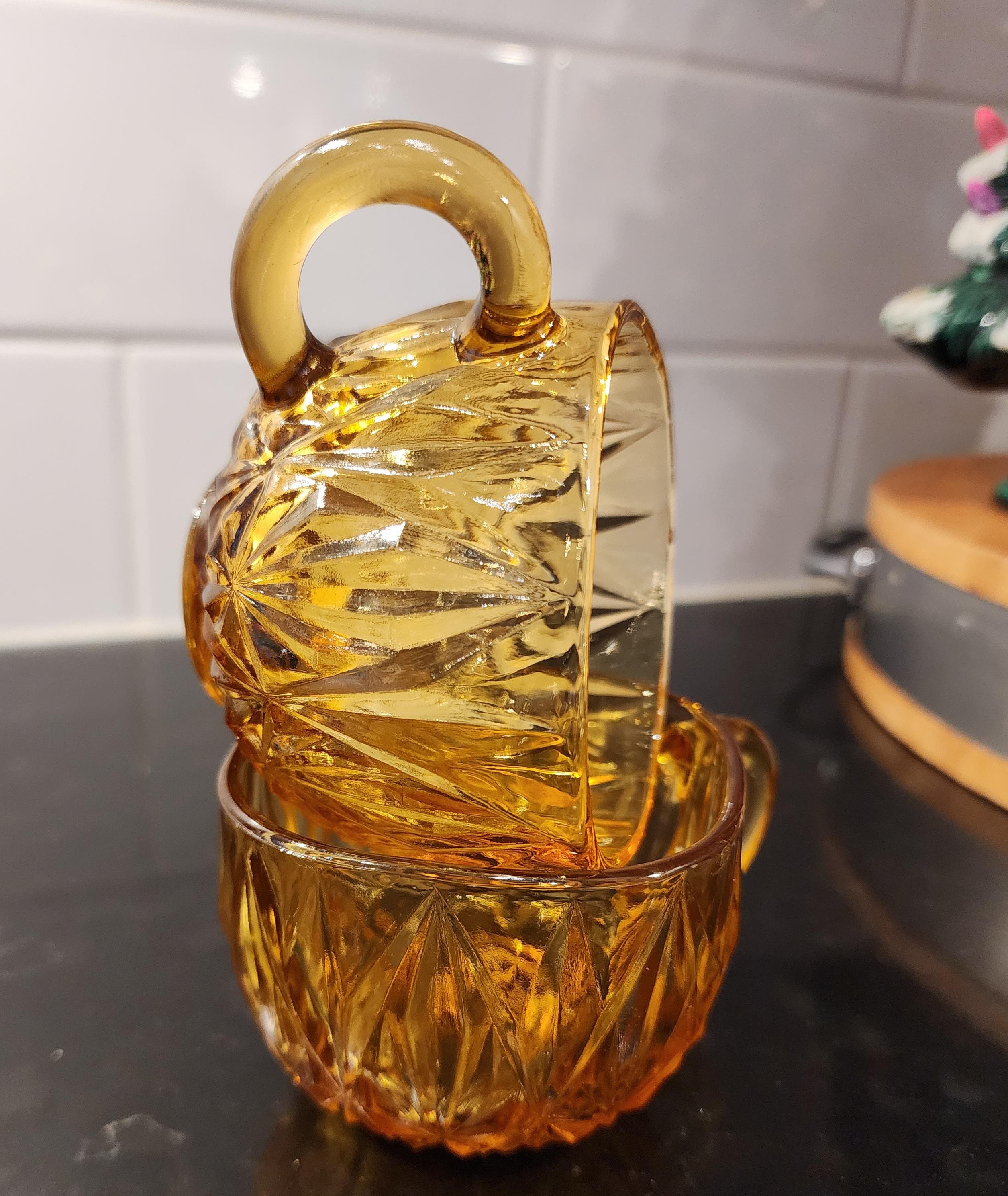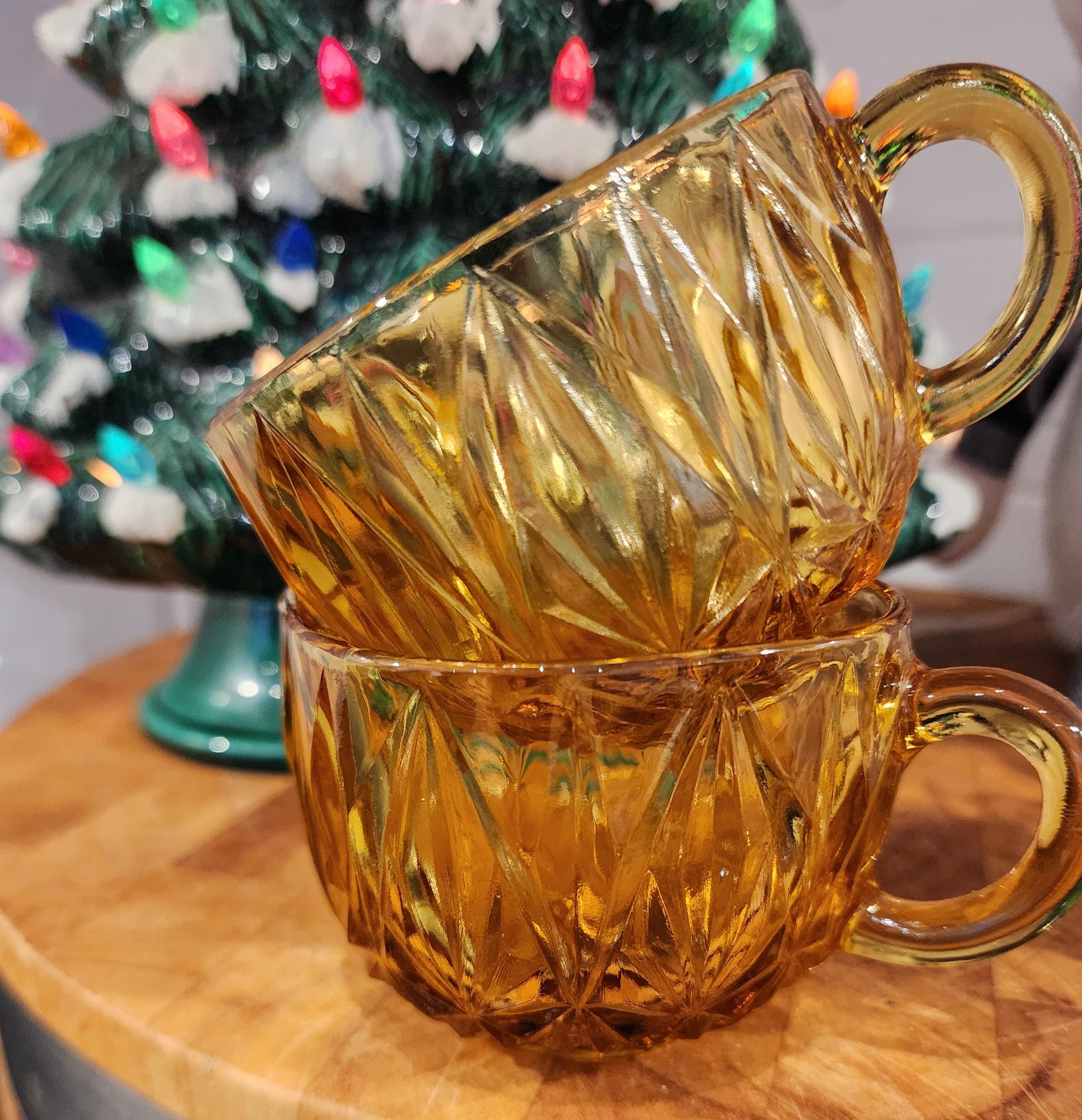 Add warm mid-century charm to your home with this beautiful pair of vintage amber pressed-glass cups, crafted in a rich honey-gold tone and featuring a bold diamond cut pattern with classic starburst bases. The thick glass walls and rounded handles are characteristic of late 1960s–1970s Williamsport Glass Co. style—a popular American maker known for high-quality amberware.