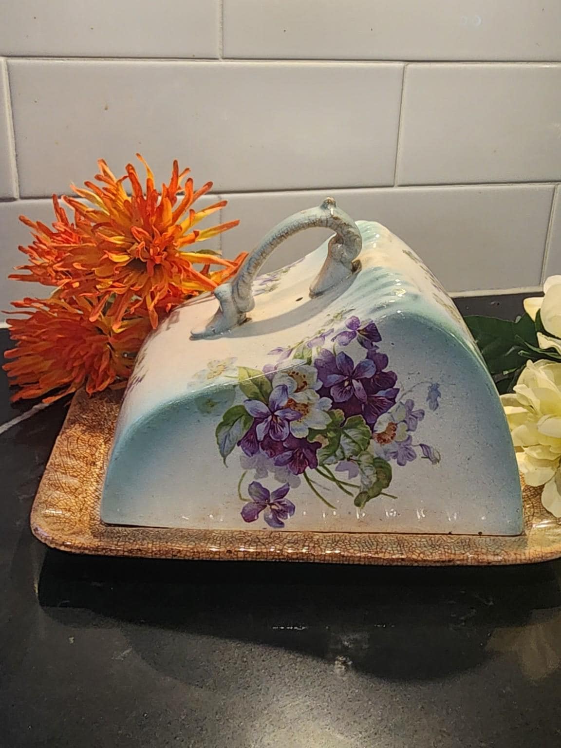 There is something timeless about antique kitchenware — especially pieces that have survived over a century with their original components intact. This antique early 20th century crackle glaze butter dish with matching underplate is a beautiful example of functional art pottery from the 1900s.